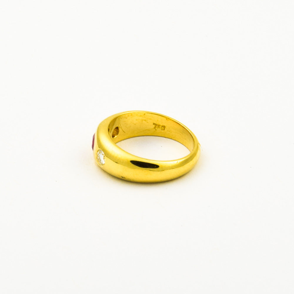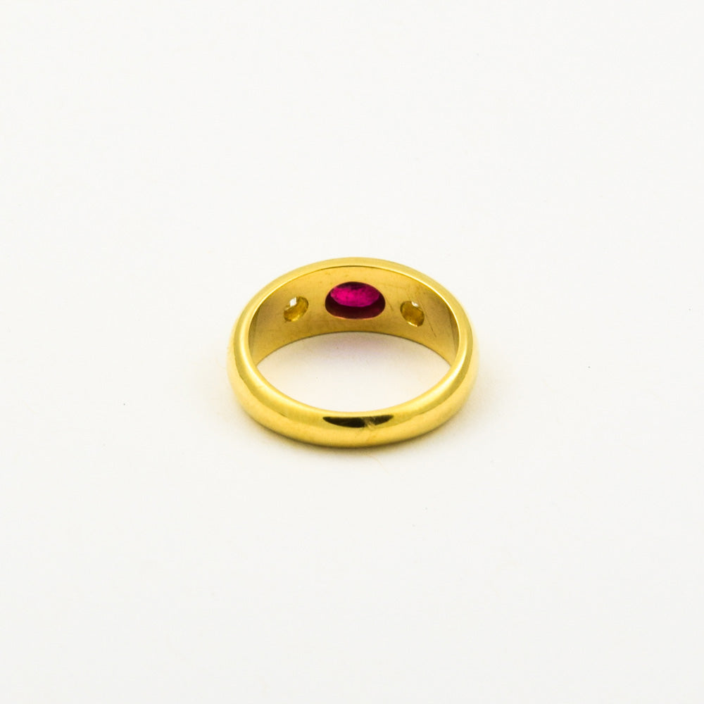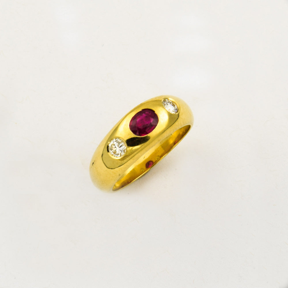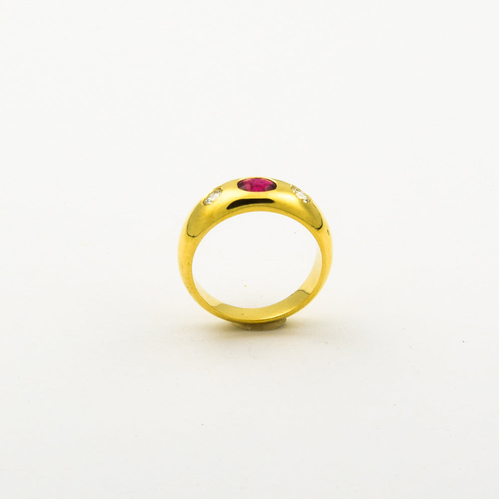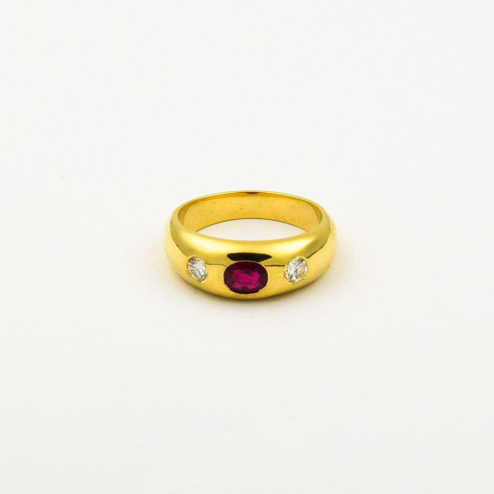 Bei dem Schmuckstück handelt es sich um einen neuwertigen Bandring aus 750 Gelbgold mit einem Rubin von ca. 0,37 ct und zwei Brillanten von zusammen ca. 0,18 ct in der Qualität feines Weiß mit sehr kleinen Einschlüssen (TW/vs).