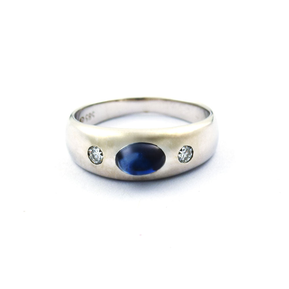 Bei dem Schmuckstück handelt es sich um einen Bandring aus 585 Weißgold mit einem Saphircabochon und zwei Brillanten von zusammen ca. 0,1 ct in der Qualität Weiß und piqué 1 (W/p 1).