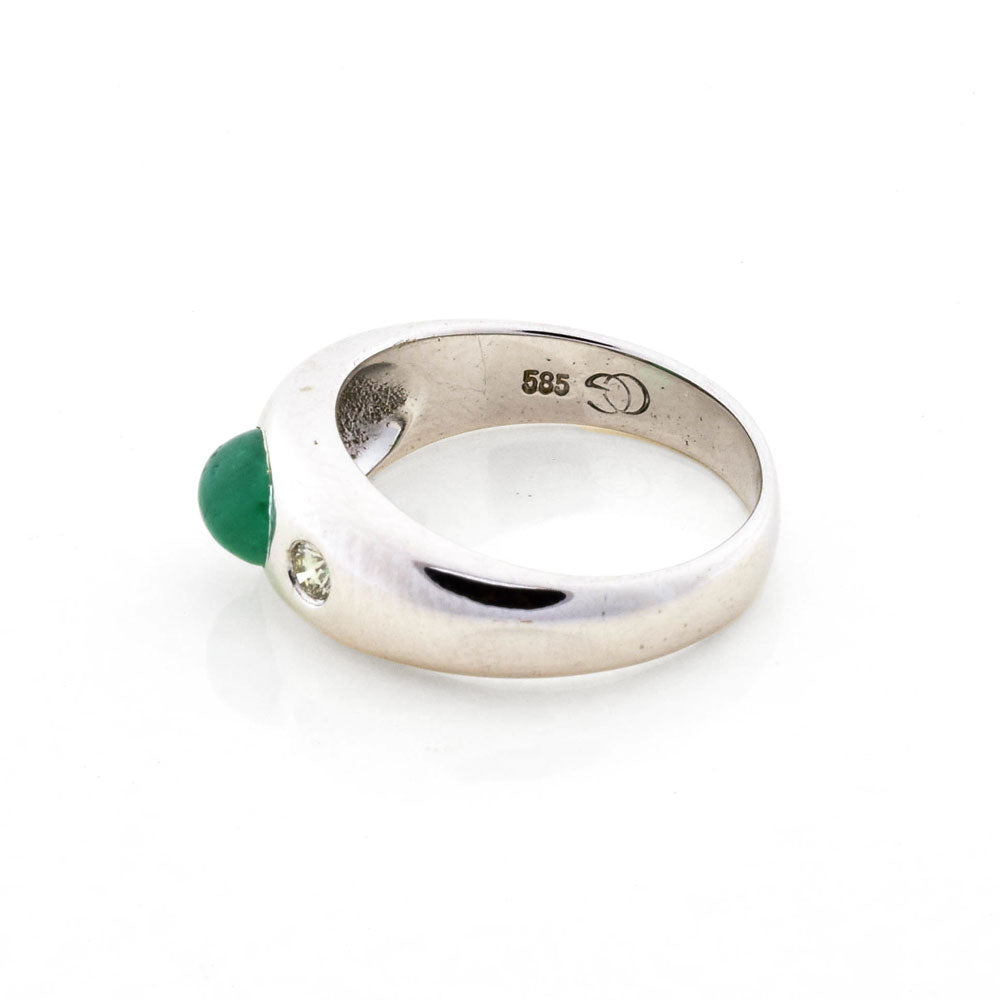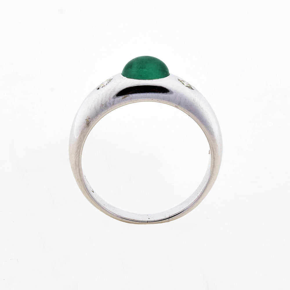 Bei dem Schmuckstück handelt es sich um einen Bandring aus 585 Weißgold mit einem Smaragdcabochon und zwei Brillanten von zusammen ca. 0,08 ct in der Qualität Weiß mit kleinen Einschlüssen (W/si).