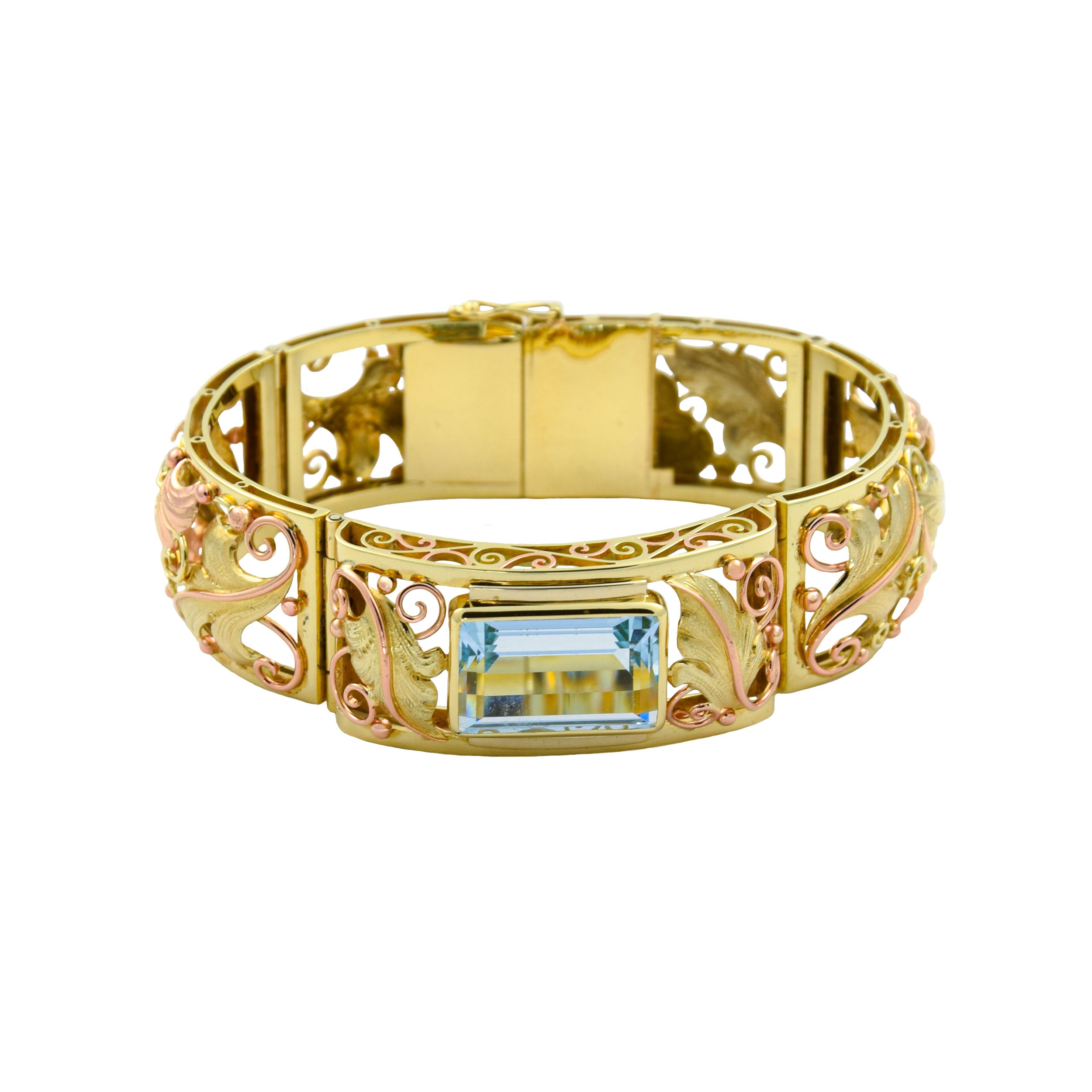Bei dem Schmuckstück handelt es sich um ein in Handarbeit gefertigtes Armband aus 585 Gelb- und Roségold mit 1 Aquamarin von ca. 14,5 ct. Das Schmuckstück hat eine Gesamtlänge von 18,5 cm.