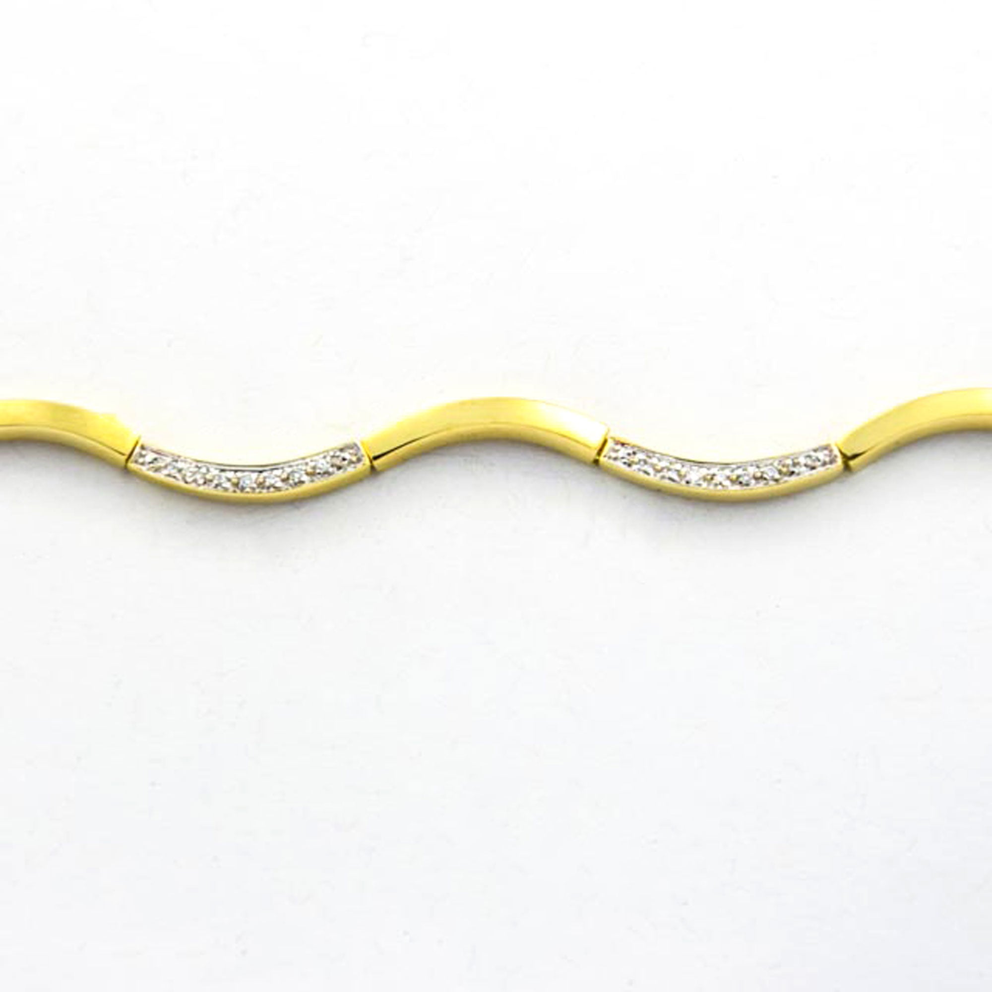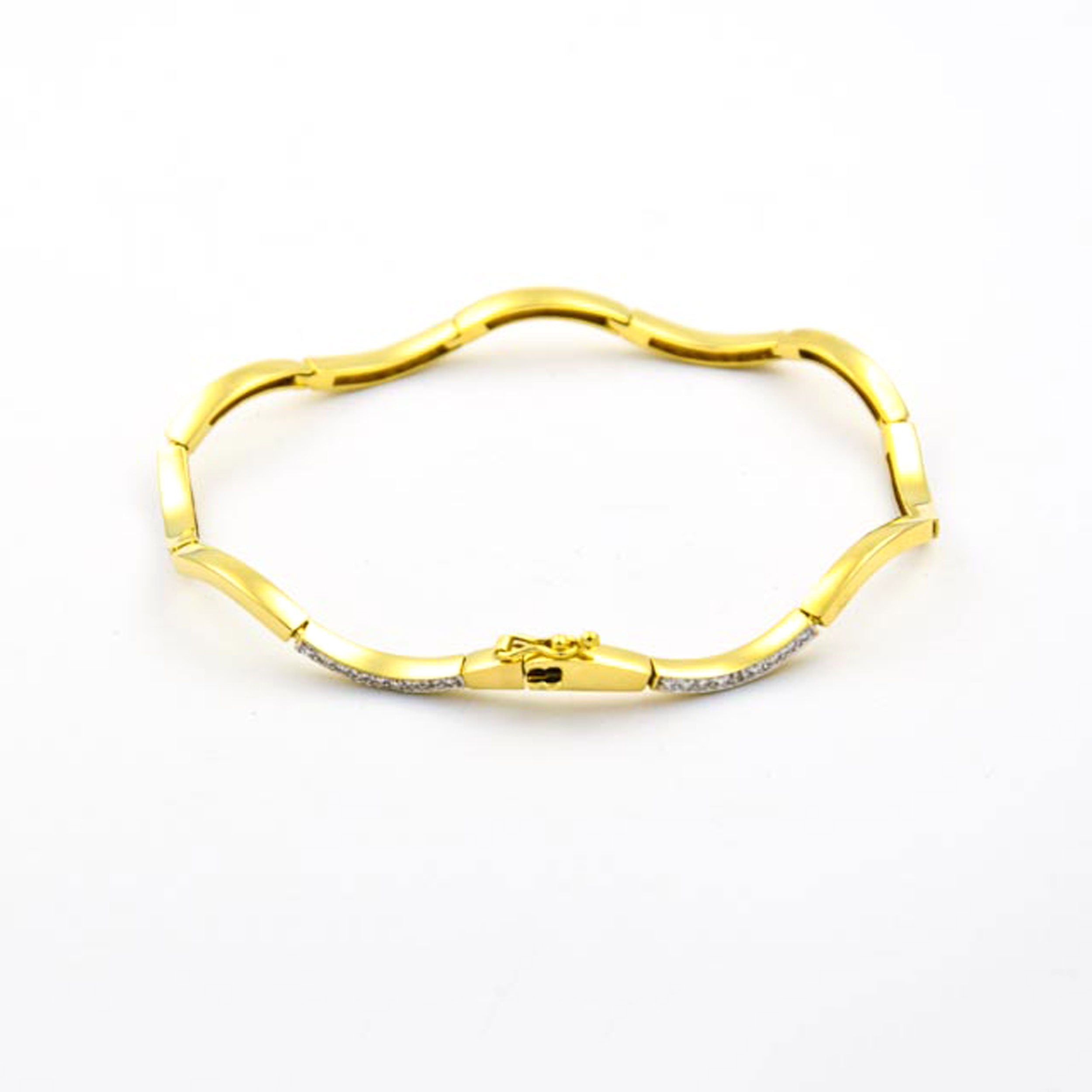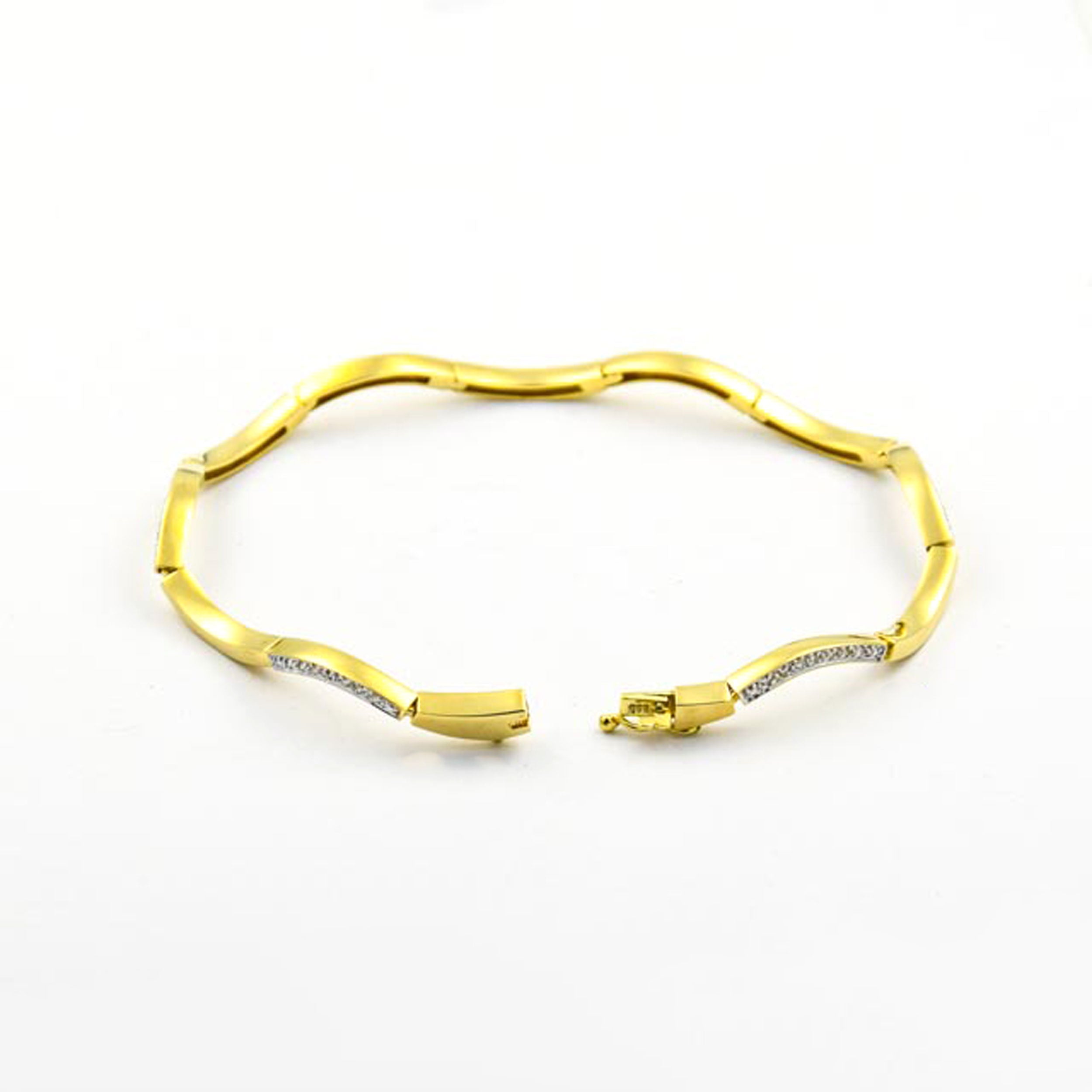Bei dem Schmuckstück handelt es sich um ein Armband aus 585 Gelb- und Weißgold mit 42 Brillanten von zusammen ca. 0,21 ct in der Qualität Weiß mit kleinen Einschlüssen (W/si). Das Schmuckstück hat eine Gesamtlänge von 18,5 cm.