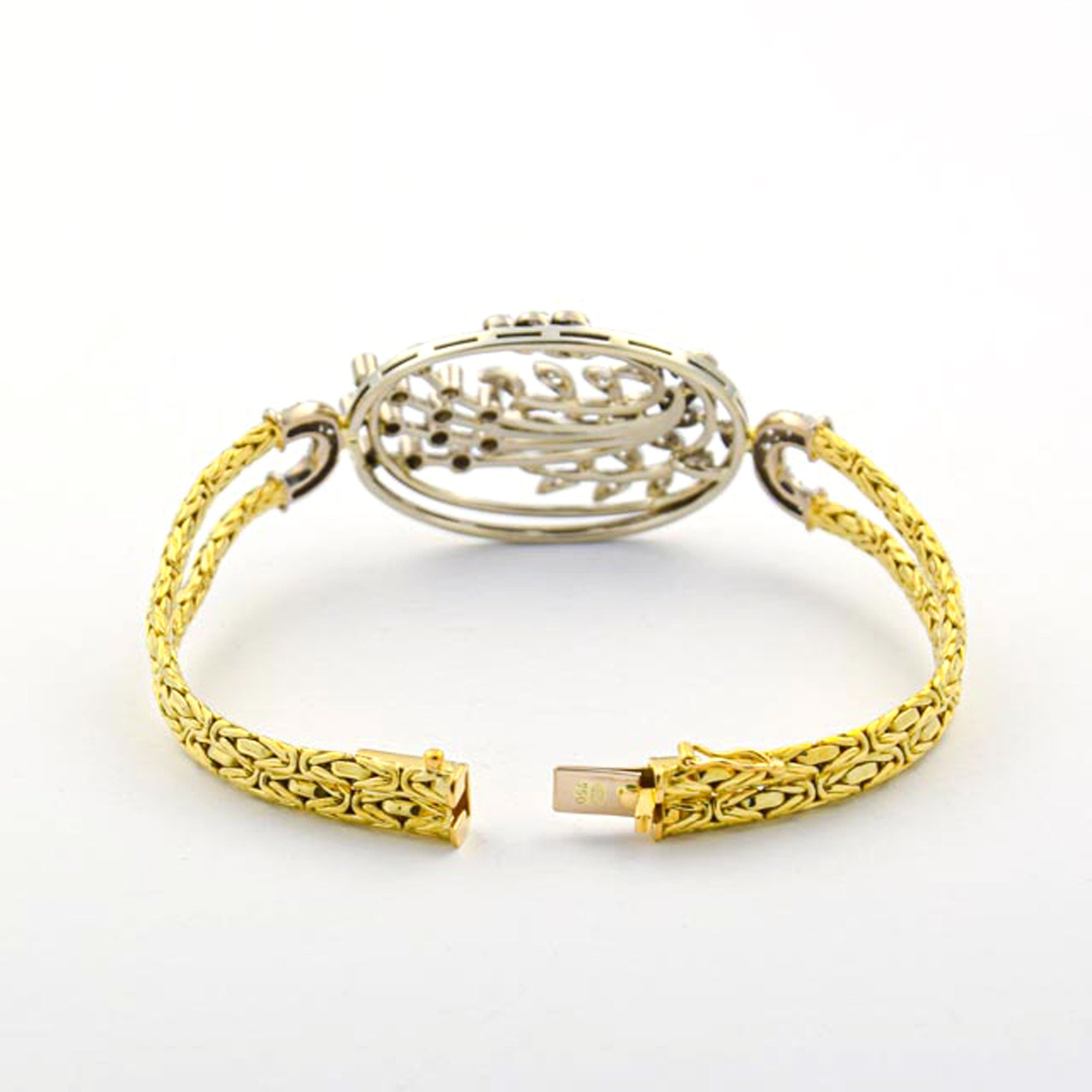 Bei dem Schmuckstück handelt es sich um ein Armband aus 750 Gelb- und Weißgold mit 70 Diamanten im 8/8 Schliff von zusammen ca. 0,7 ct in der Qualität Weiß mit sehr kleinen Einschlüssen (W/vs). Das Schmuckstück hat eine Gesamtlänge von 18,5 cm.