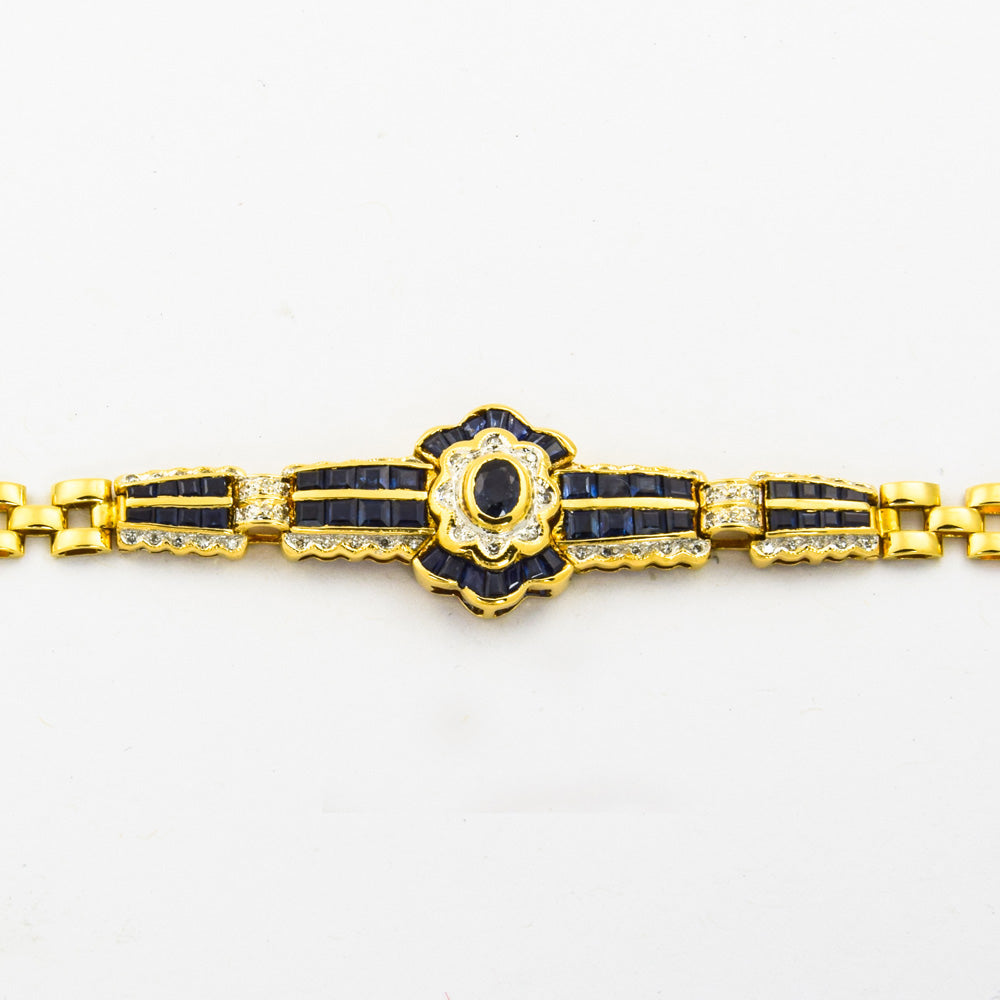 Bei dem Schmuckstück handelt es sich um ein Armband aus 750 Gelb- und Weißgold mit 47 Saphiren und 60 Diamanten im 8/8 Schliff von zusammen ca. 0,3 ct in der Qualität Weiß mit kleinen Einschlüssen (W/si). Das Schmuckstück hat eine Gesamtlänge von 19,5 cm.