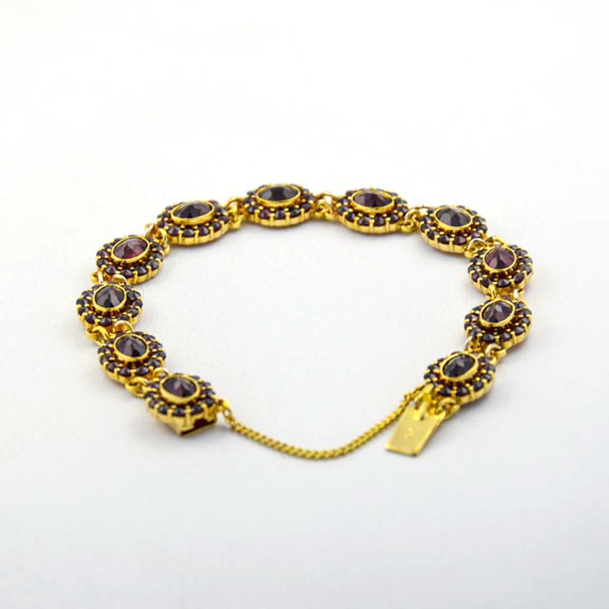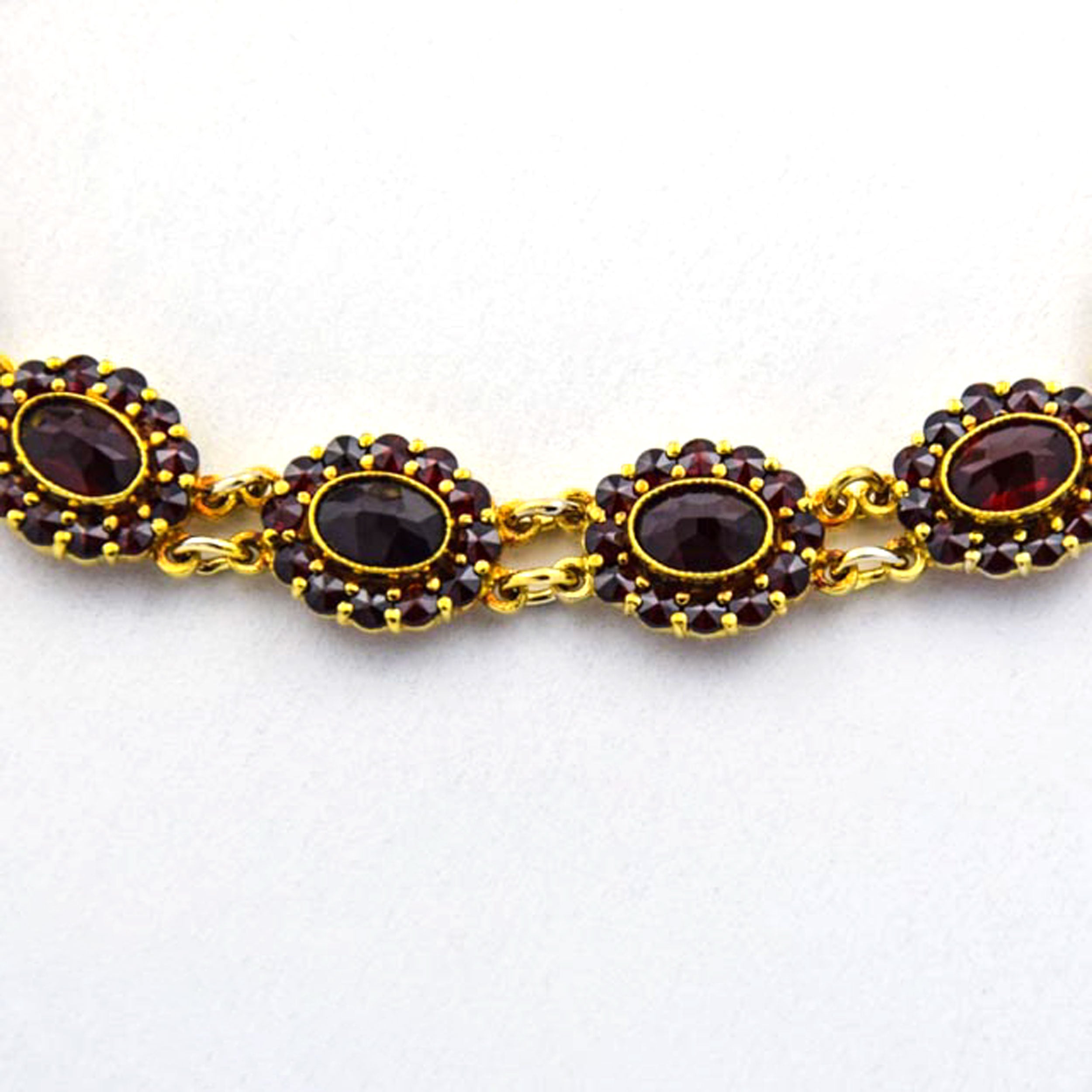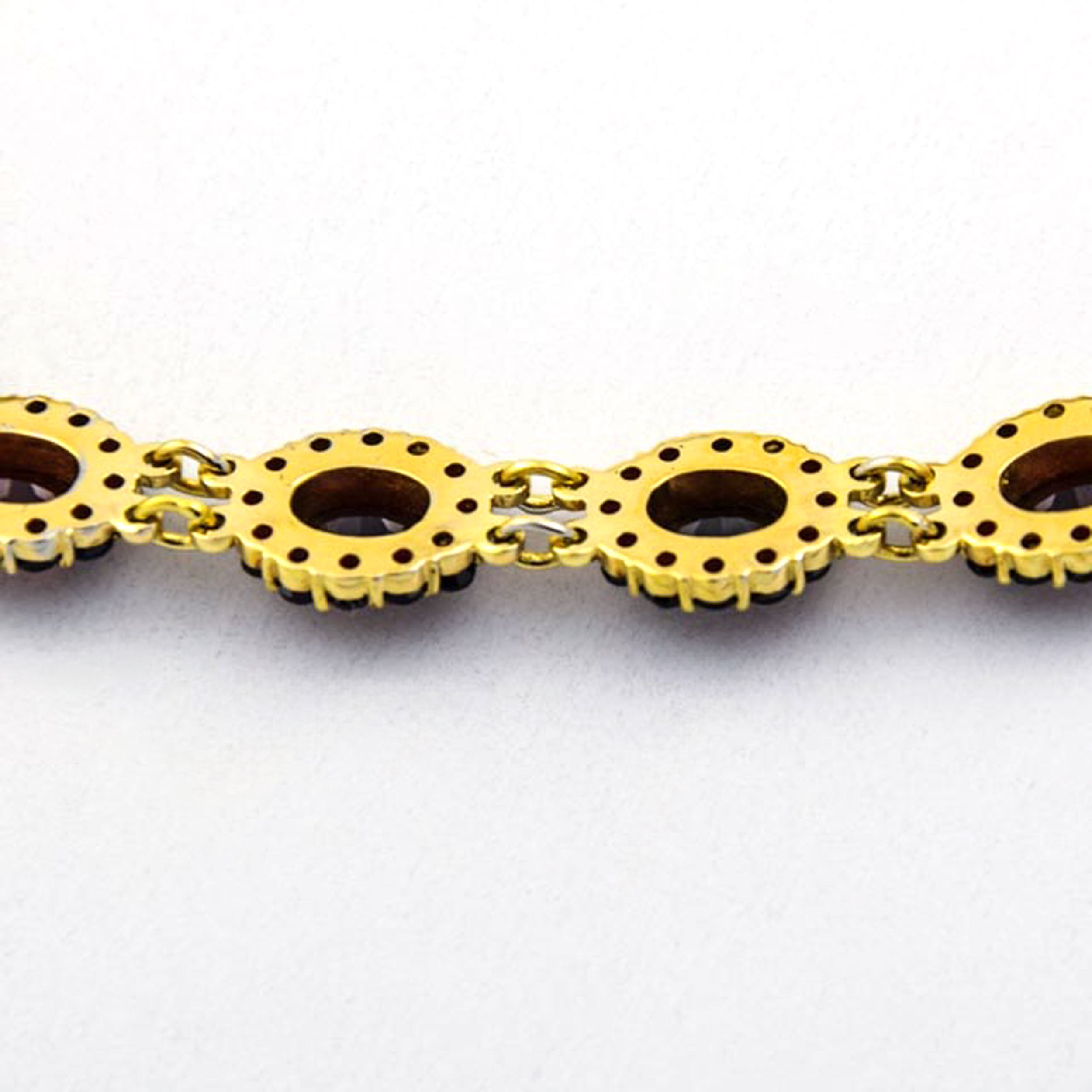 Bei dem Schmuckstück handelt es sich um ein Armband aus 375 Gelbgold mit 143 Granaten. Das Schmuckstück hat eine Gesamtlänge von 20 cm.