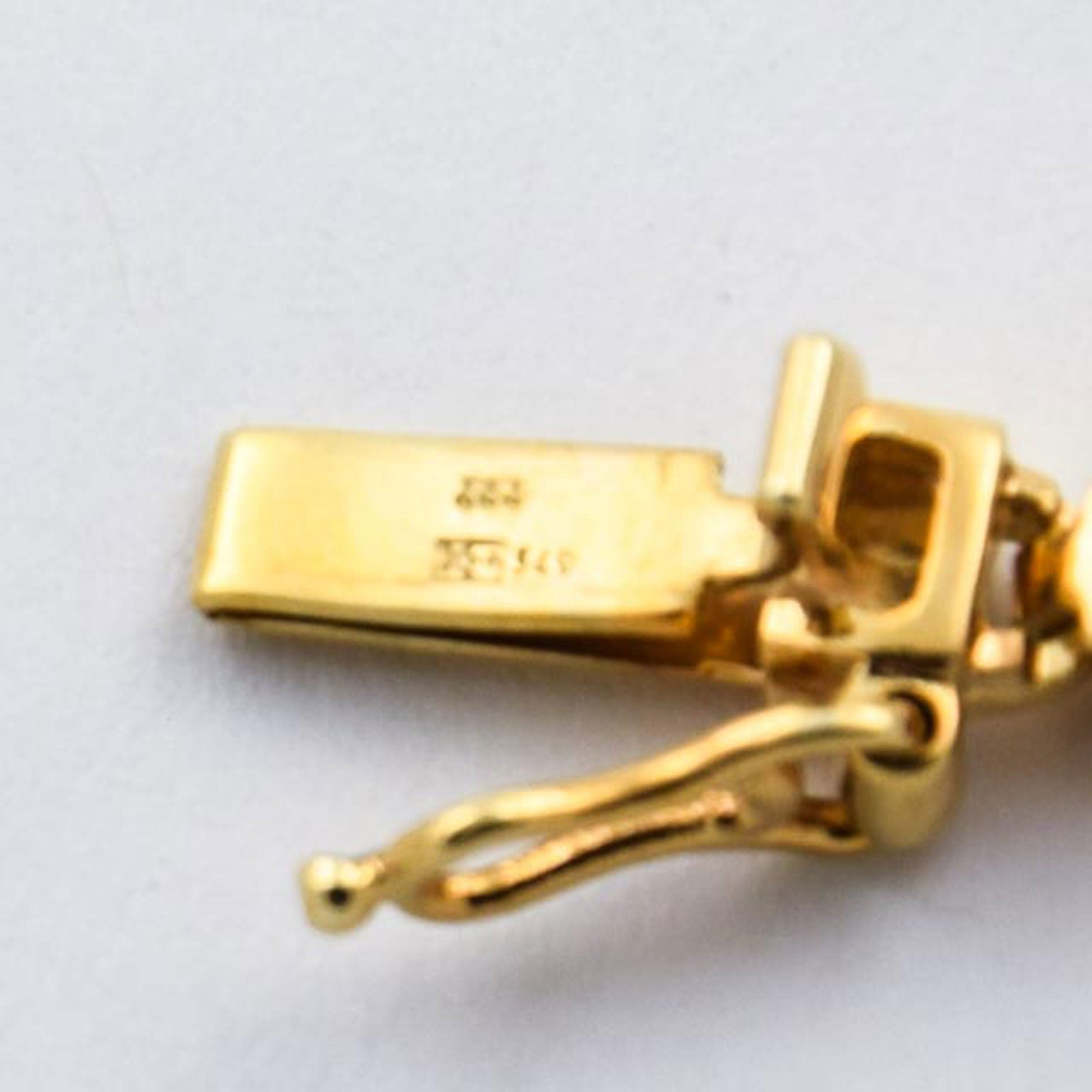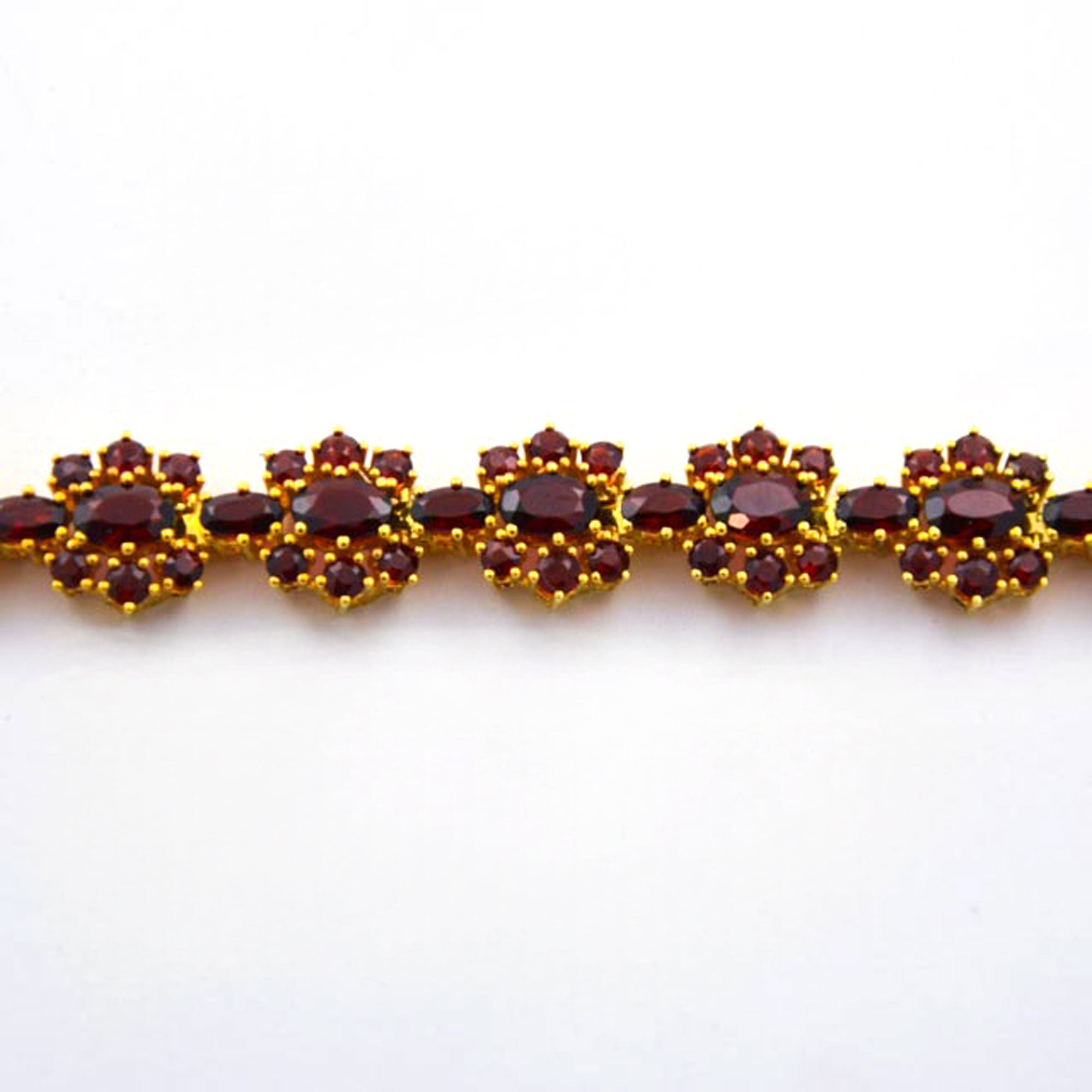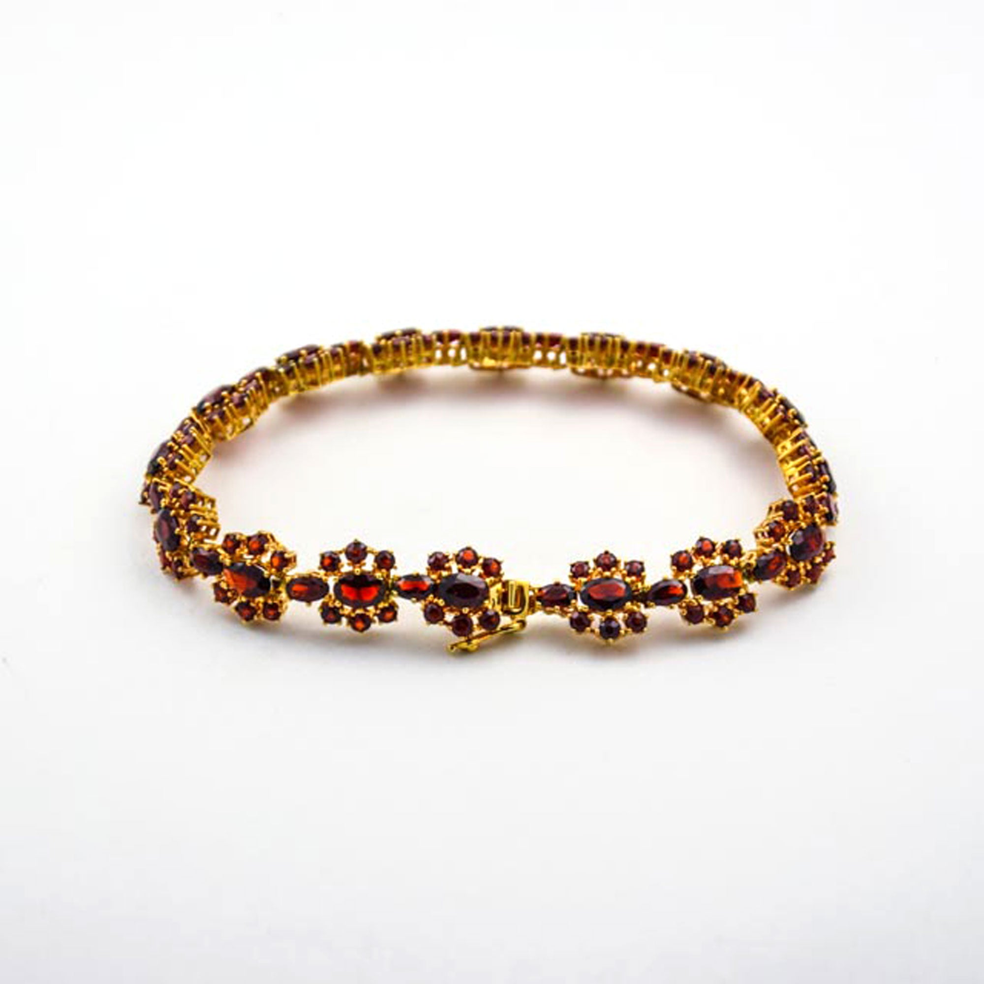 Bei dem Schmuckstück handelt es sich um ein Armband aus 333 Gelbgold mit 128 Granaten. Das Schmuckstück hat eine Gesamtlänge von 20,5 cm.