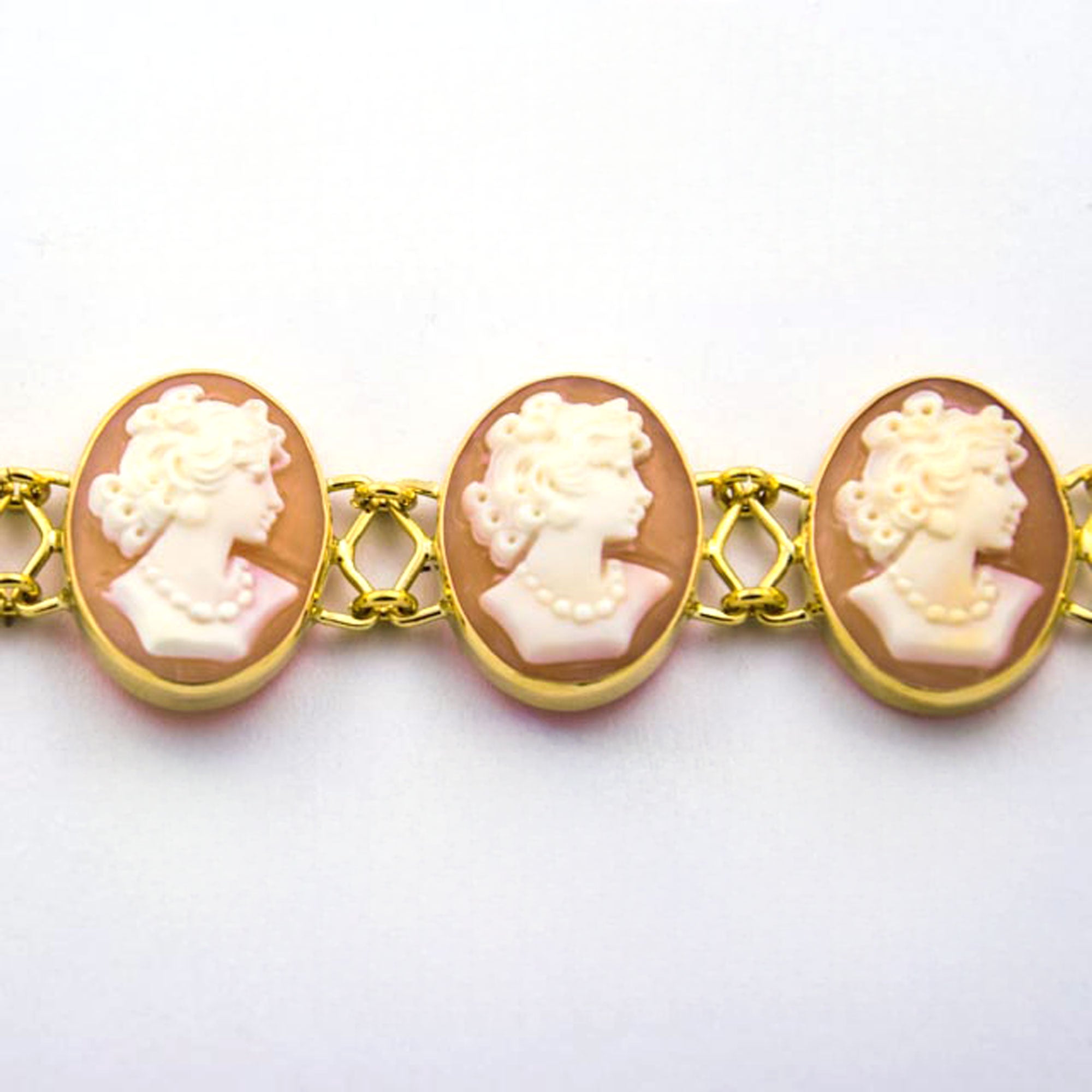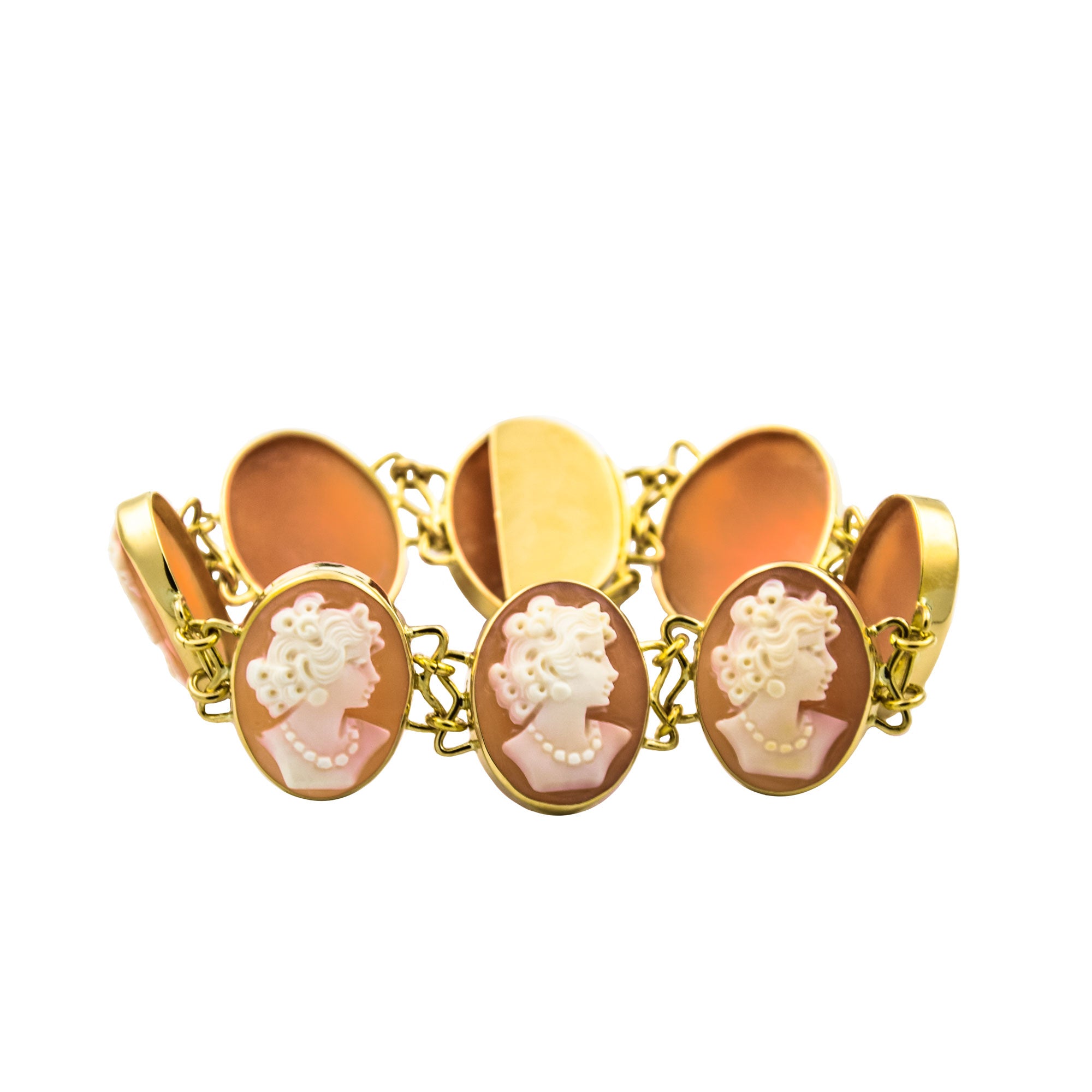 Bei dem Schmuckstück handelt es sich um ein Armband aus 750 Gelbgold mit acht Muschelkameen. Das Schmuckstück hat eine Gesamtlänge von 17 cm.