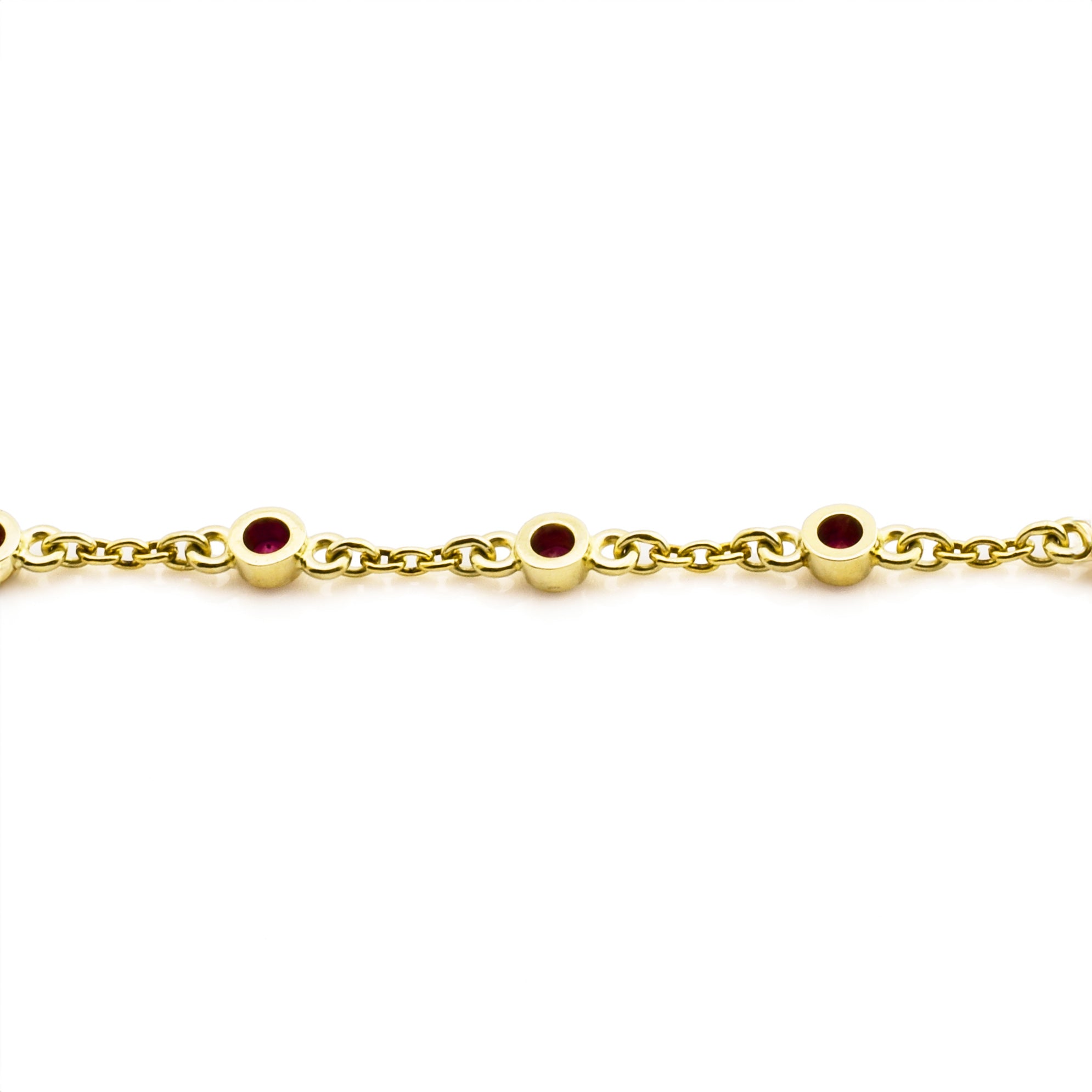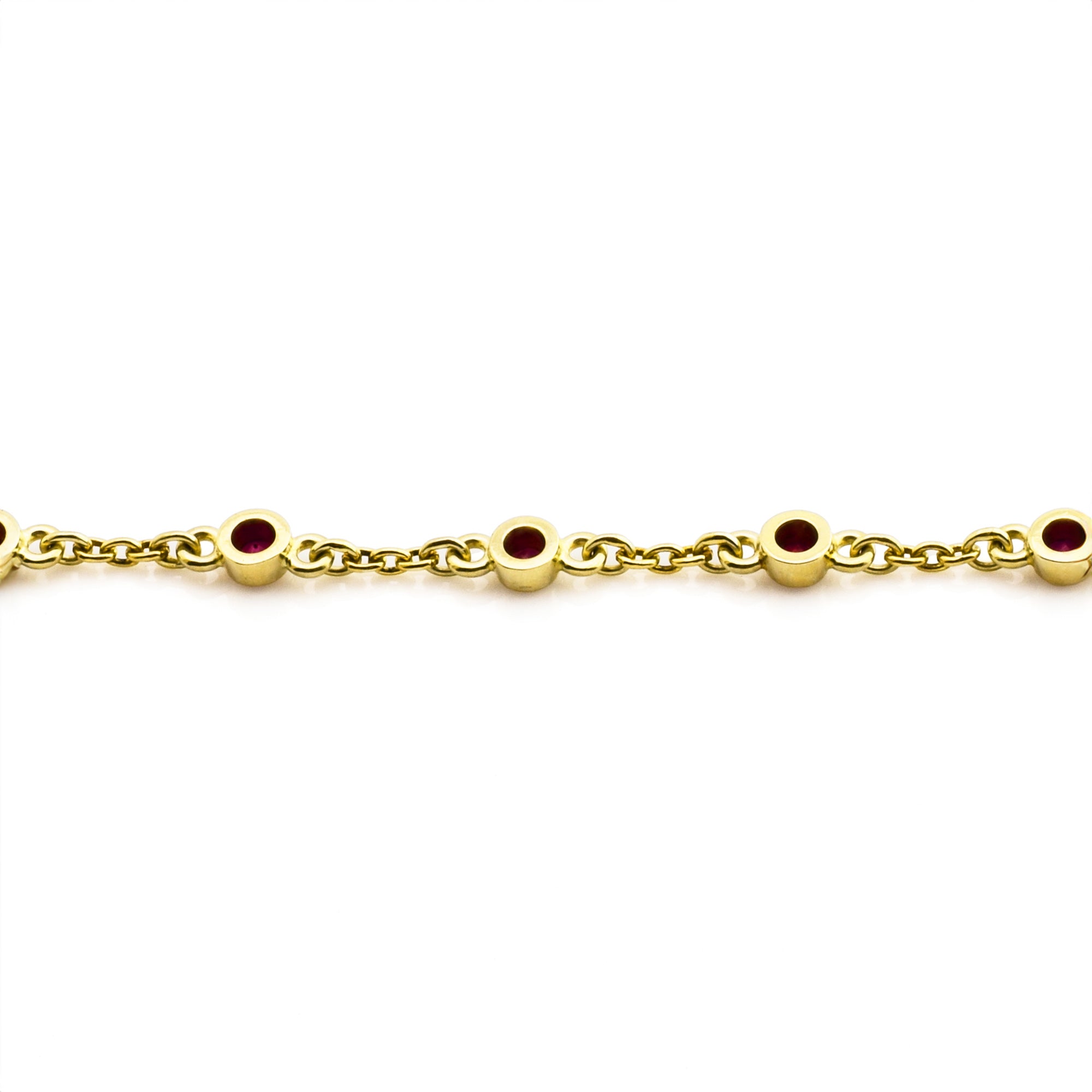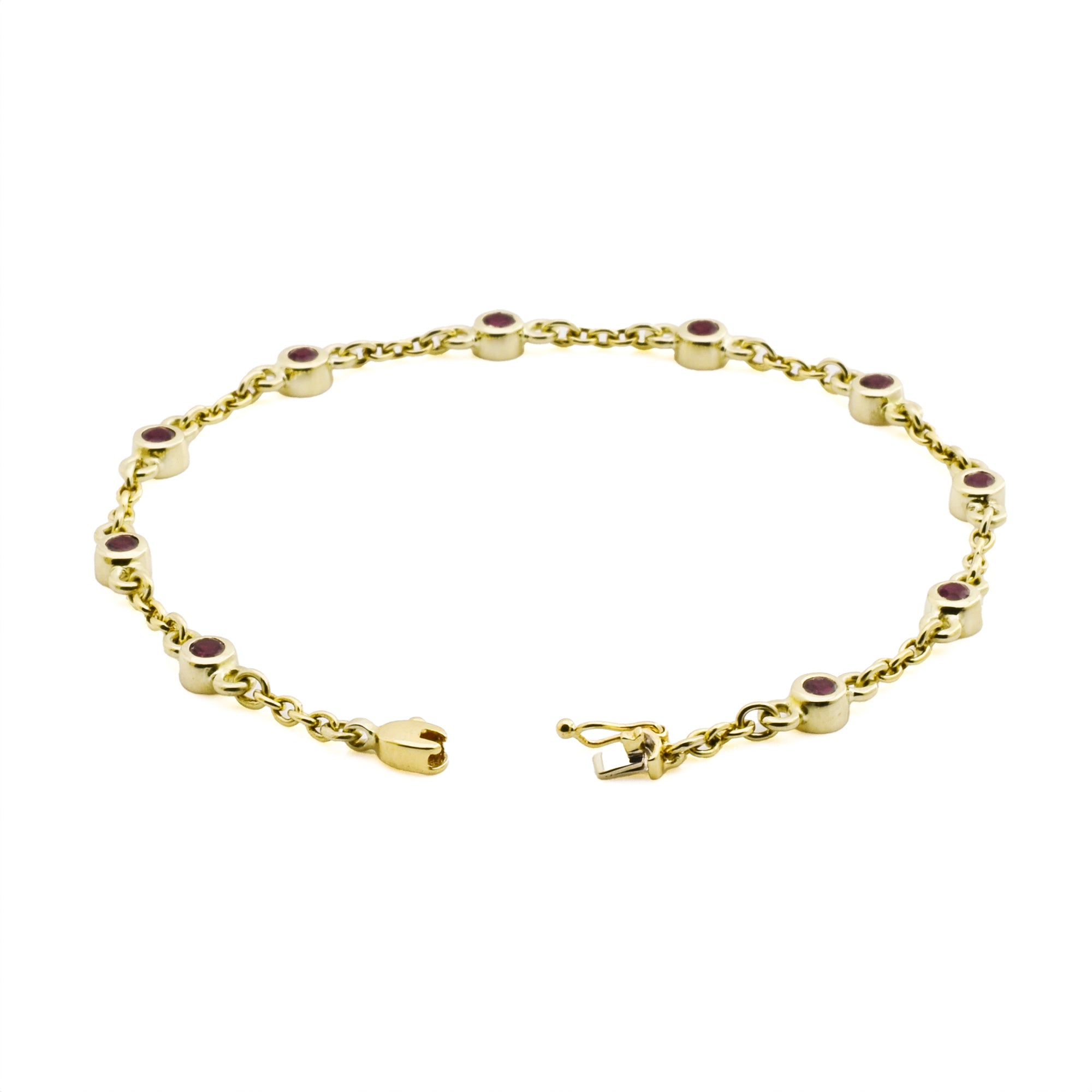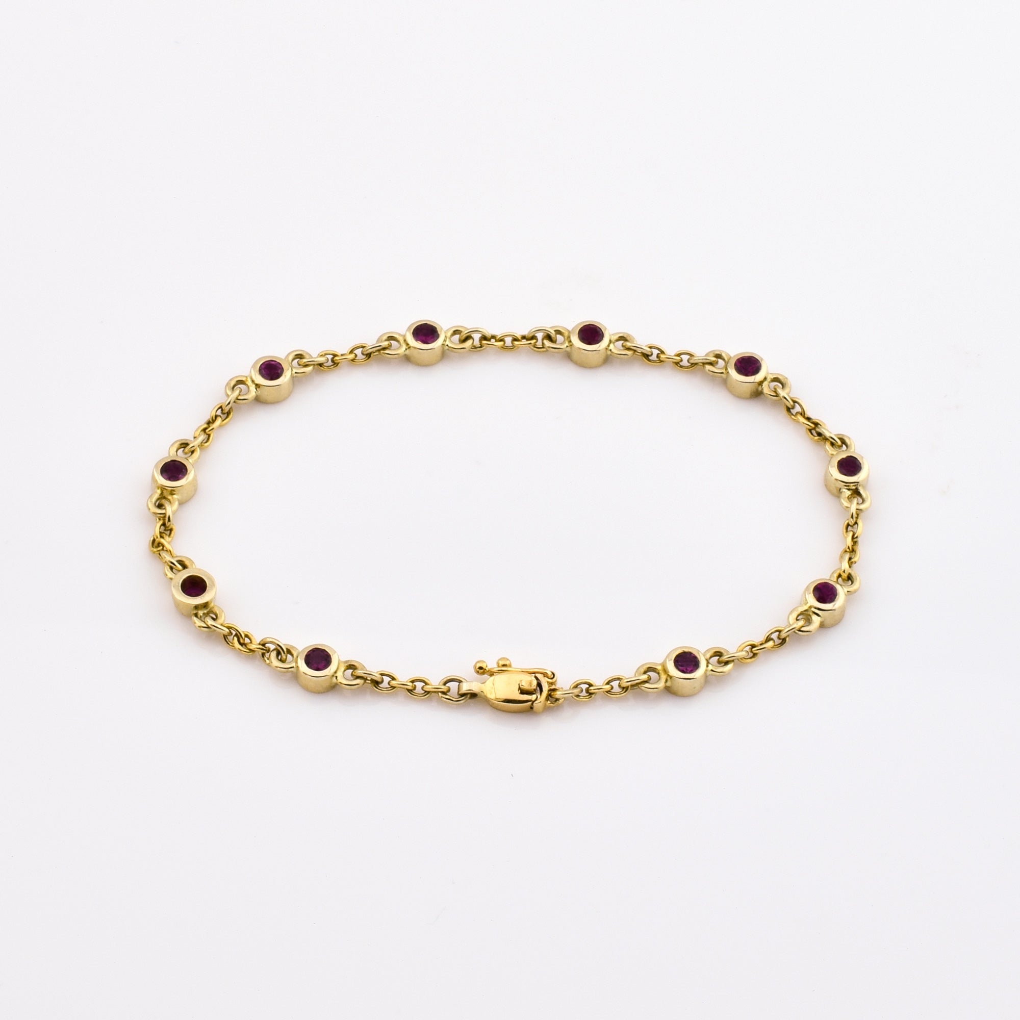 Bei dem Schmuckstück handelt es sich um ein in Handarbeit gefertigtes Armband aus 585 Gelbgold mit zehn Rubinen. Das Schmuckstück hat eine Gesamtlänge von 19 cm.