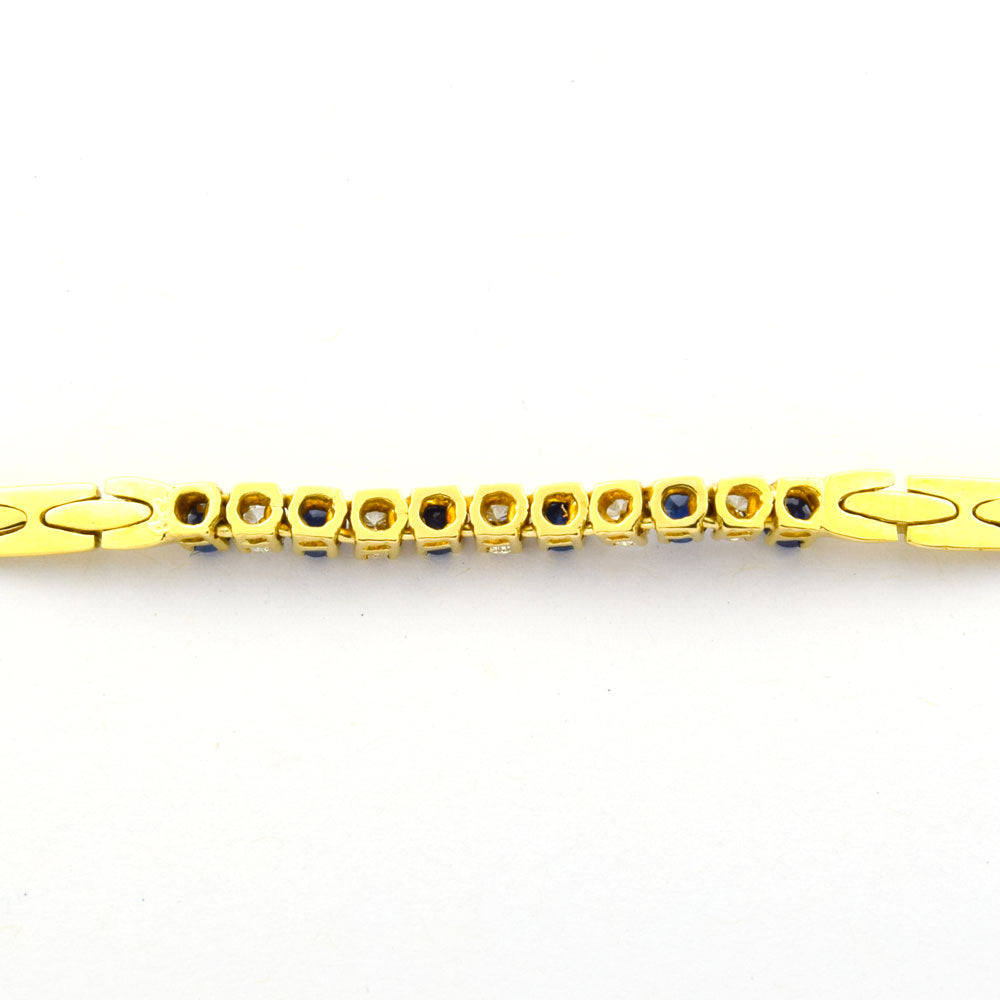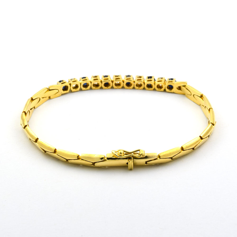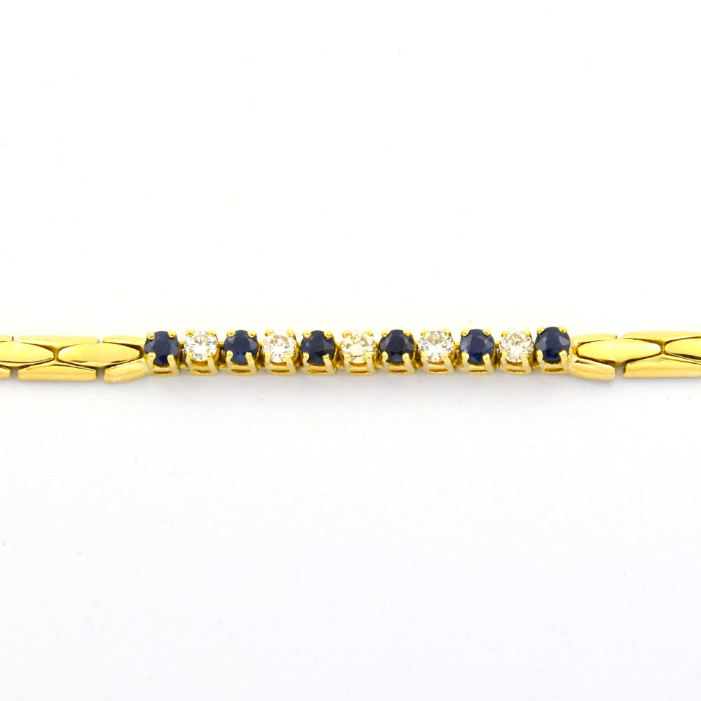 Bei dem Schmuckstück handelt es sich um ein Armband aus 585 Gelbgold mit sechs Saphiren und fünf Brillanten von zusammen ca. 0,7 ct in der Qualität getönt 1 mit kleinen Einschlüssen (TCape/si). Das Schmuckstück hat eine Gesamtlänge von 18 cm.