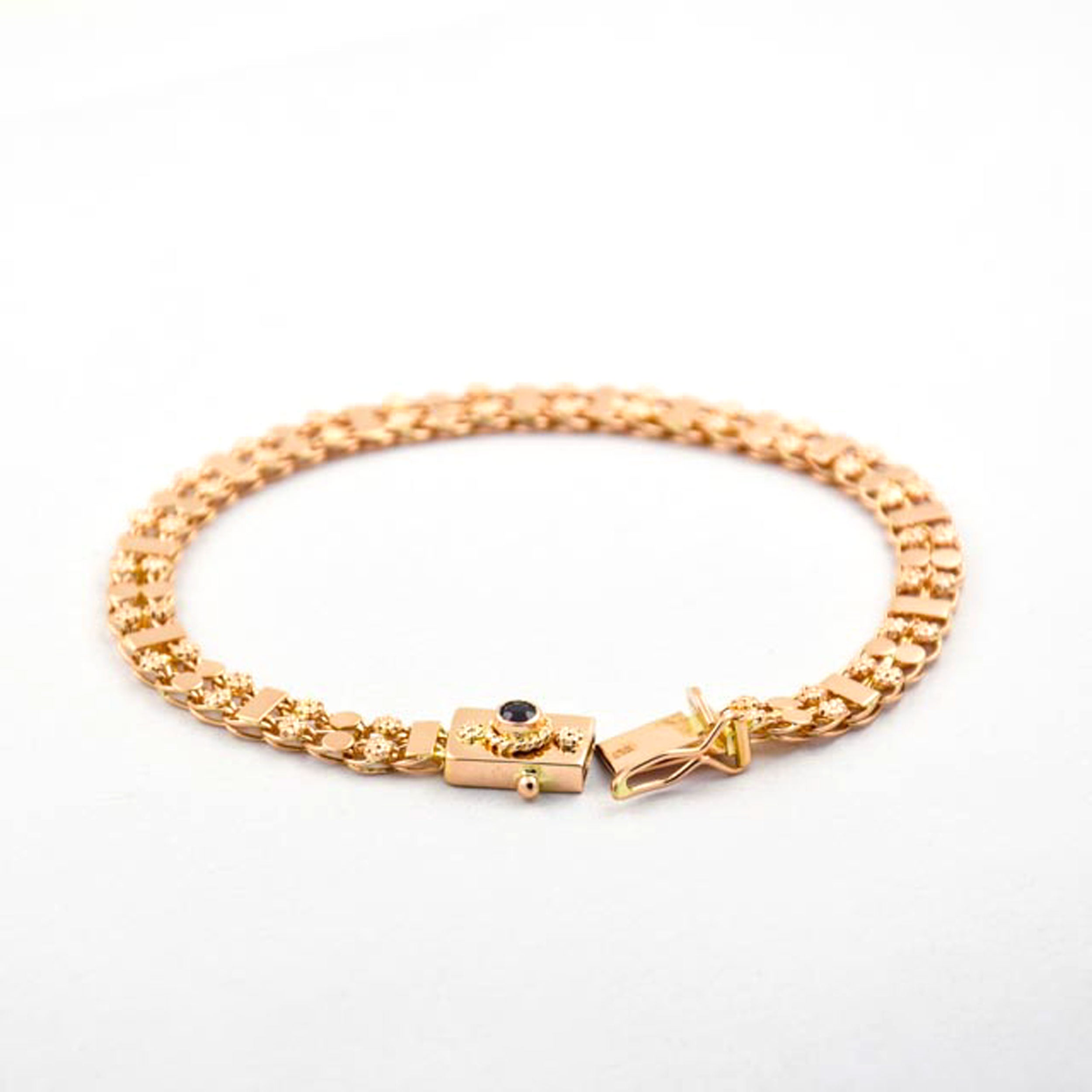 Bei dem Schmuckstück handelt es sich um ein Armband aus 585 Roségold mit einem Granat. Das Schmuckstück hat eine Gesamtlänge von 20,5 cm.
