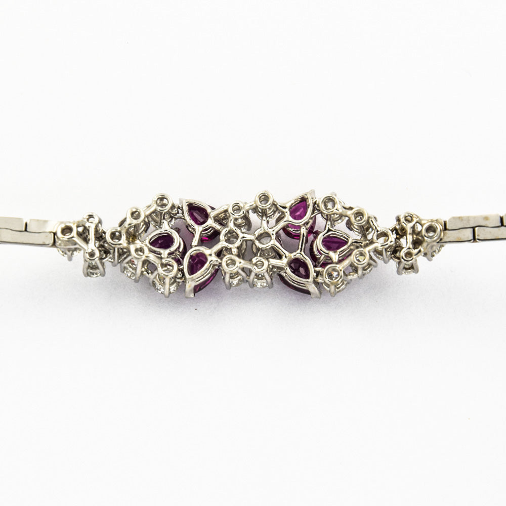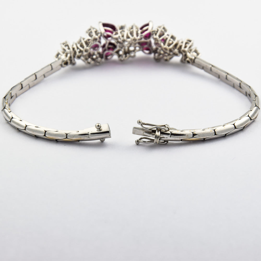 Bei dem Schmuckstück handelt es sich um ein neuwertiges Armband aus 750 Weißgold mit sechs Rubinen von zusammen ca. 3,44 ct und 22 Brillanten von zusammen ca. 2,26 ct in der Qualität Weiß mit sehr kleinen Einschlüssen (W/vs). Das Schmuckstück hat eine Gesamtlänge von 18,5 cm.
