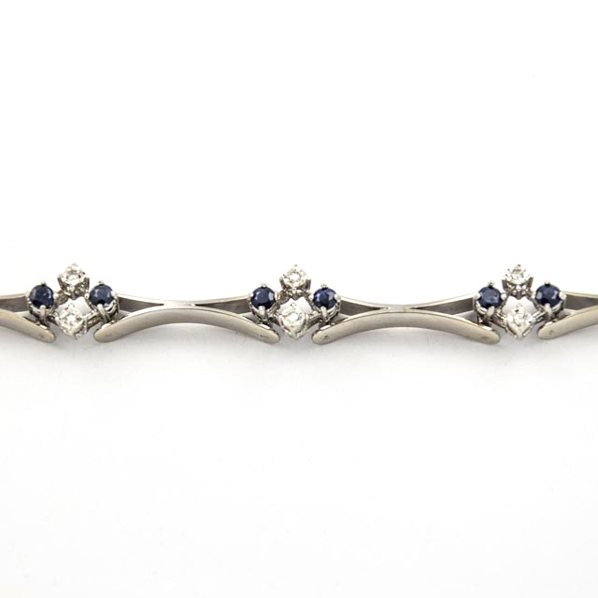 Bei dem Schmuckstück handelt es sich um ein Armband aus 585 Weißgold mit acht Saphiren und acht Diamanten im 8/8 Schliff von zusammen ca. 0,08 ct in der Qualität Weiß mit kleinen Einschlüssen (W/si). Das Schmuckstück hat eine Gesamtlänge von 19 cm.