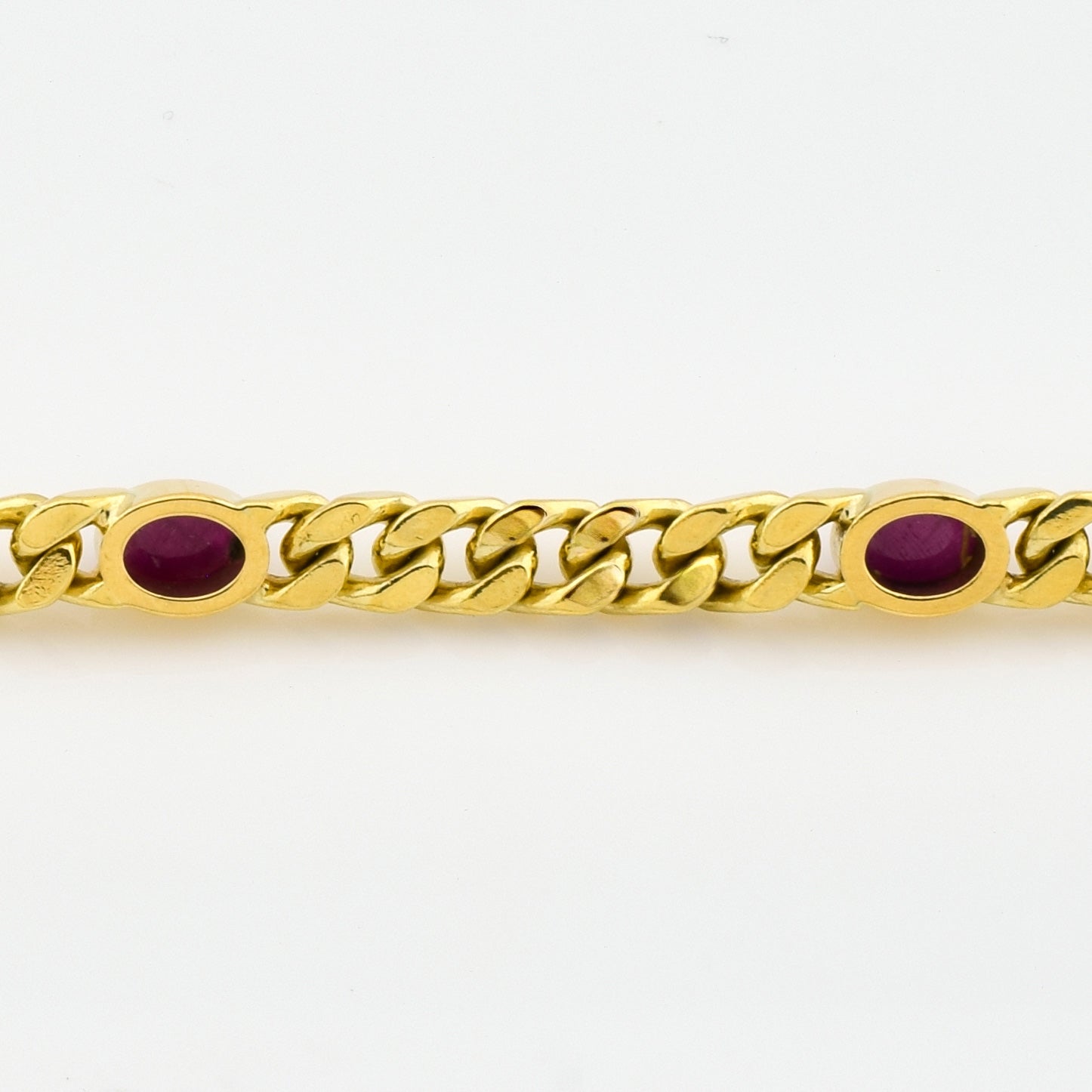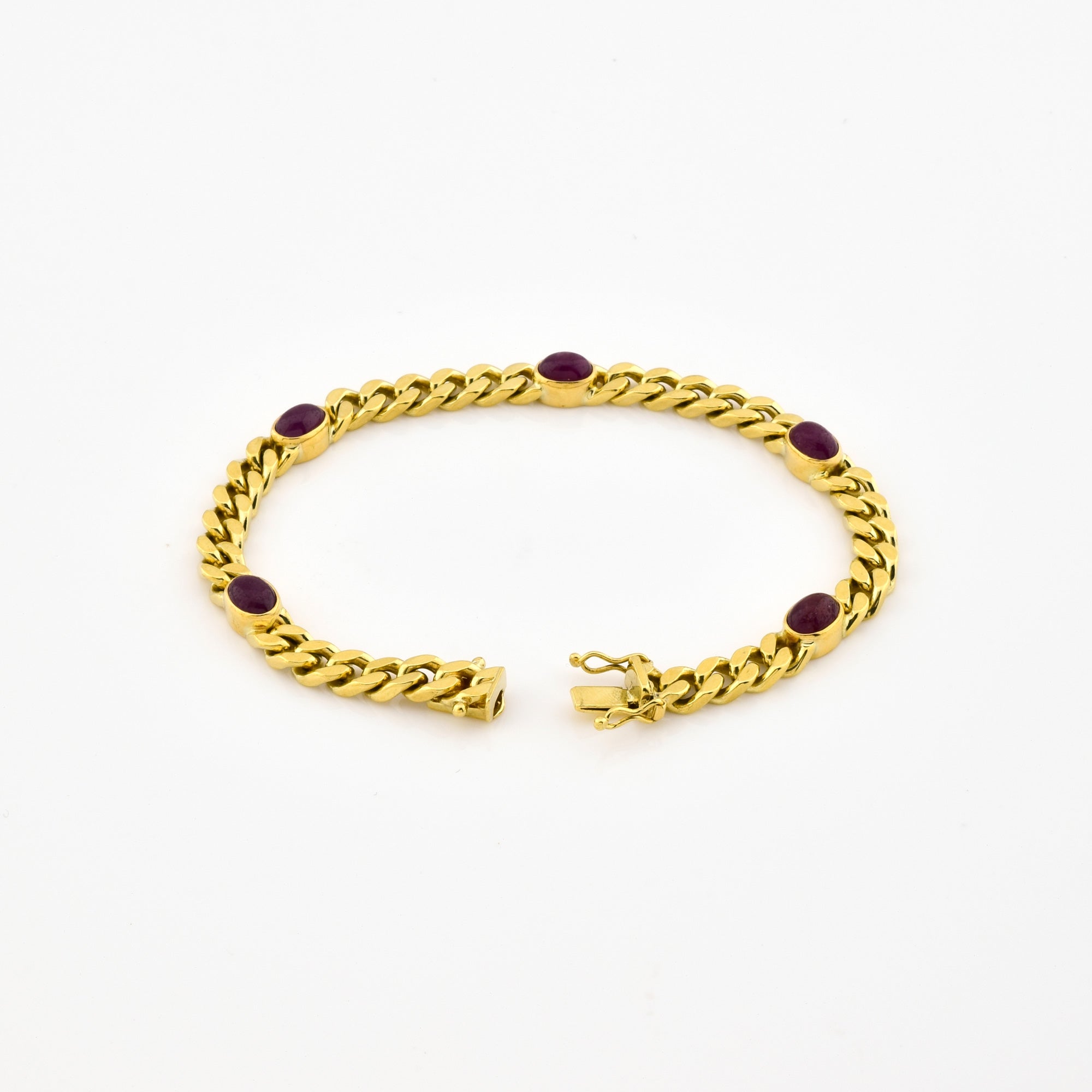 Bei dem Schmuckstück handelt es sich um ein Panzerarmband der Marke FBM aus 750 Gelbgold mit fünf Rubincabochons. Das Schmuckstück hat eine Gesamtlänge von 19 cm.
