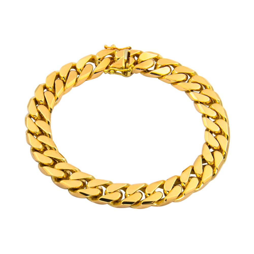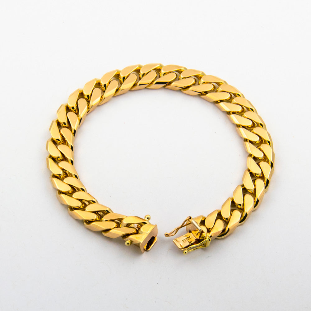 Bei dem Schmuckstück handelt es sich um ein Panzerarmband aus 585 Gelbgold. Das Schmuckstück hat eine Gesamtlänge von 19 cm.
