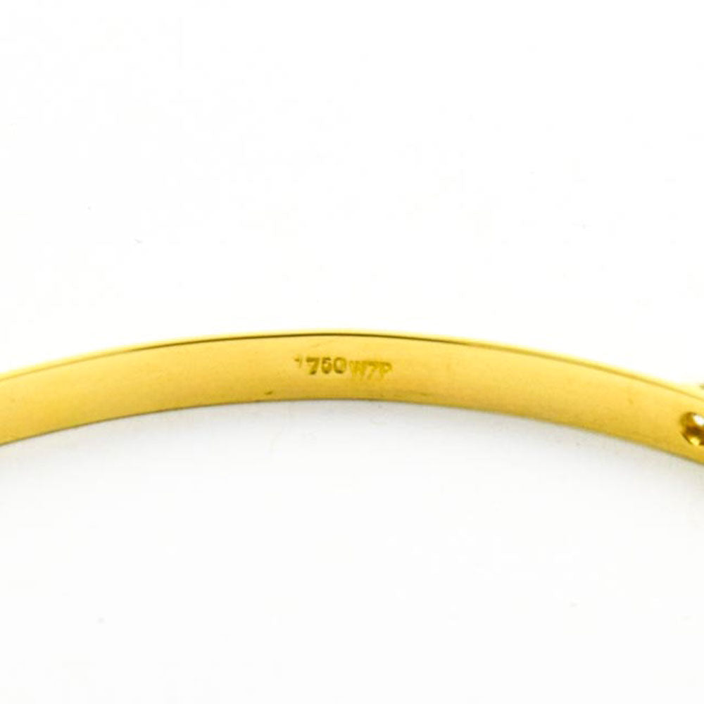 Bei dem Schmuckstück handelt es sich um einen Armreif aus 750 Gelb- und Weißgold mit sechs Brillanten von zusammen ca. 0,18 ct in der Qualität Weiß mit kleinen Einschlüssen (W/si).