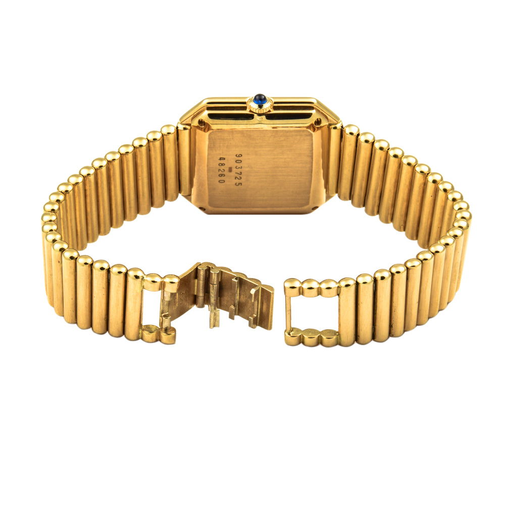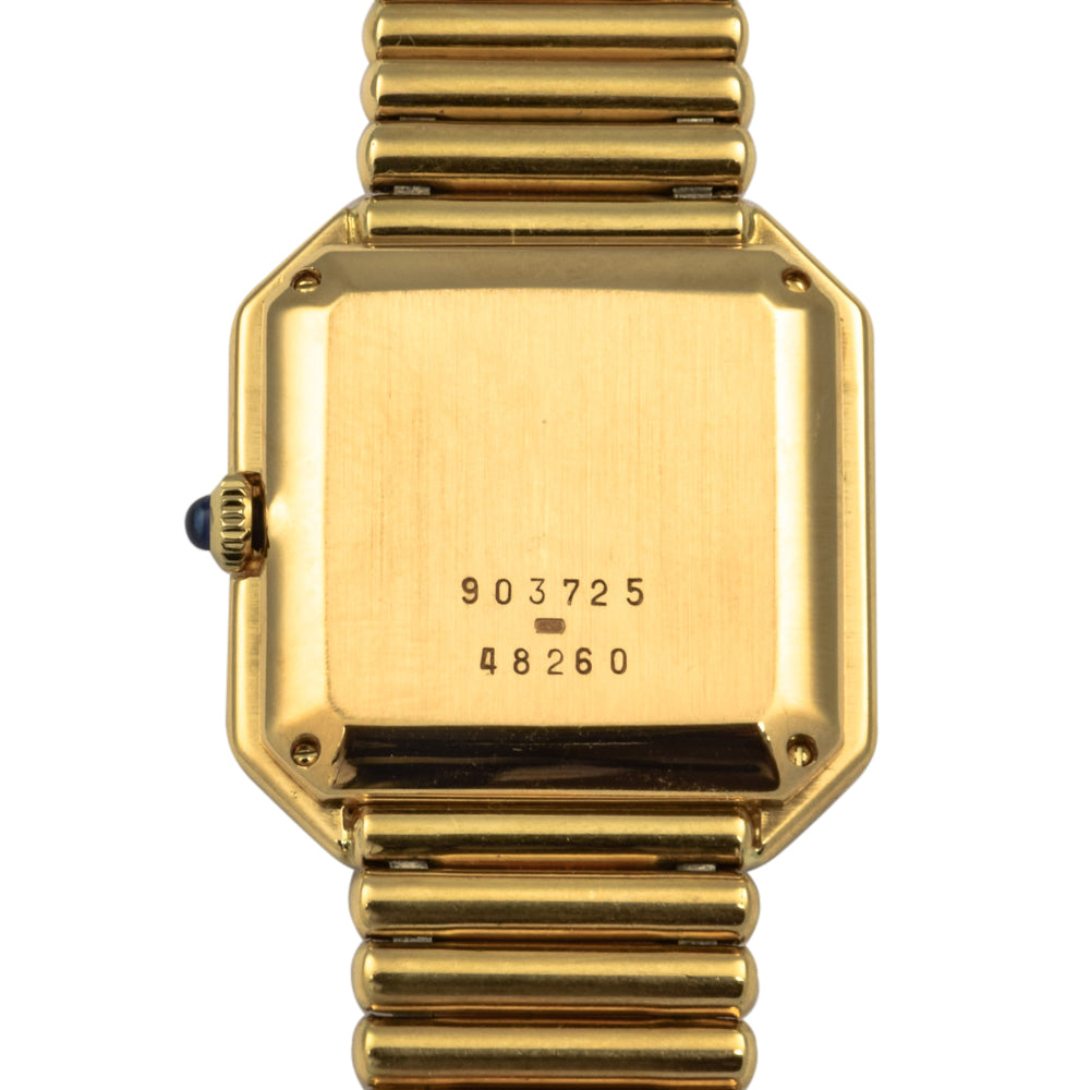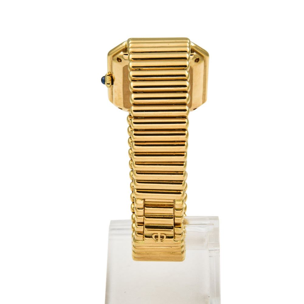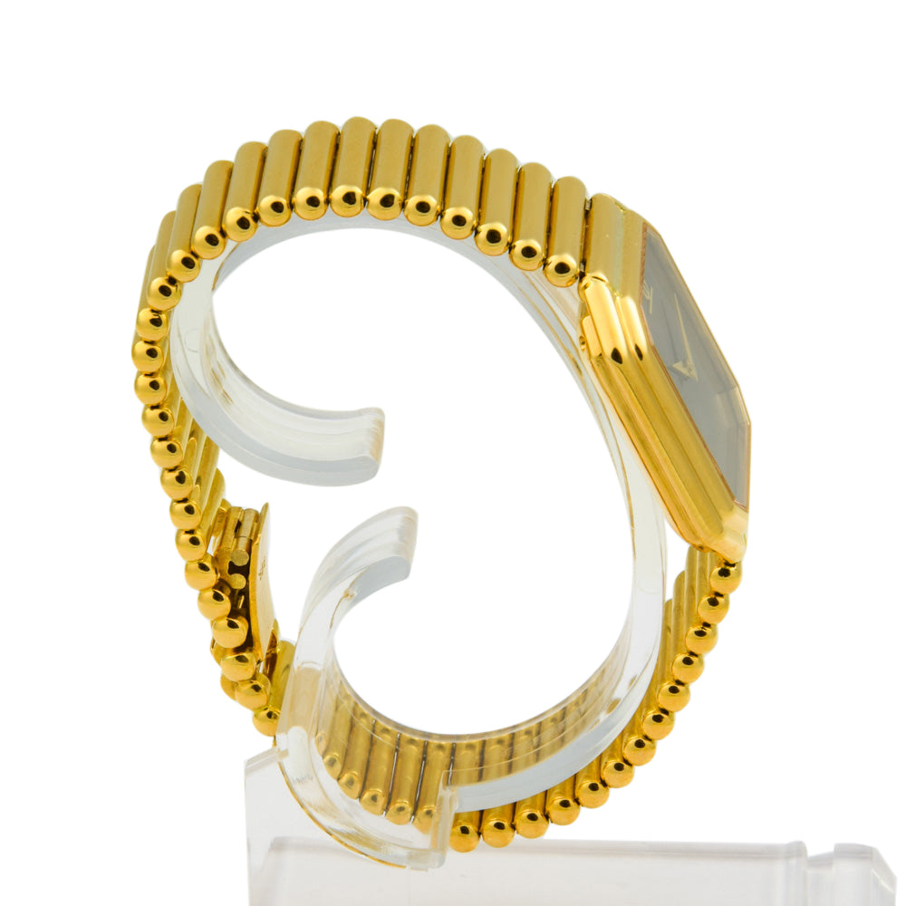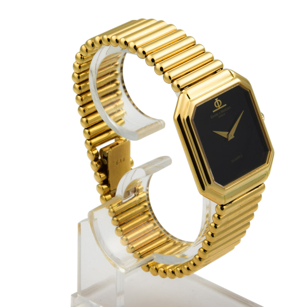 Bei dem Schmuckstück handelt es sich um eine Armbanduhr der Marke Baume & Mercier mit der Referenznummer 48260/636-40/0. Das Material der Uhr ist 750 Gelbgold. Sie besitzt ein Quarzwerk mit 6 Steinen. Es erfolgte eine Revision durch Baume & Mercier im Jahr 2021. Sevicebox und Papiere sind vorhanden.