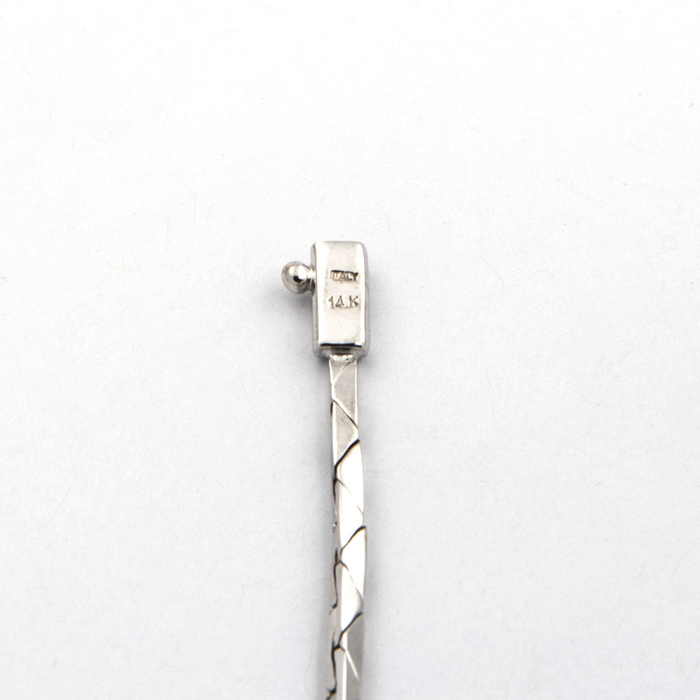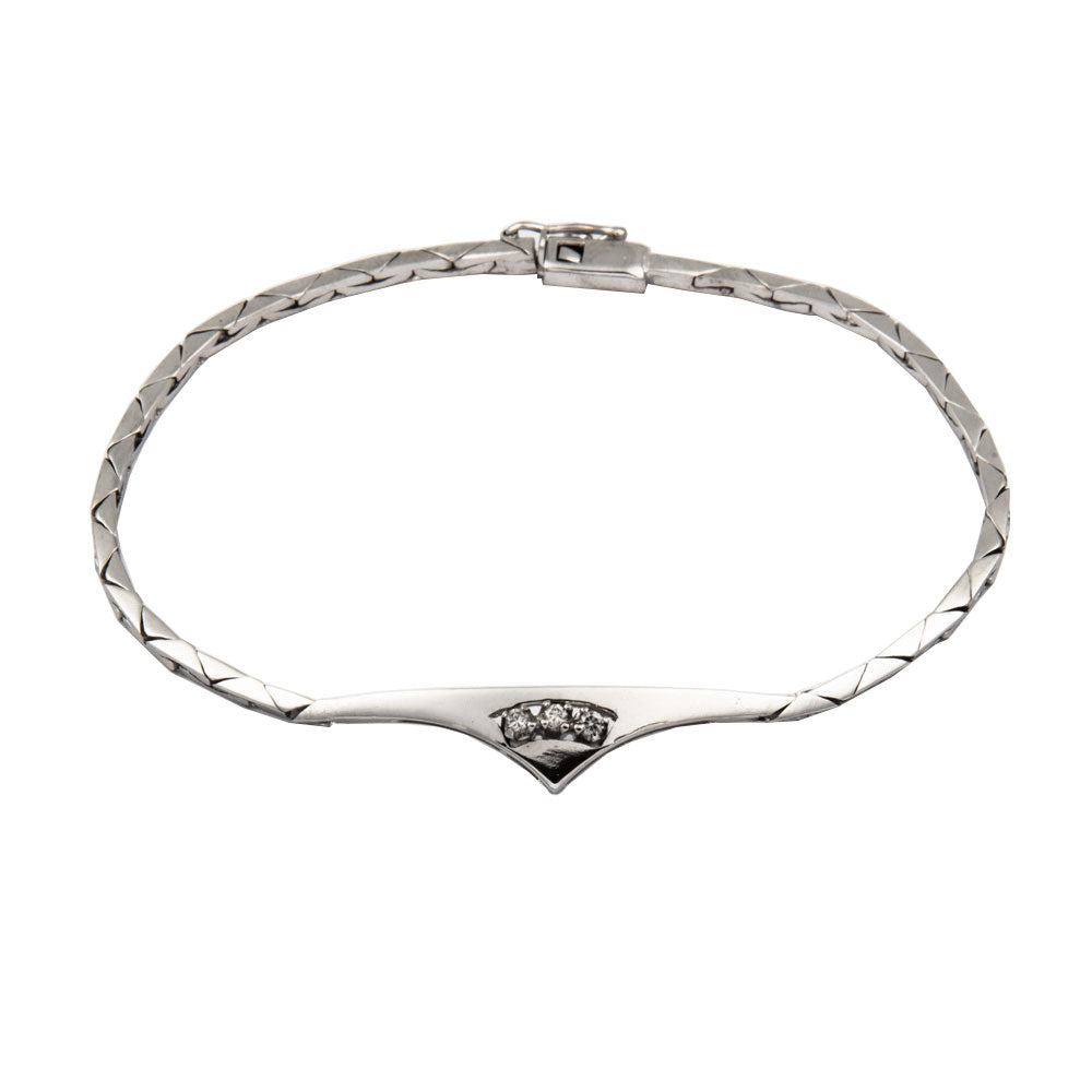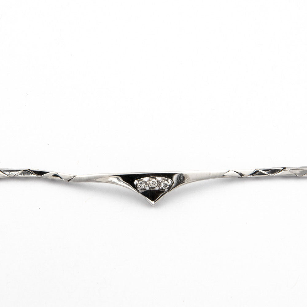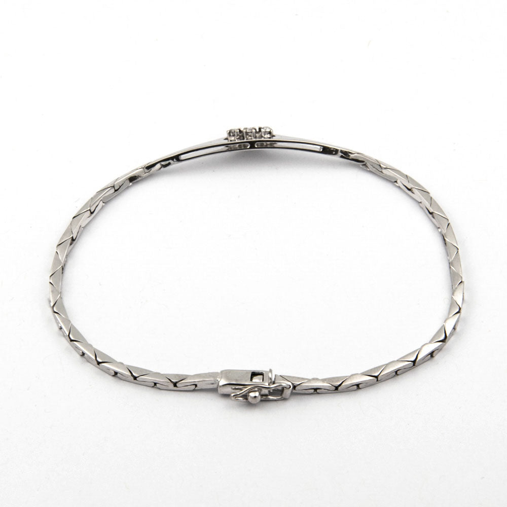 Bei dem Schmuckstück handelt es sich um ein Armband aus 585 Weißgold mit drei Brillanten von zusammen ca. 0,06 ct in der Qualität Weiß mit kleinen Einschlüssen (W/si). Das Schmuckstück hat eine Gesamtlänge von 18,5 cm.