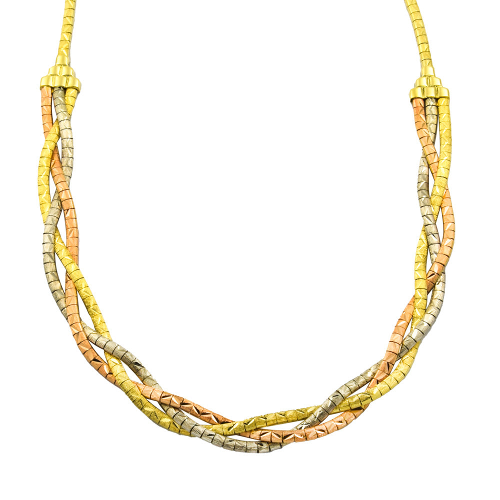 Bei dem Schmuckstück handelt es sich um ein Collier aus 585 Gelb-, Rot- und Weißgold. Das Schmuckstück hat eine Gesamtlänge von 43 cm.