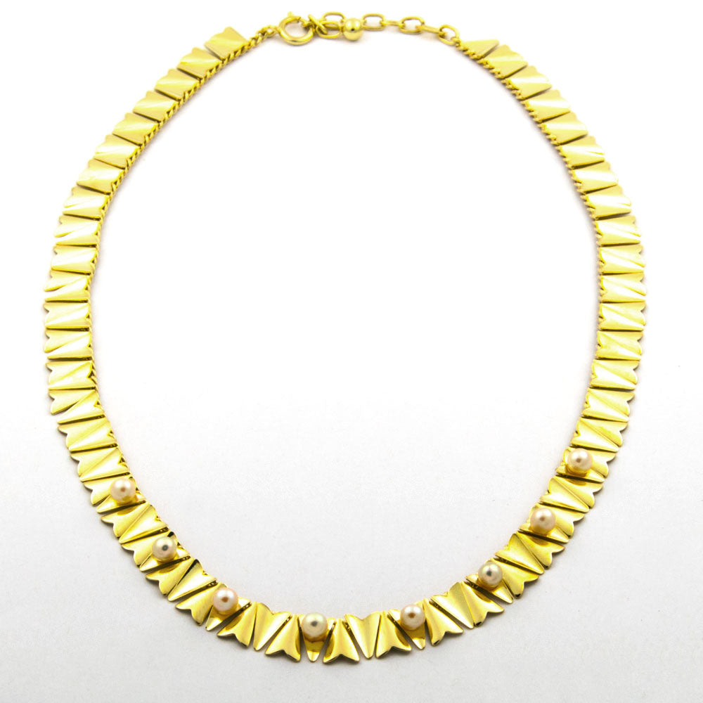 Bei dem Schmuckstück handelt es sich um ein Collier aus 585 Gelbgold mit acht Akoyazuchtperlen. Das Schmuckstück hat eine Gesamtlänge von 43,5 cm.