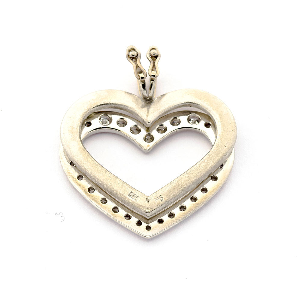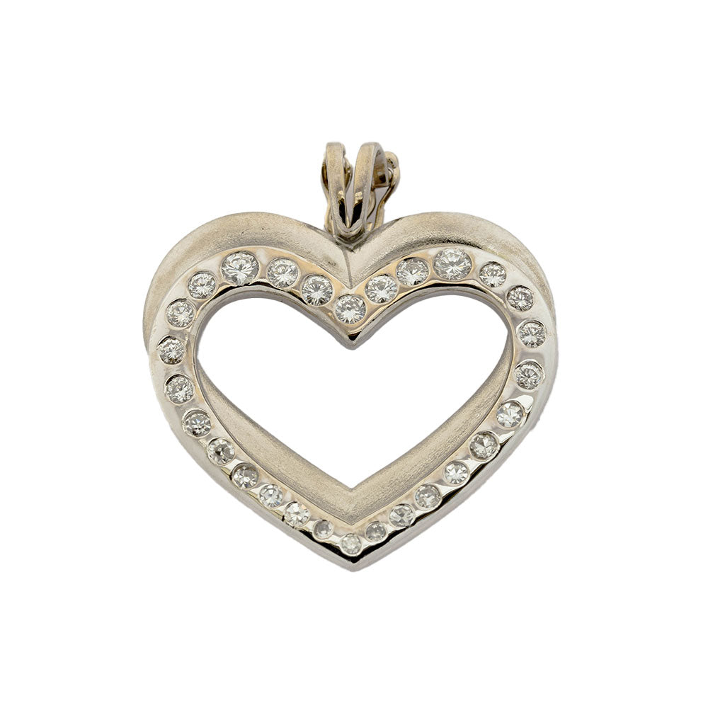Bei dem Schmuckstück handelt es sich um einen in Handarbeit gefertigten An-/Einhänger "Herz" aus 585 Weißgold mit 15 Brillanten von zusammen ca. 0,52 ct in der Qualität Weiß mit kleinen Einschlüssen (W/si) und 13 Diamanten im 8/8 Schliff von zusammen ca. 0,26 ct in der Qualität Weiß mit kleinen Einschlüssen (W/si).