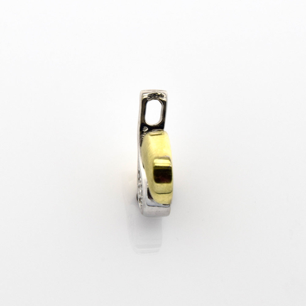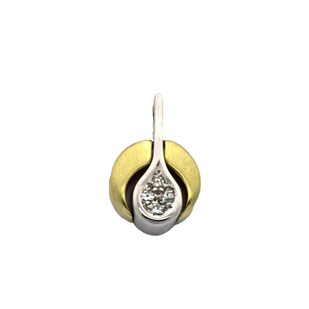Bei dem Schmuckstück handelt es sich um einen Anhänger aus 585 Gelb- und Weißgold mit vier Diamanten im 8/8 Schliff von zusammen ca. 0,08 ct in der Qualität Weiß mit kleinen Einschlüssen (W/si).