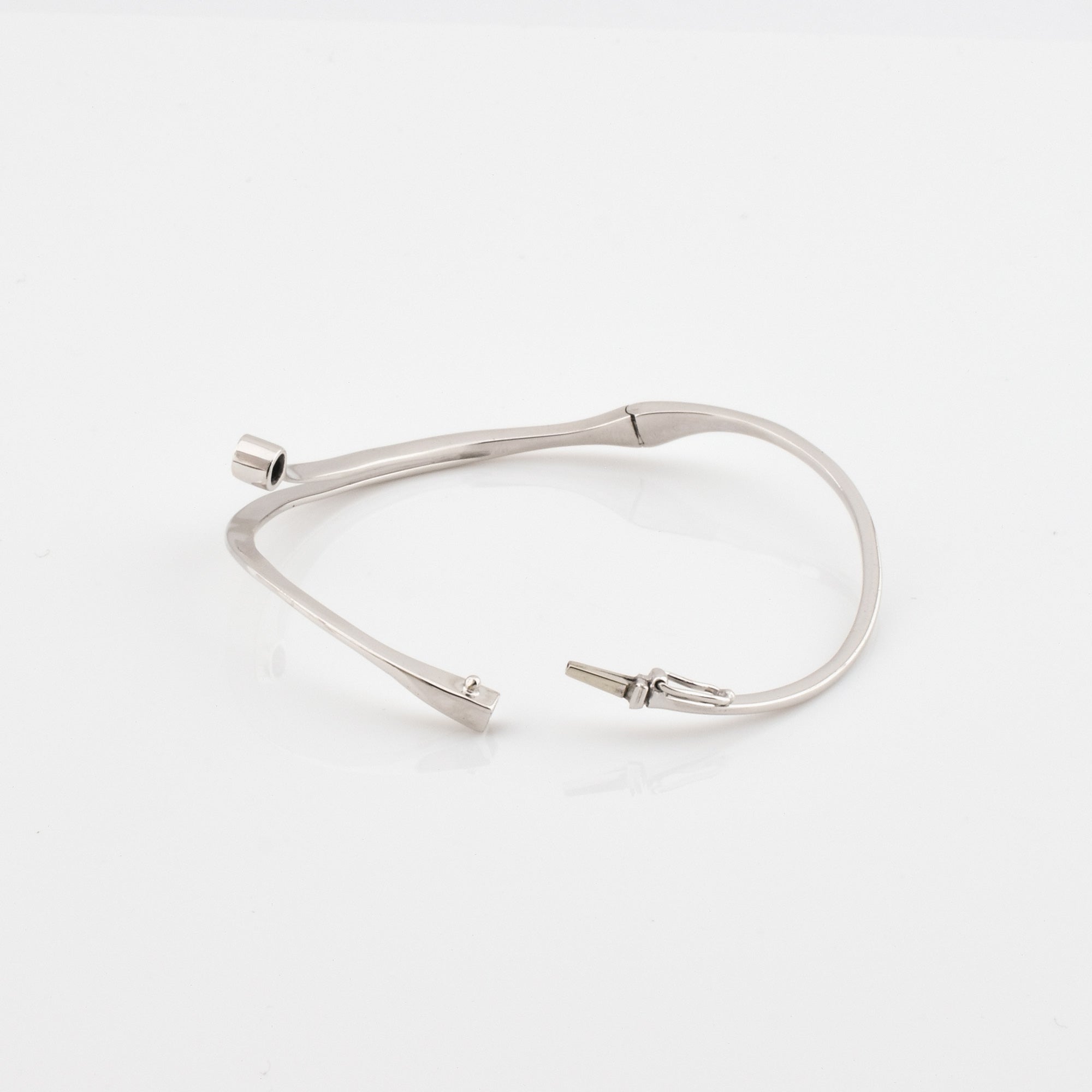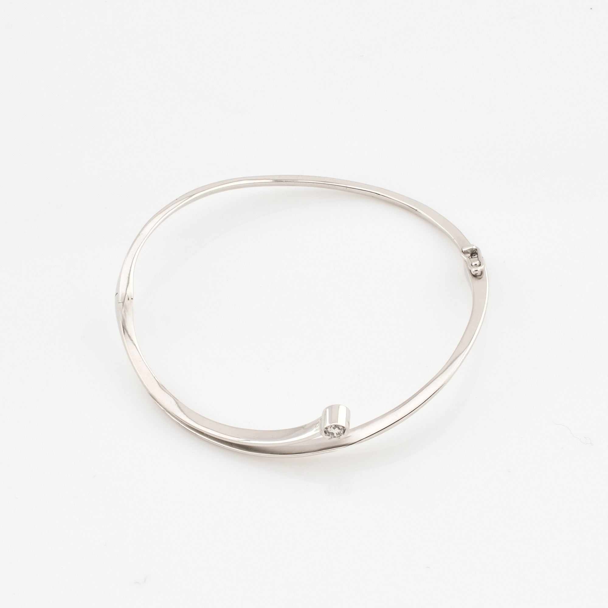 Bei dem Schmuckstück handelt es sich um einen Armreif aus 585 Weißgold mit einem Brillanten von ca. 0,11 ct in der Qualität Weiß mit sehr kleinen Einschlüssen (W/vs).