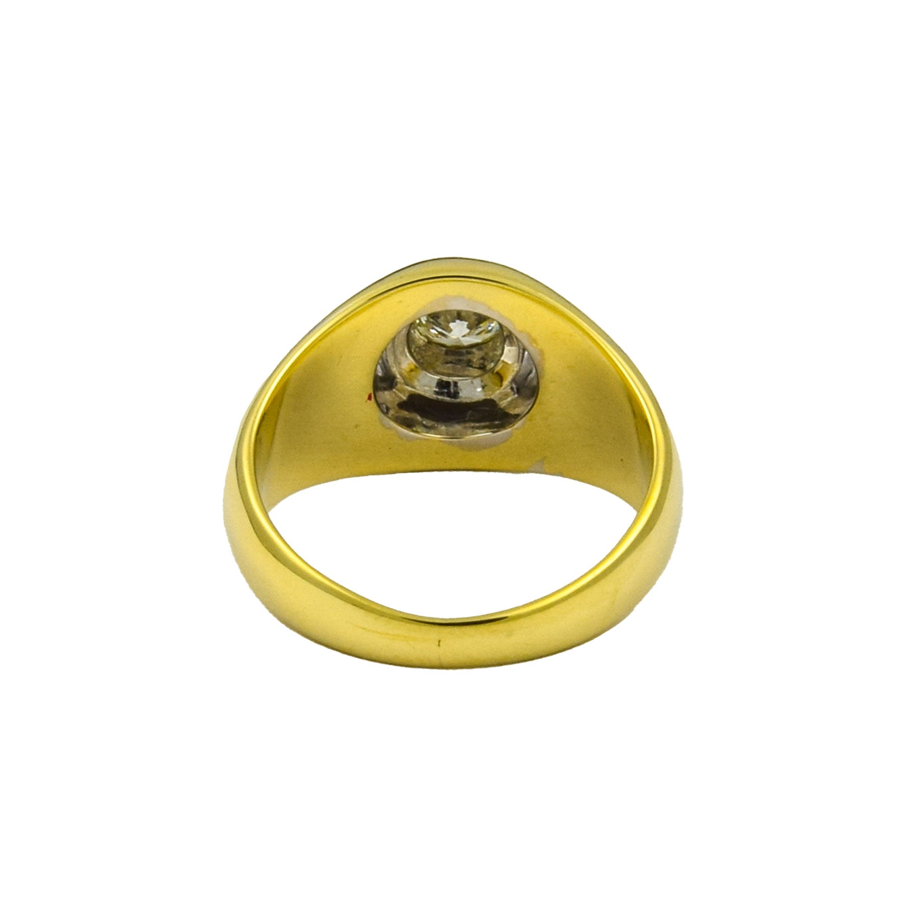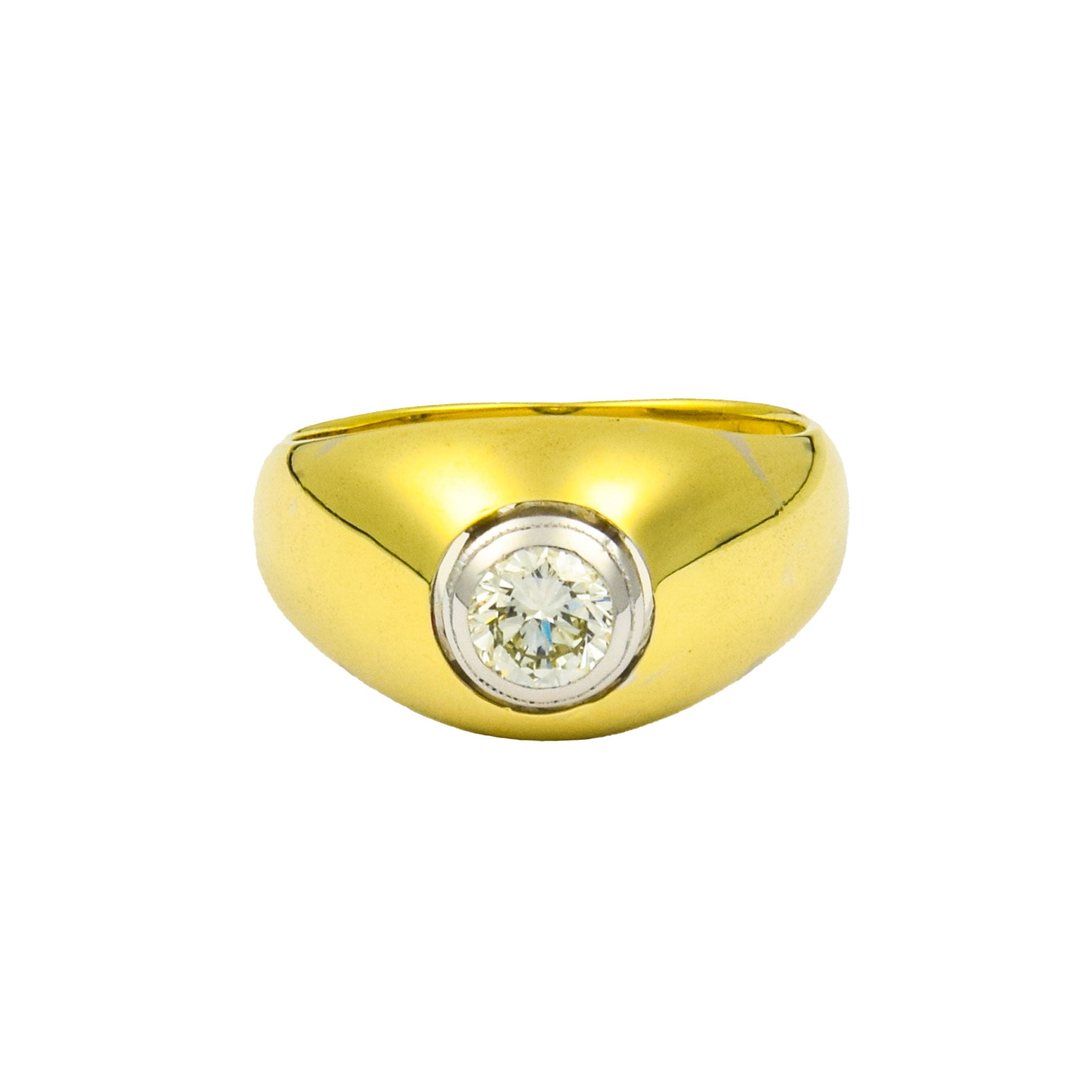 Bei dem Schmuckstück handelt es sich um einen Bandring aus 585 Gelb- und Weißgold mit einem Brillanten von ca. 0,53 ct in der Qualität leicht getöntes Weiß mit sehr, sehr kleinen Einschlüssen (TCr/vvs).