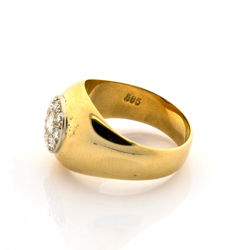 Bei dem Schmuckstück handelt es sich um einen Bandring aus 585 Gelbgold mit einem Brillanten von ca. 0,25 ct in der Qualität Weiß mit kleinen Einschlüssen (W/si) und acht Brillanten von zusammen ca. 0,4 ct in der Qualität Weiß mit kleinen Einschlüssen (W/si).