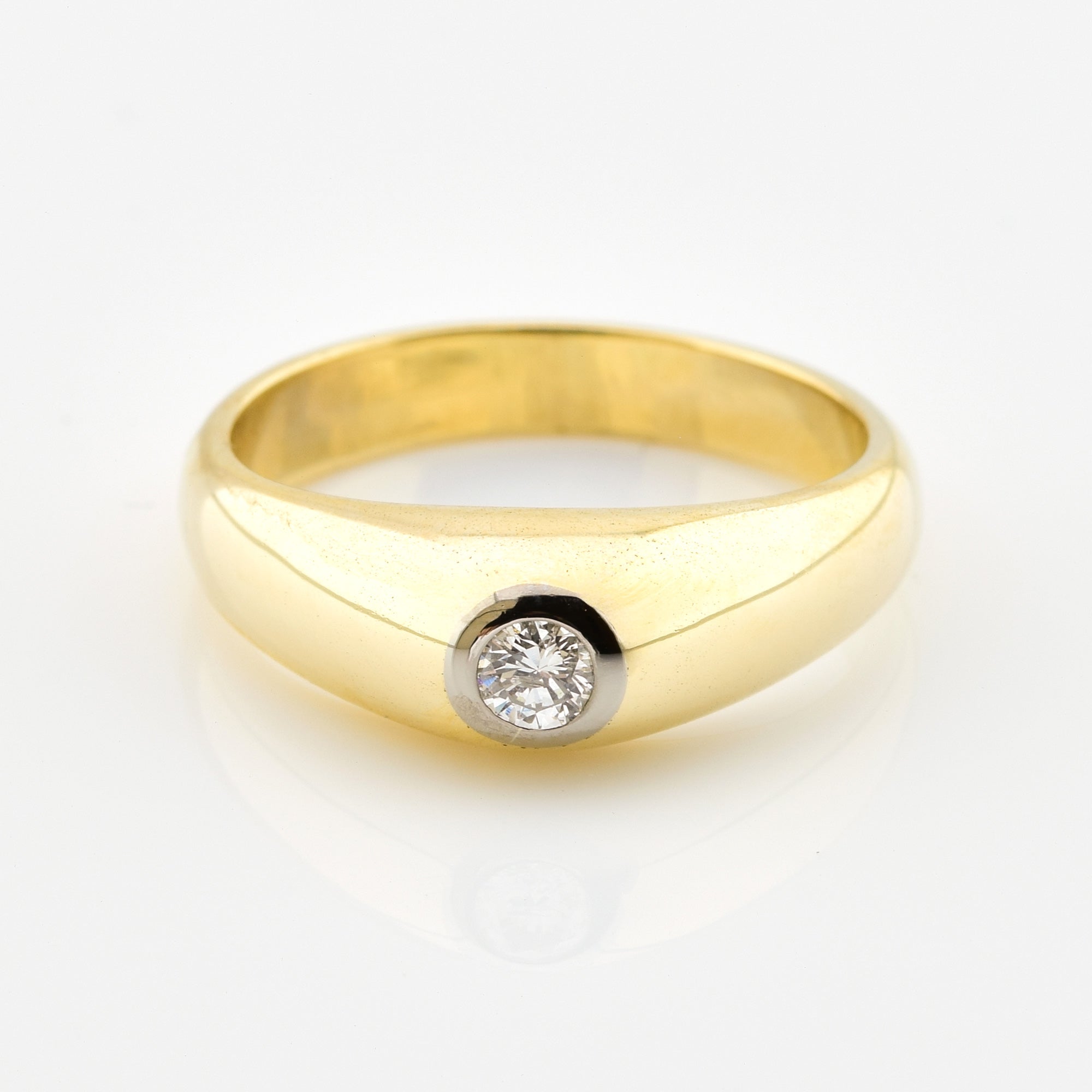 Bei dem Schmuckstück handelt es sich um einen Bandring aus 585 Gelbgold mit einem Brillanten von ca. 0,13 ct in der Qualität Weiß mit kleinen Einschlüssen (W/si).