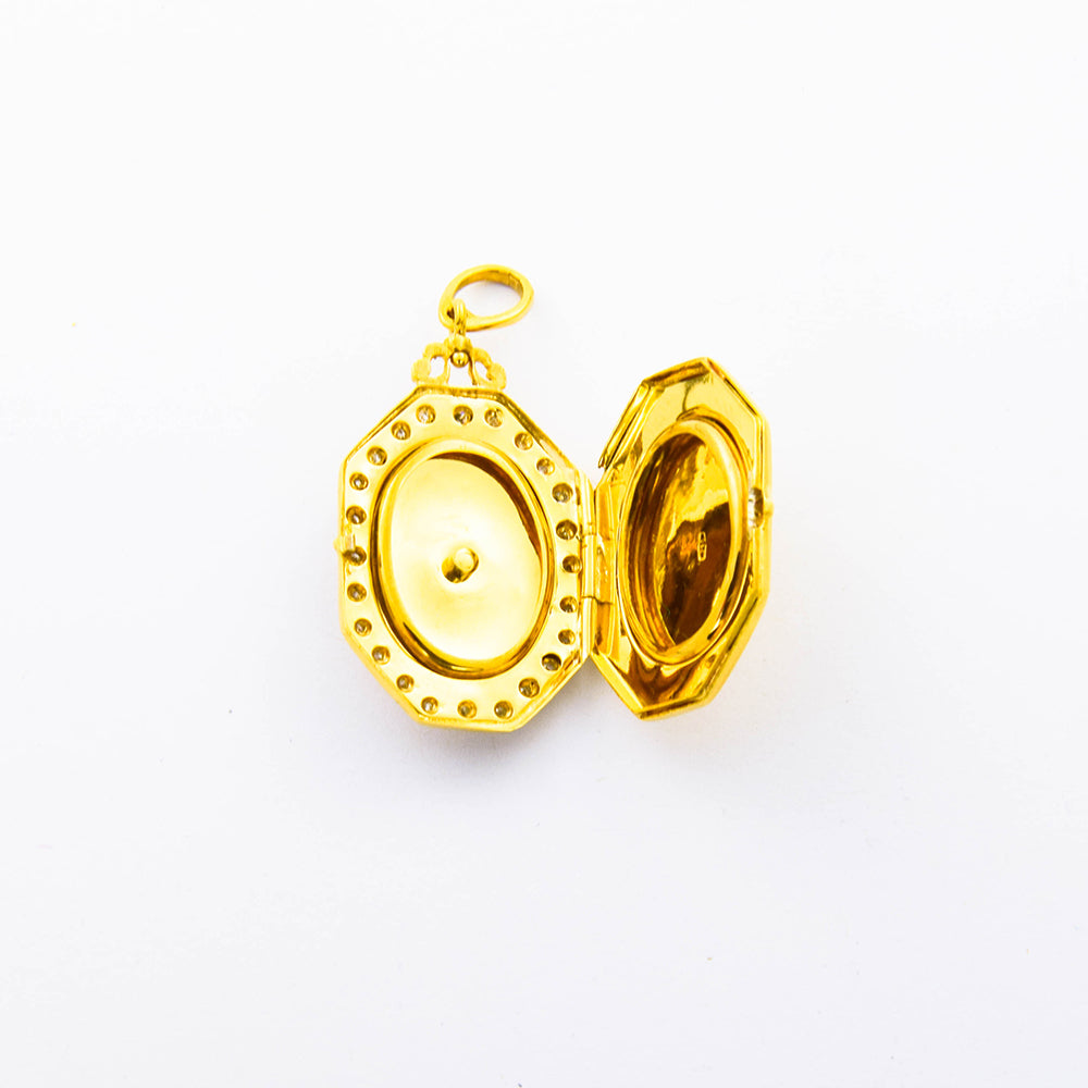 Bei dem Schmuckstück handelt es sich um ein Medaillon aus 750 Gelb- und Weißgold mit 31 Diamanten im 8/8 Schliff von zusammen ca. 0,31 ct in der Qualität Weiß mit kleinen Einschlüssen (W/si).