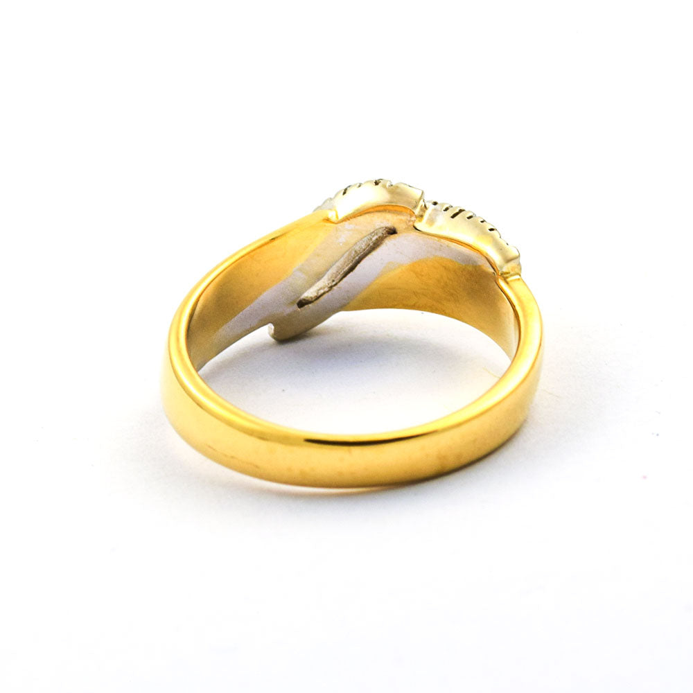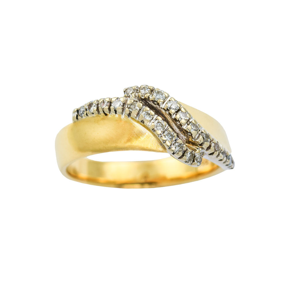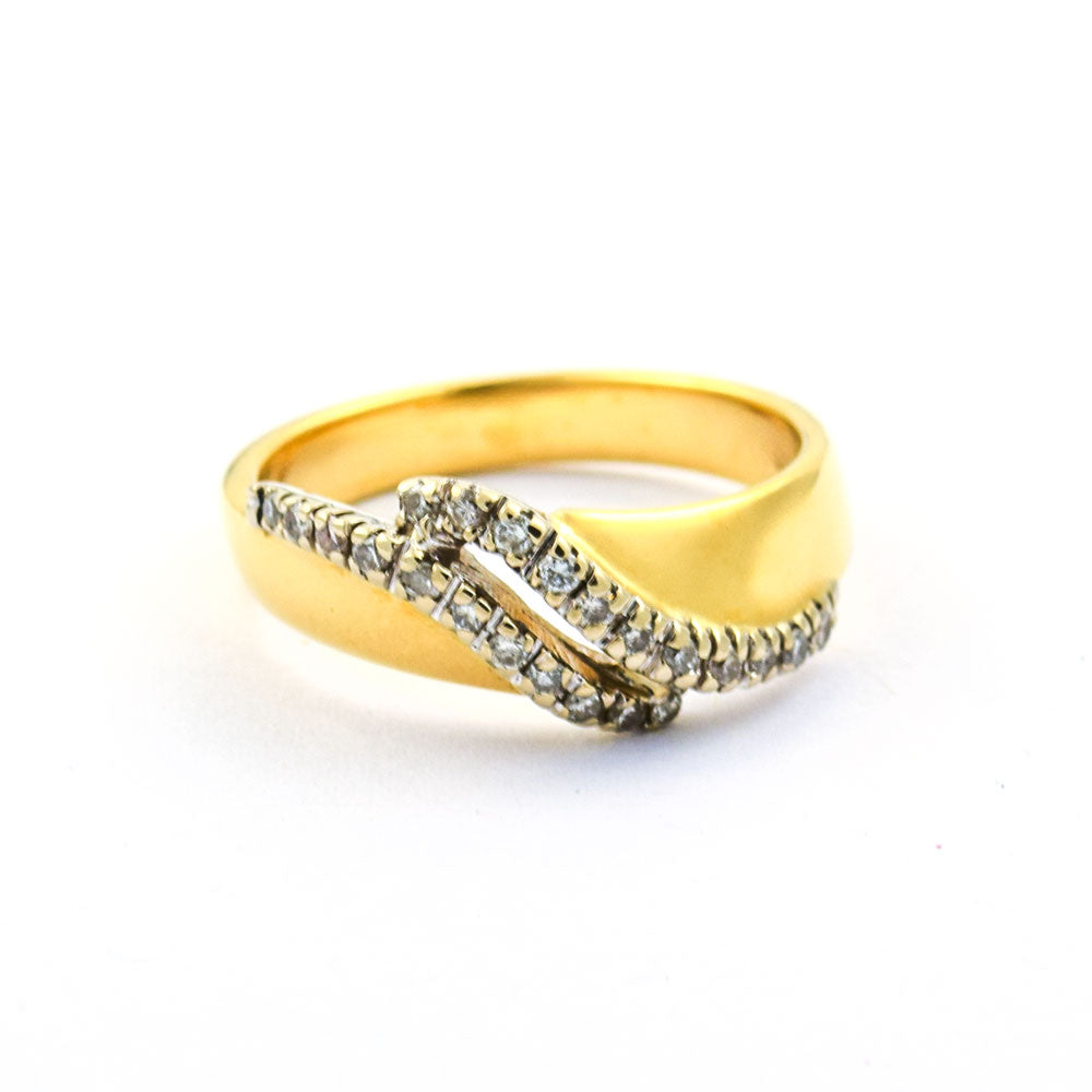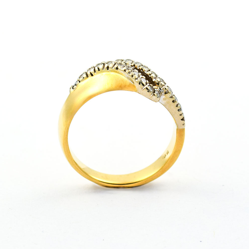 Bei dem Schmuckstück handelt es sich um einen Ring aus 585 Gelb- und Weißgold mit 22 Brillanten von zusammen ca. 0,22 ct in der Qualität Weiß und piqué 1 (W/p 1).