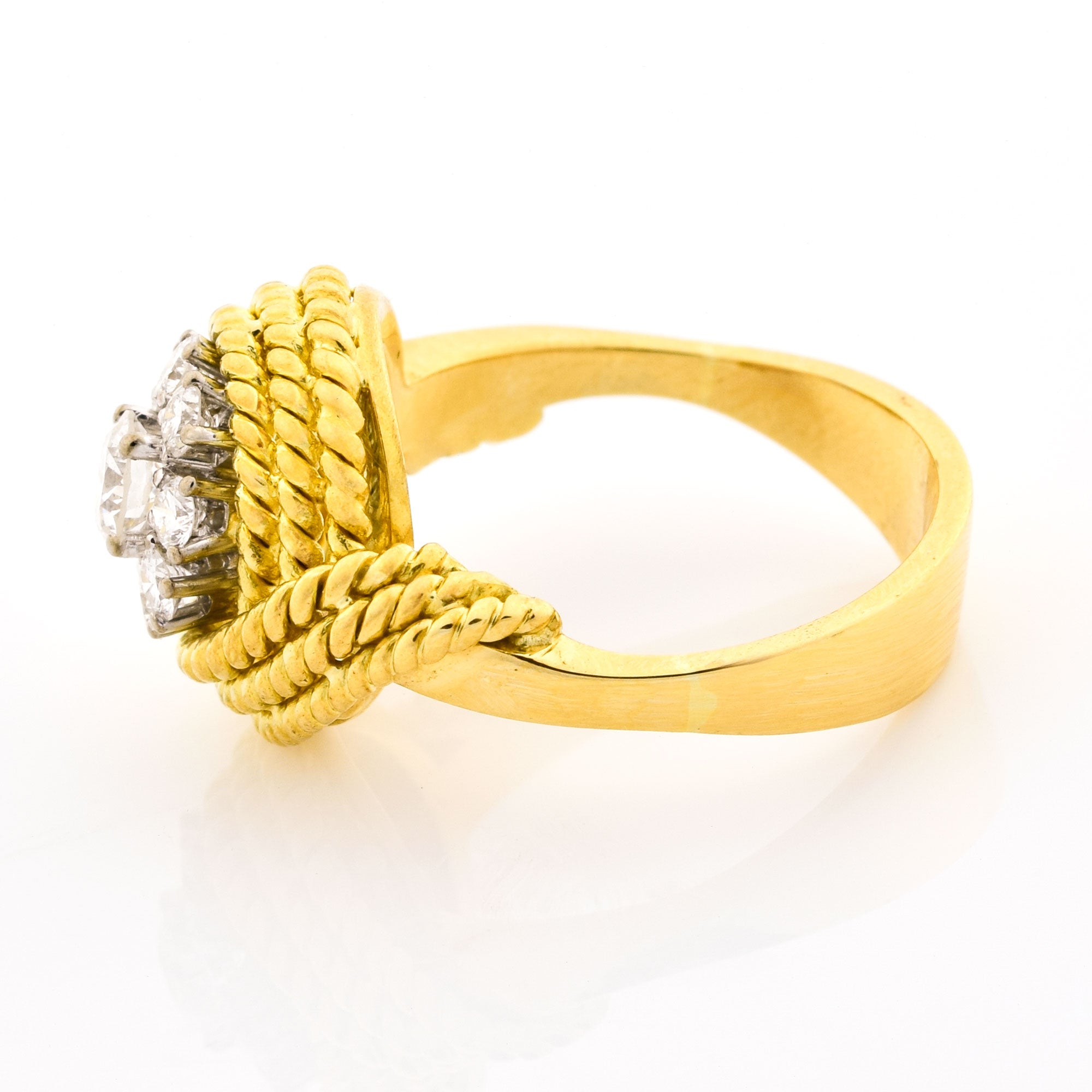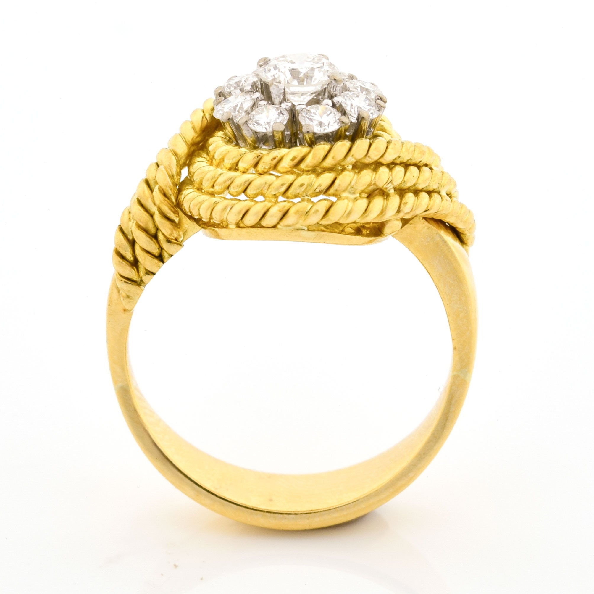 Bei dem Schmuckstück handelt es sich um einen Ring aus 750 Gelb- und Weißgold mit acht Brillanten von zusammen ca. 0,32 ct in der Qualität Weiß mit sehr kleinen Einschlüssen (W/vs) und einem Brillanten von ca. 0,25 ct in der Qualität Weiß mit sehr kleinen Einschlüssen (W/vs).