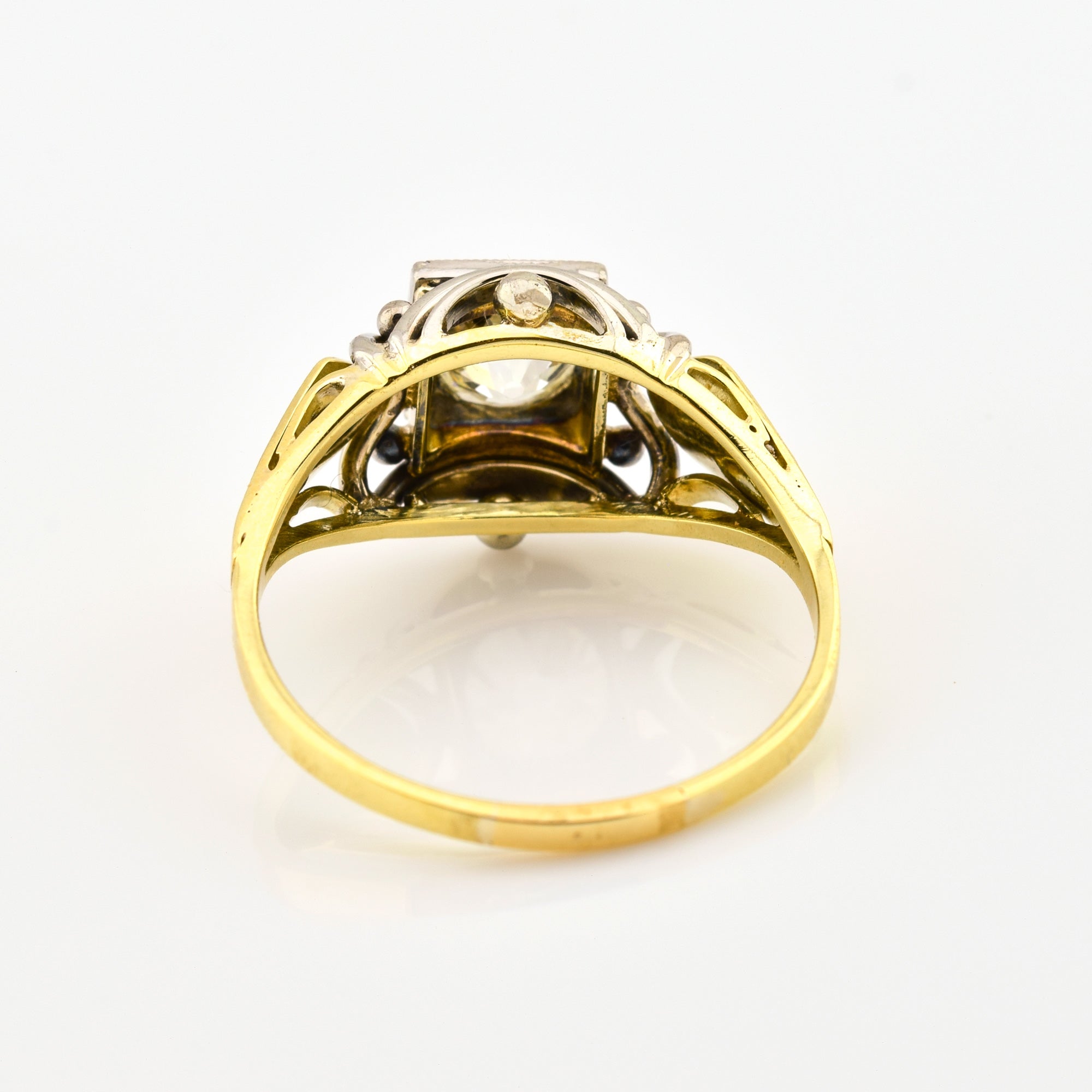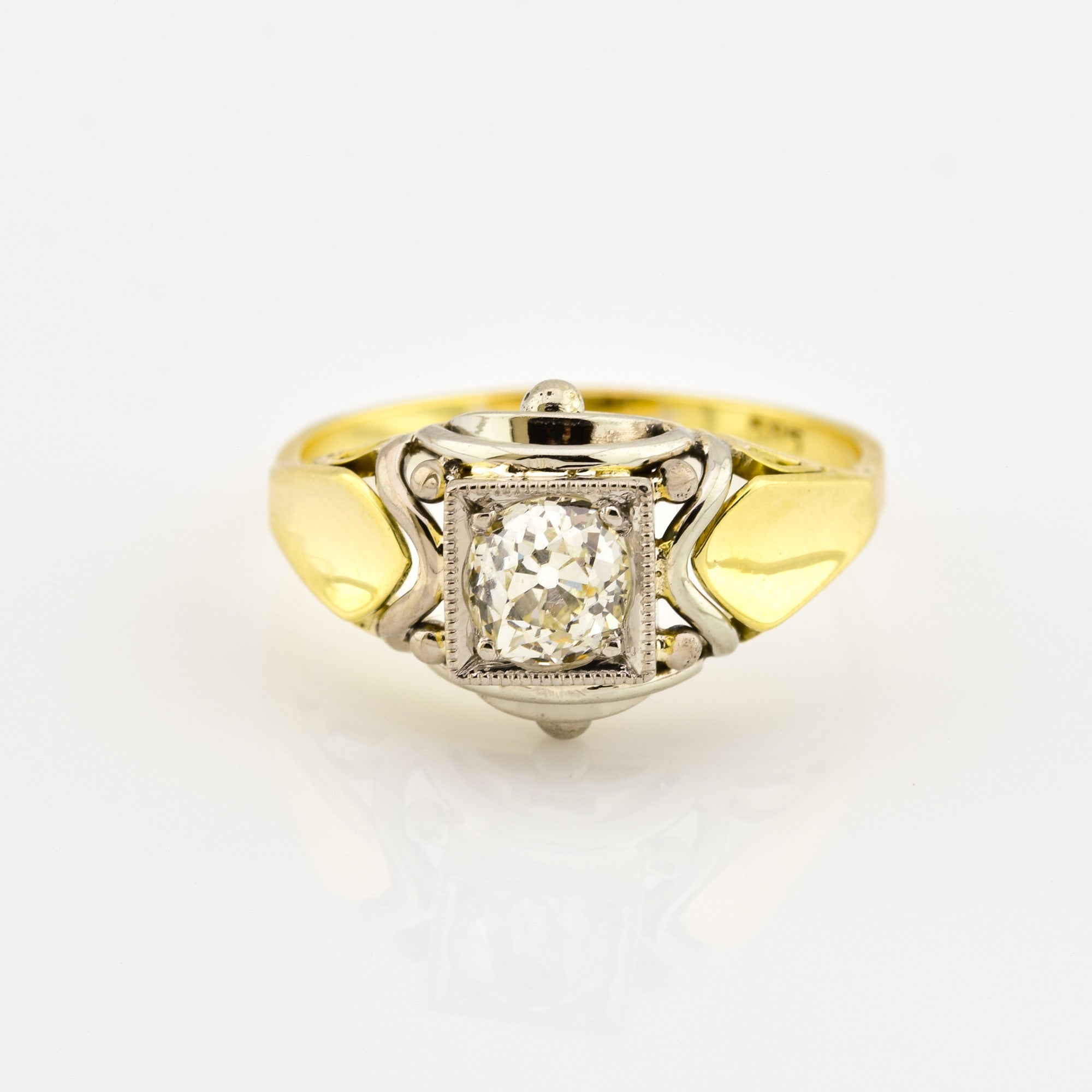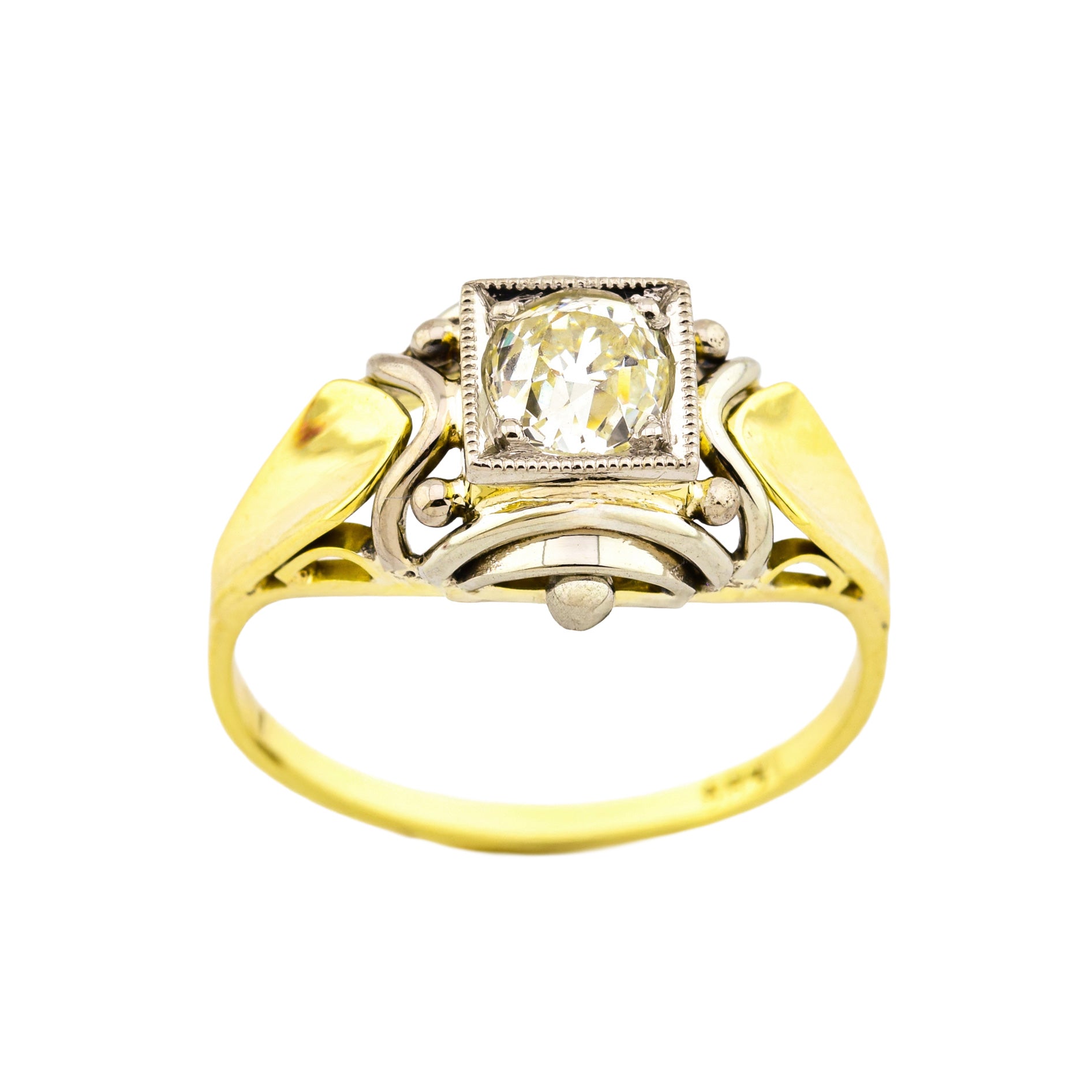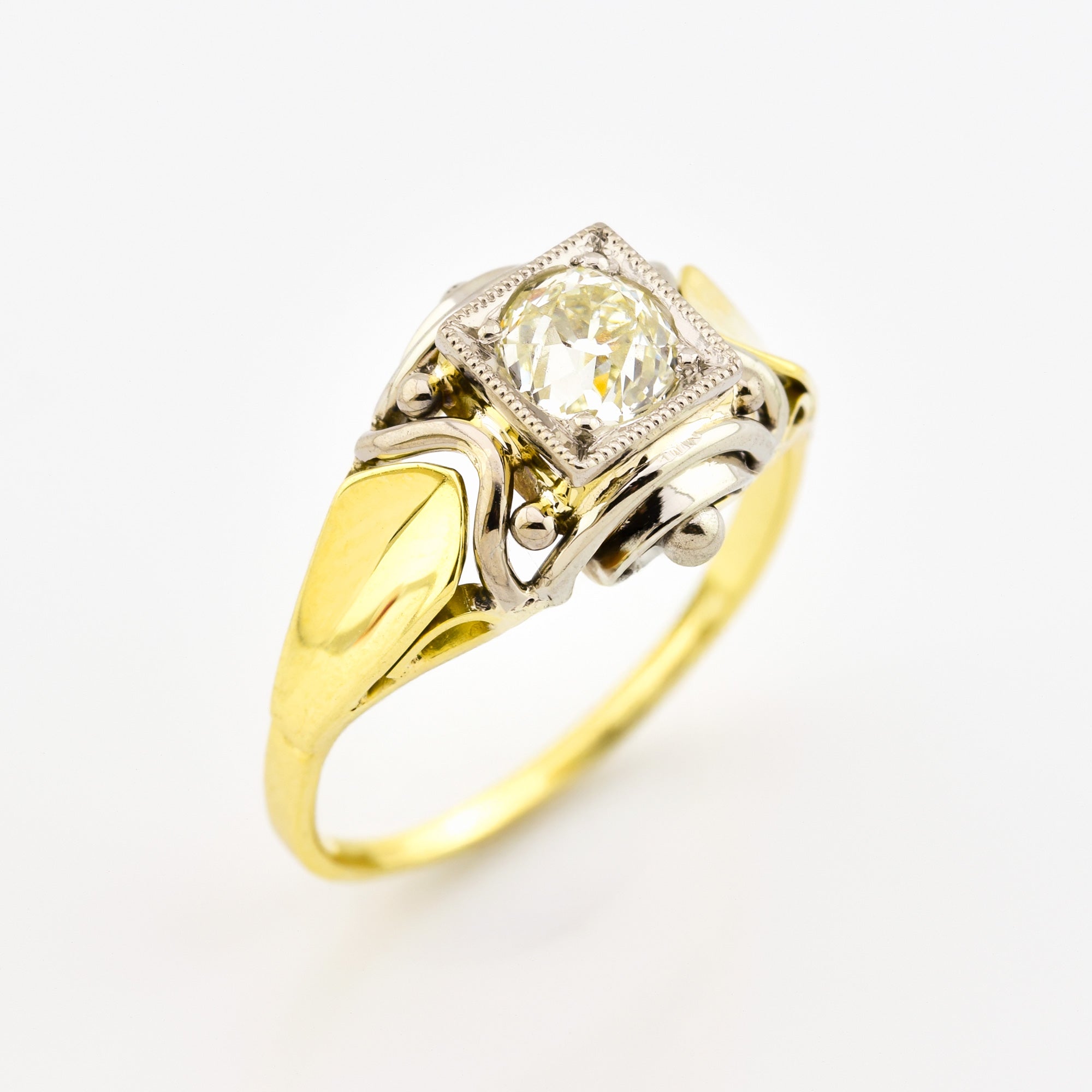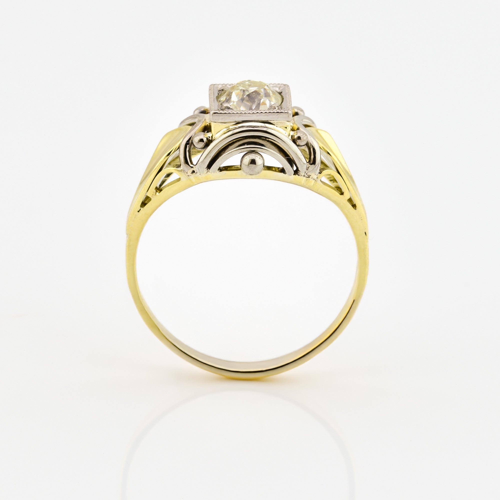 Bei dem Schmuckstück handelt es sich um einen in Handarbeit gefertigten Ring aus 585 Gelb- und Weißgold mit einem Brillanten im Altschliff von ca. 0,75 ct in der Qualität getöntes Weiß mit sehr kleinen Einschlüssen (Cr/vs).