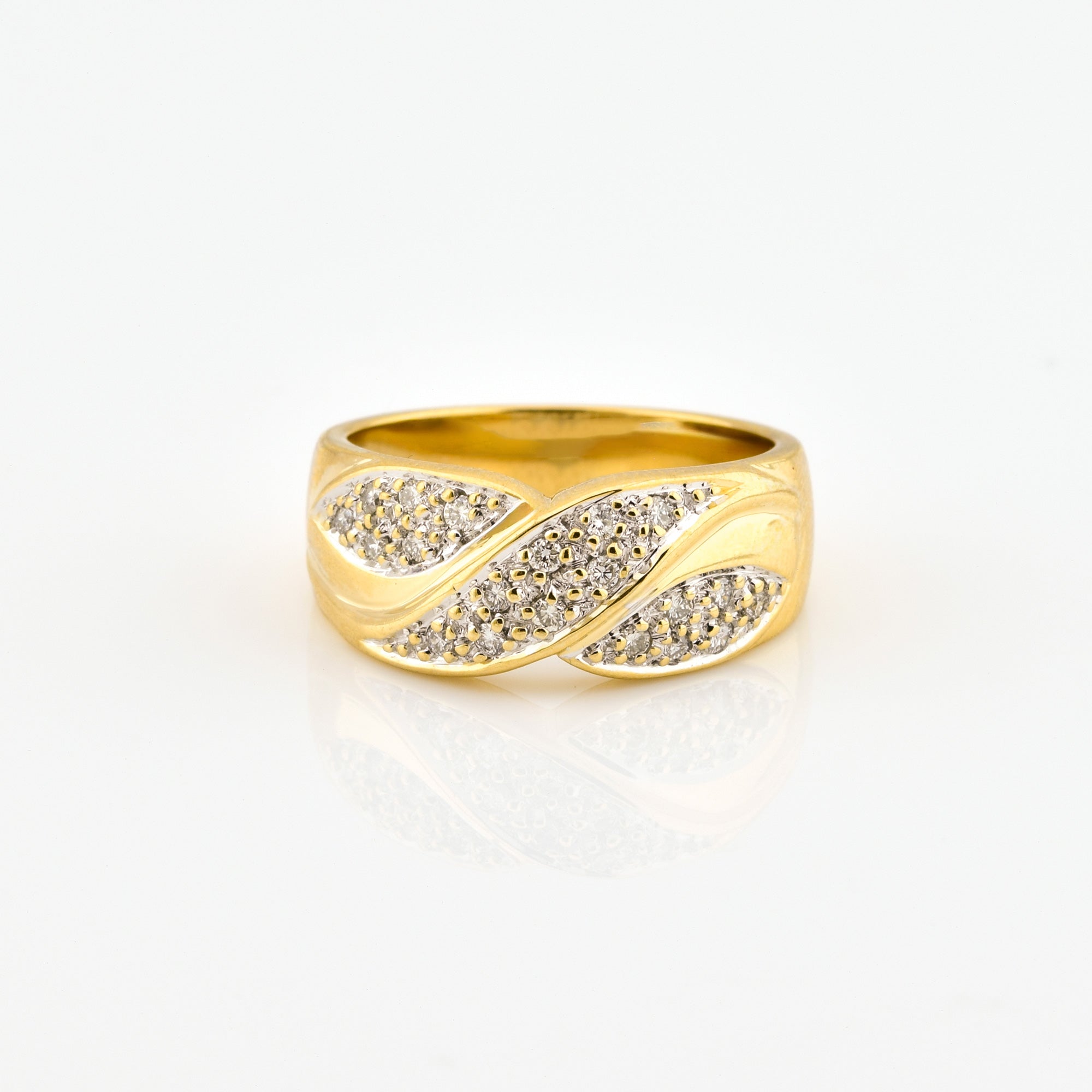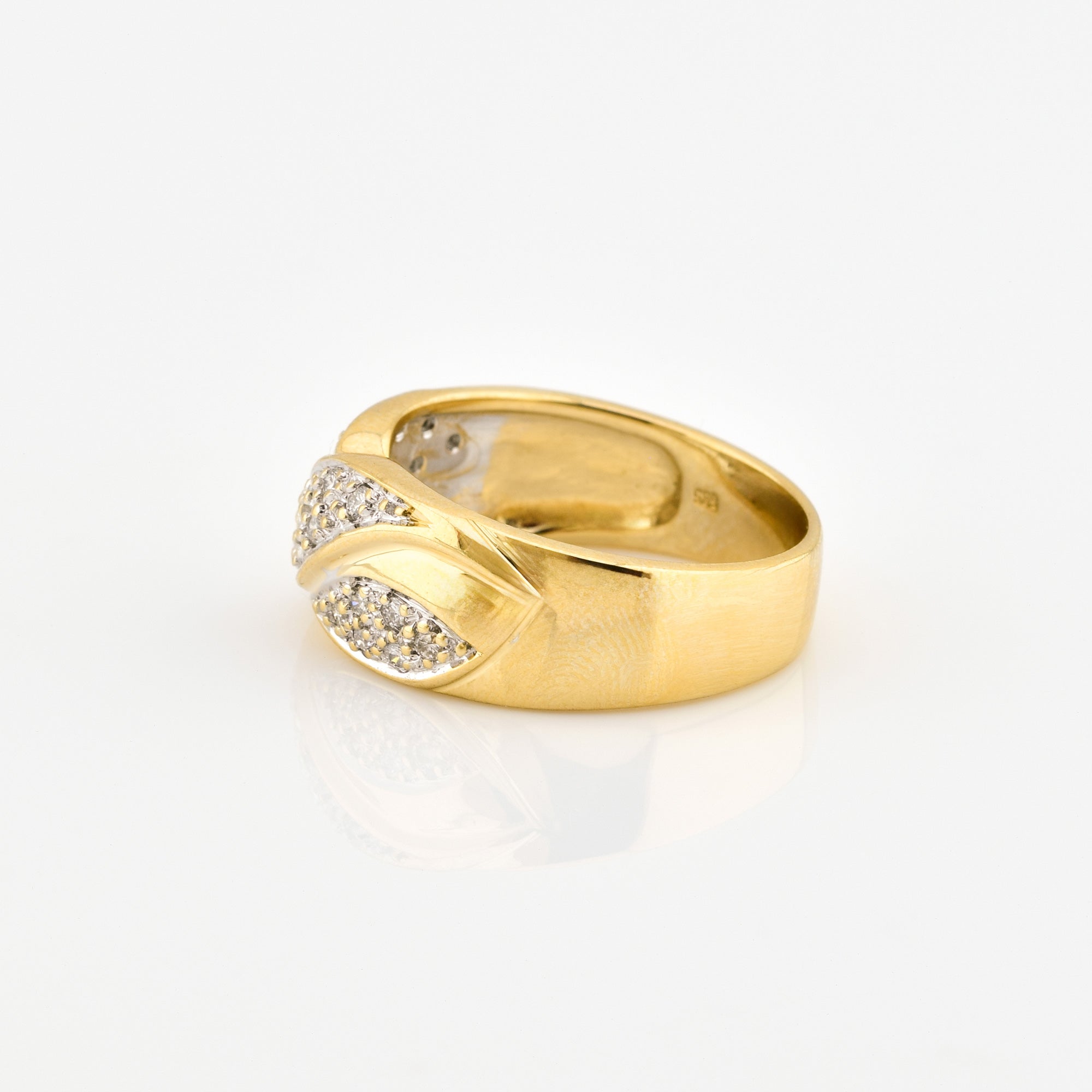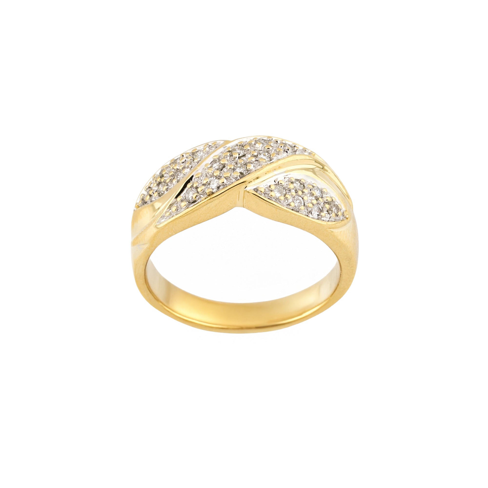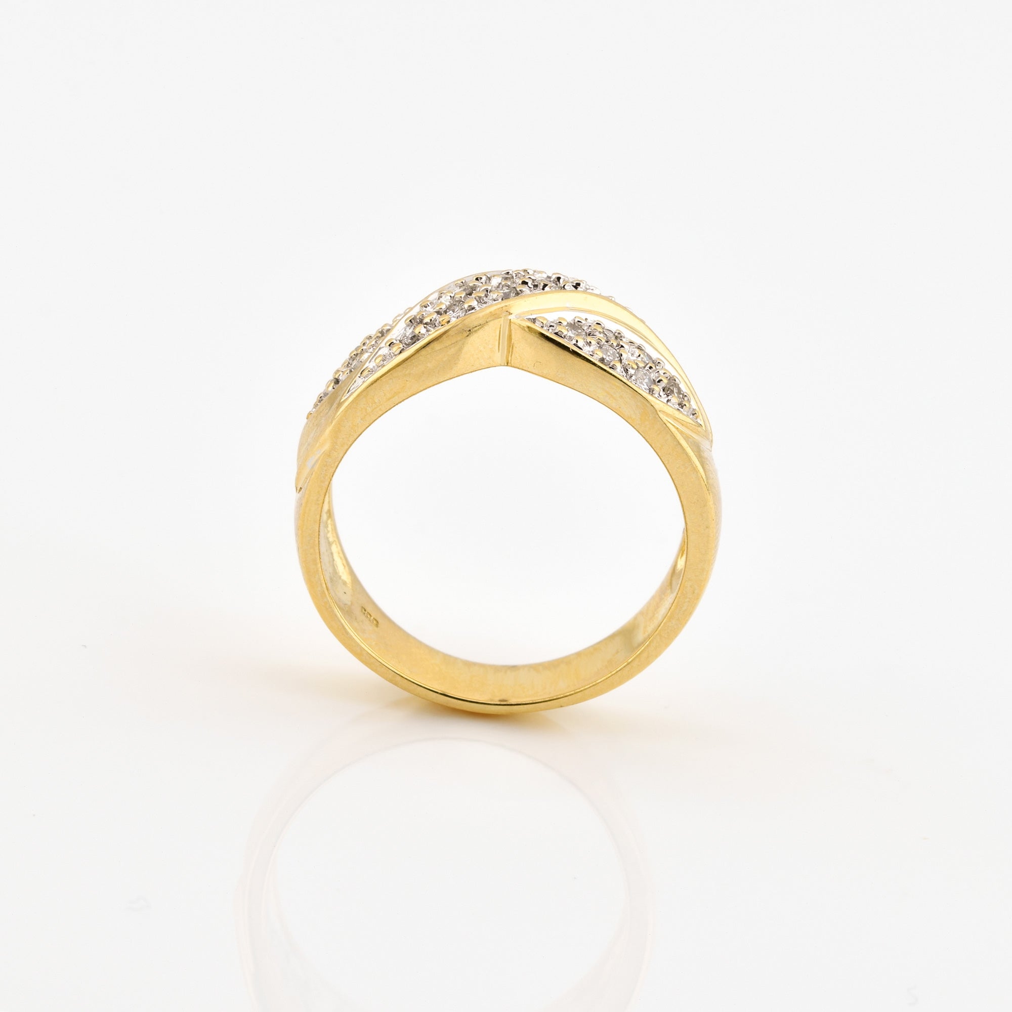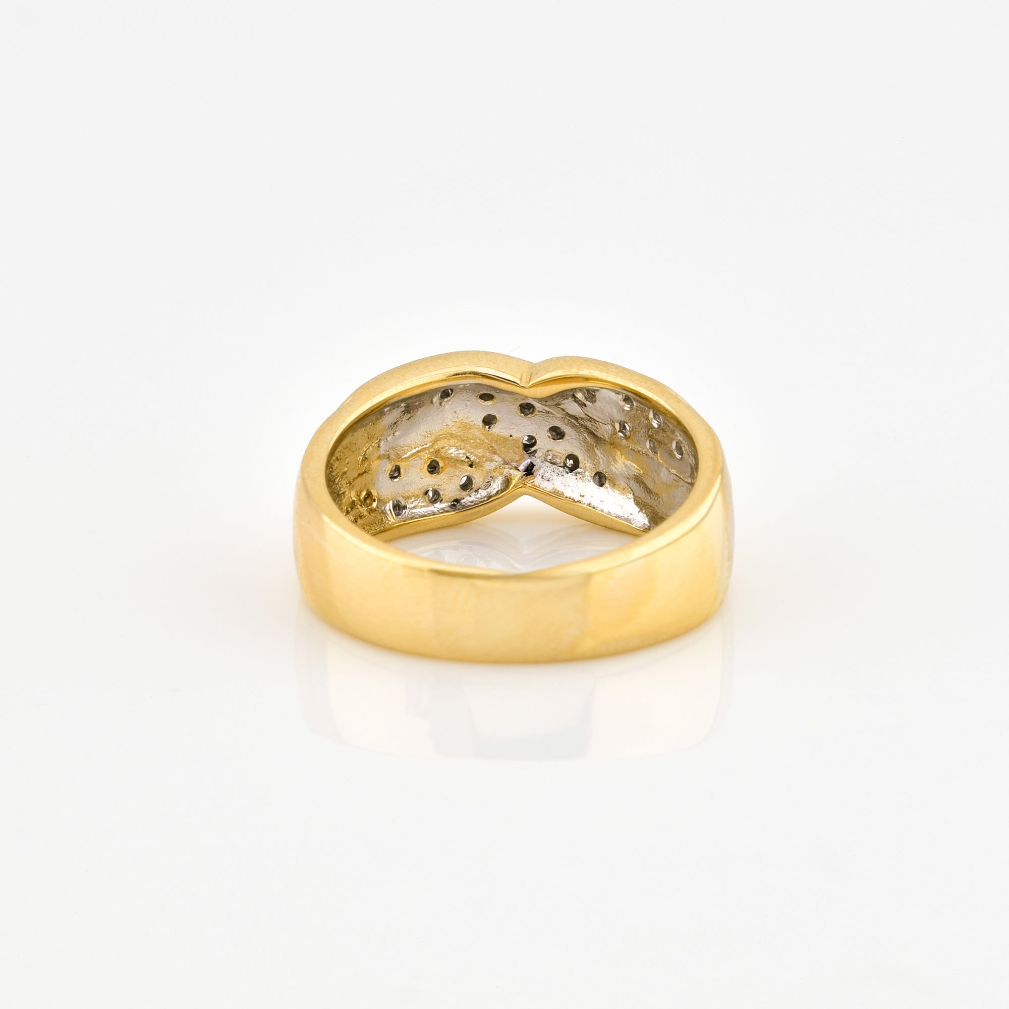 Bei dem Schmuckstück handelt es sich um einen Ring aus 585 Gelb- und Weißgold mit 20 Brillanten von zusammen ca. 0,1 ct in der Qualität Weiß mit kleinen Einschlüssen (W/si)