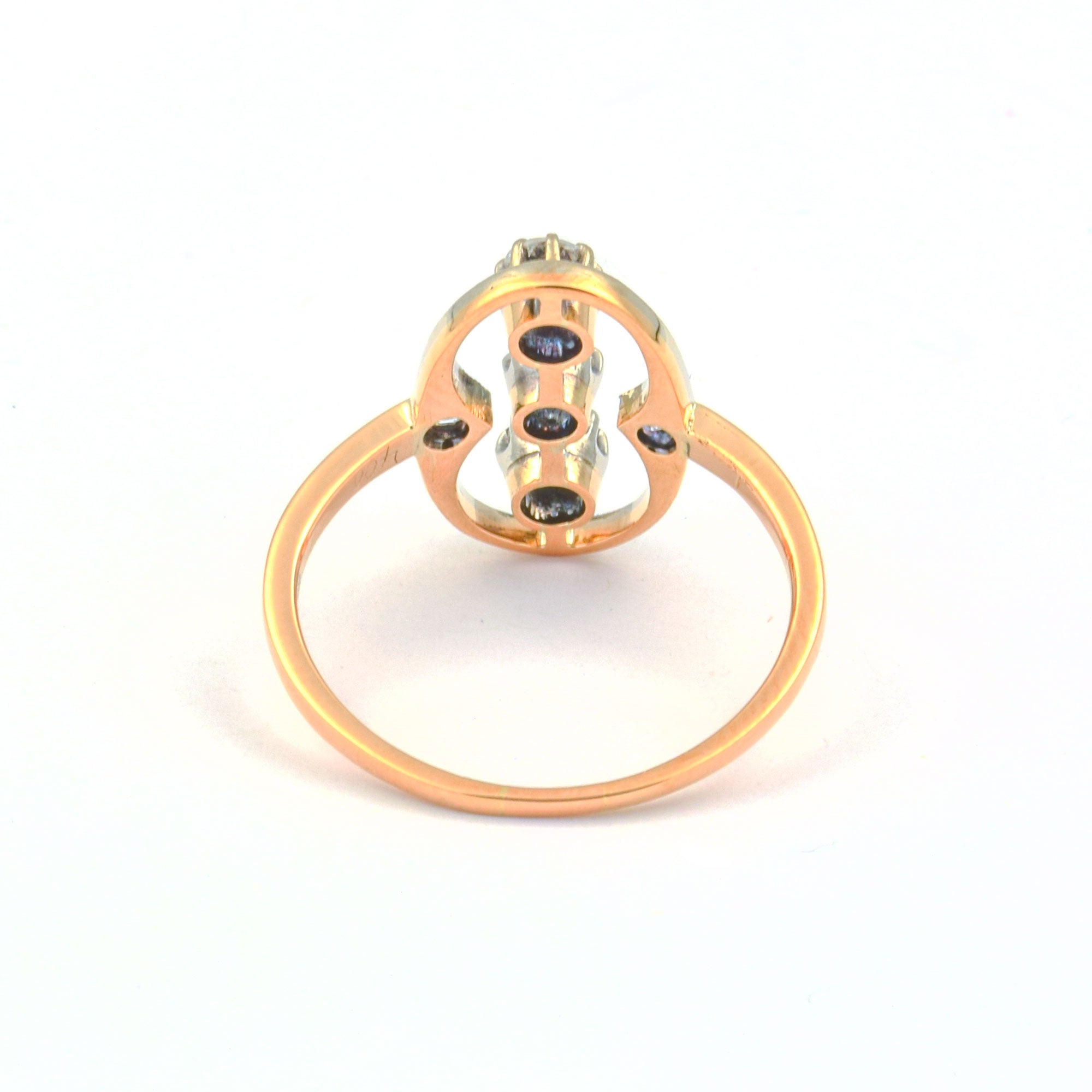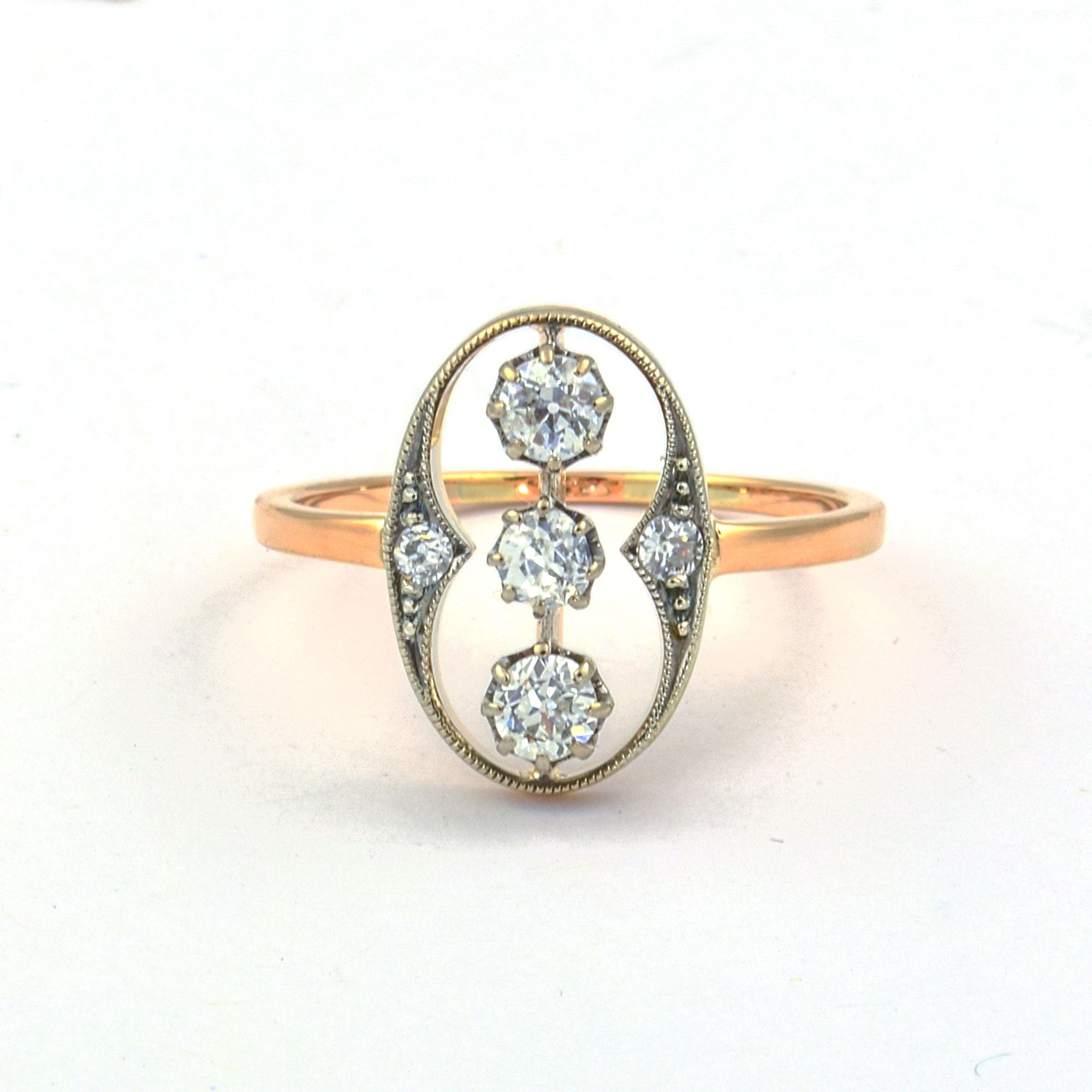 Bei dem Schmuckstück handelt es sich um einen Ring aus 585 Gelb- und Weißgold mit fünf Brillanten im Altschliff von zusammen ca. 0,4 ct in der Qualität Weiß mit kleinen Einschlüssen (W/si) aus der Zeit des Jugendstils.