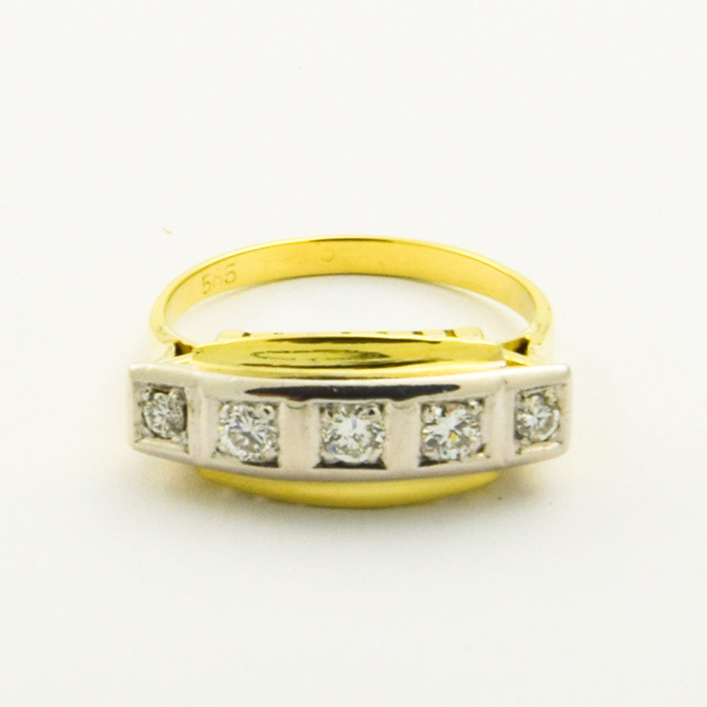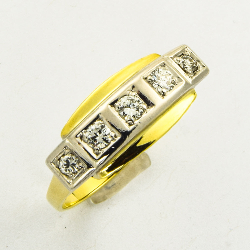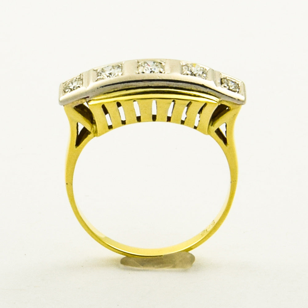 Bei dem Schmuckstück handelt es sich um einen Ring aus 585 Gelb- und Weißgold mit fünf Brillanten von zusammen ca. 0,4 ct in der Qualität Weiß mit kleinen Einschlüssen (W/si).
