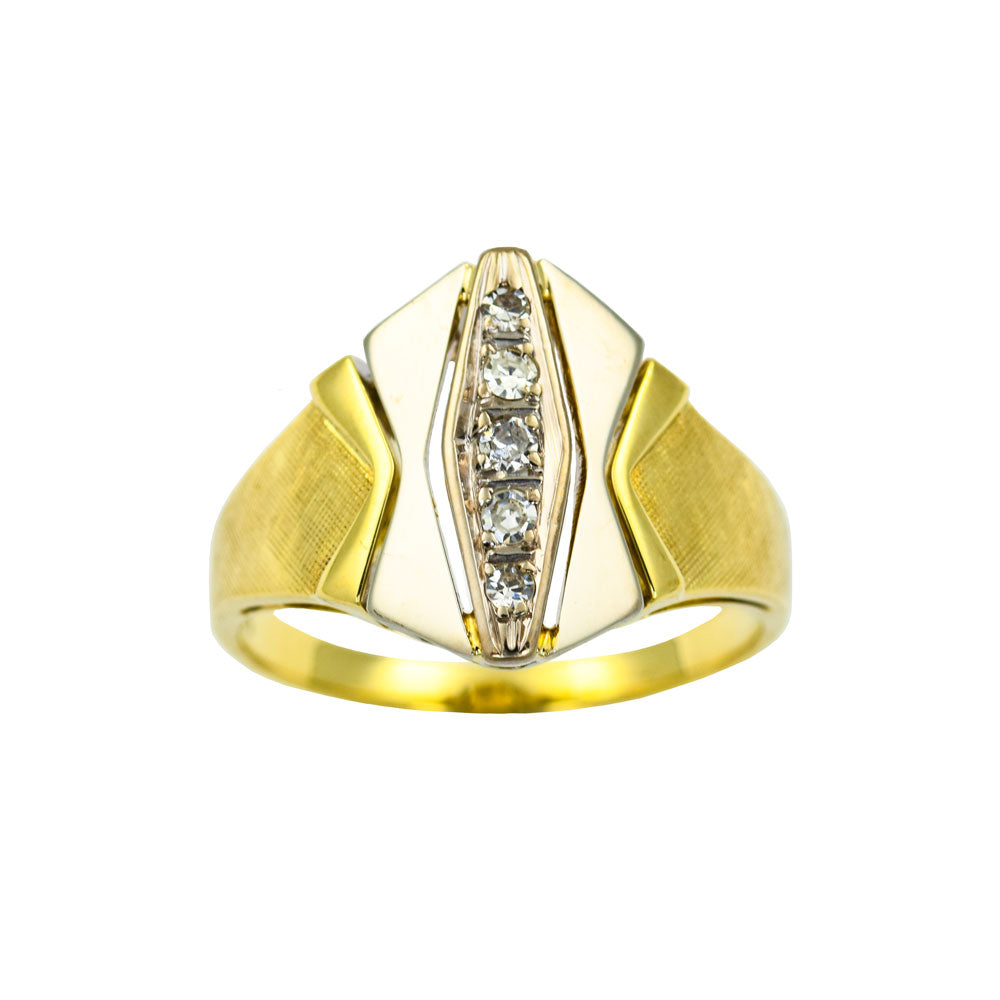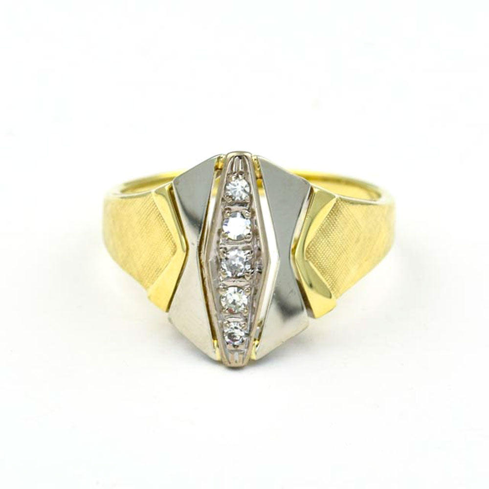 Bei dem Schmuckstück handelt es sich um einen Ring aus 585 Gelb- und Weißgold mit fünf Diamanten im 8/8 Schliff von zusammen ca. 0,13 ct in der Qualität Weiß mit kleinen Einschlüssen (W/si).