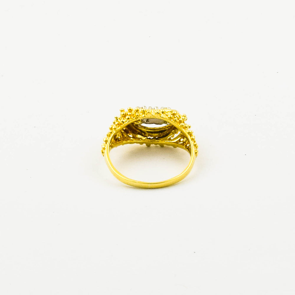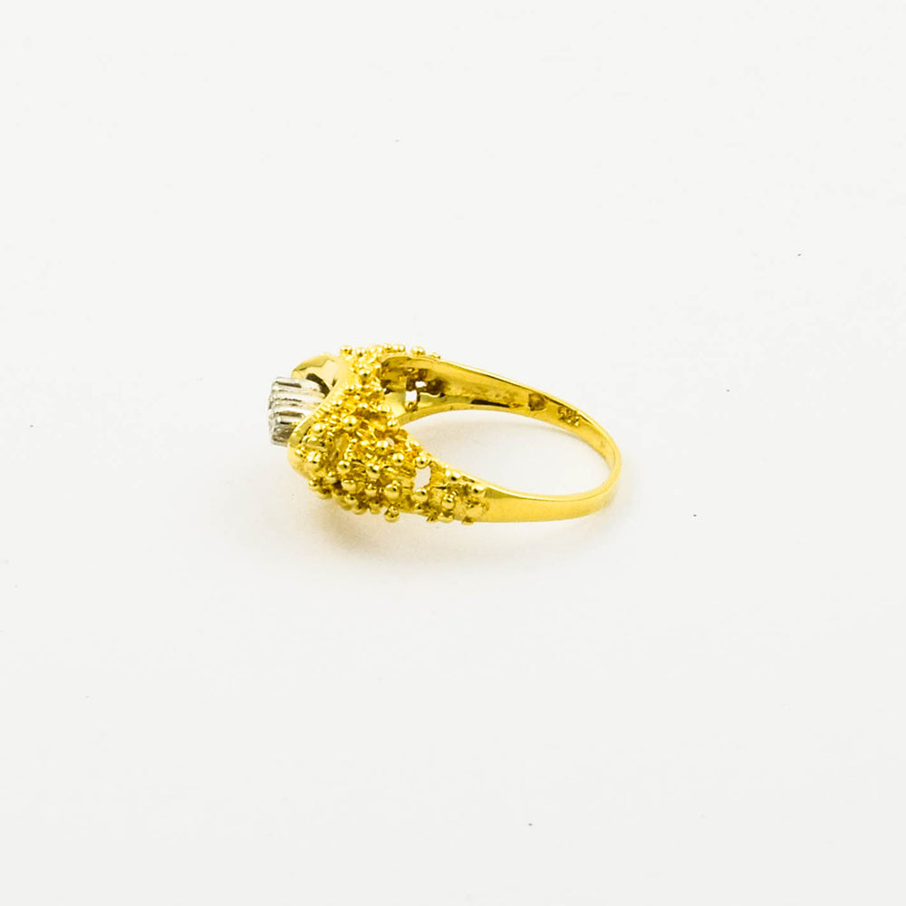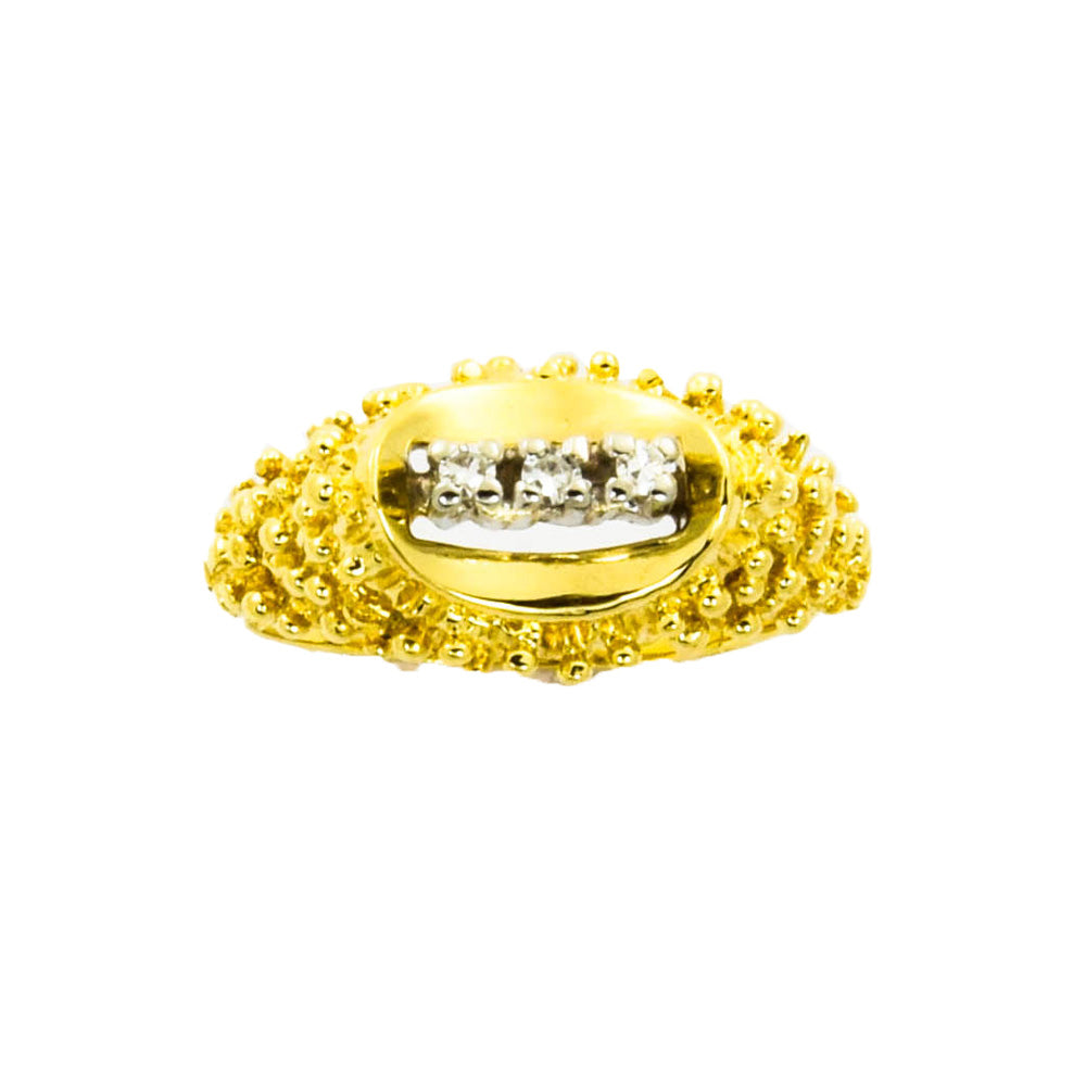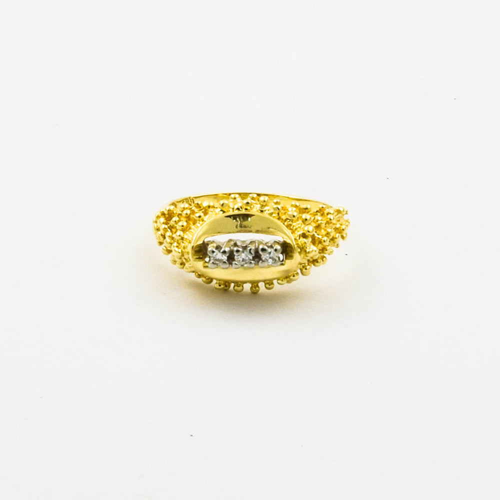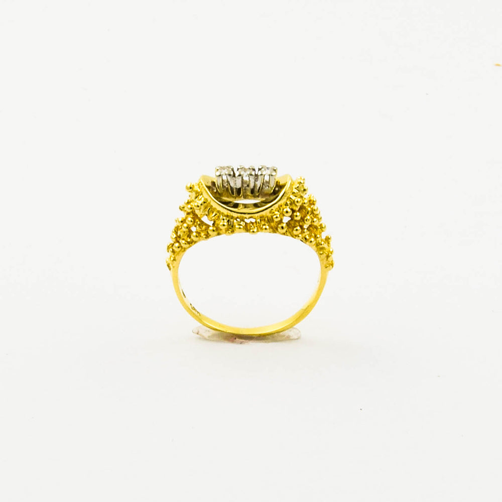 Bei dem Schmuckstück handelt es sich um einen Ring aus 585 Gelb- und Weißgold mit drei Diamanten im 8/8 Schliff von zusammen ca. 0,03 ct in der Qualität Weiß mit kleinen Einschlüssen (W/si).