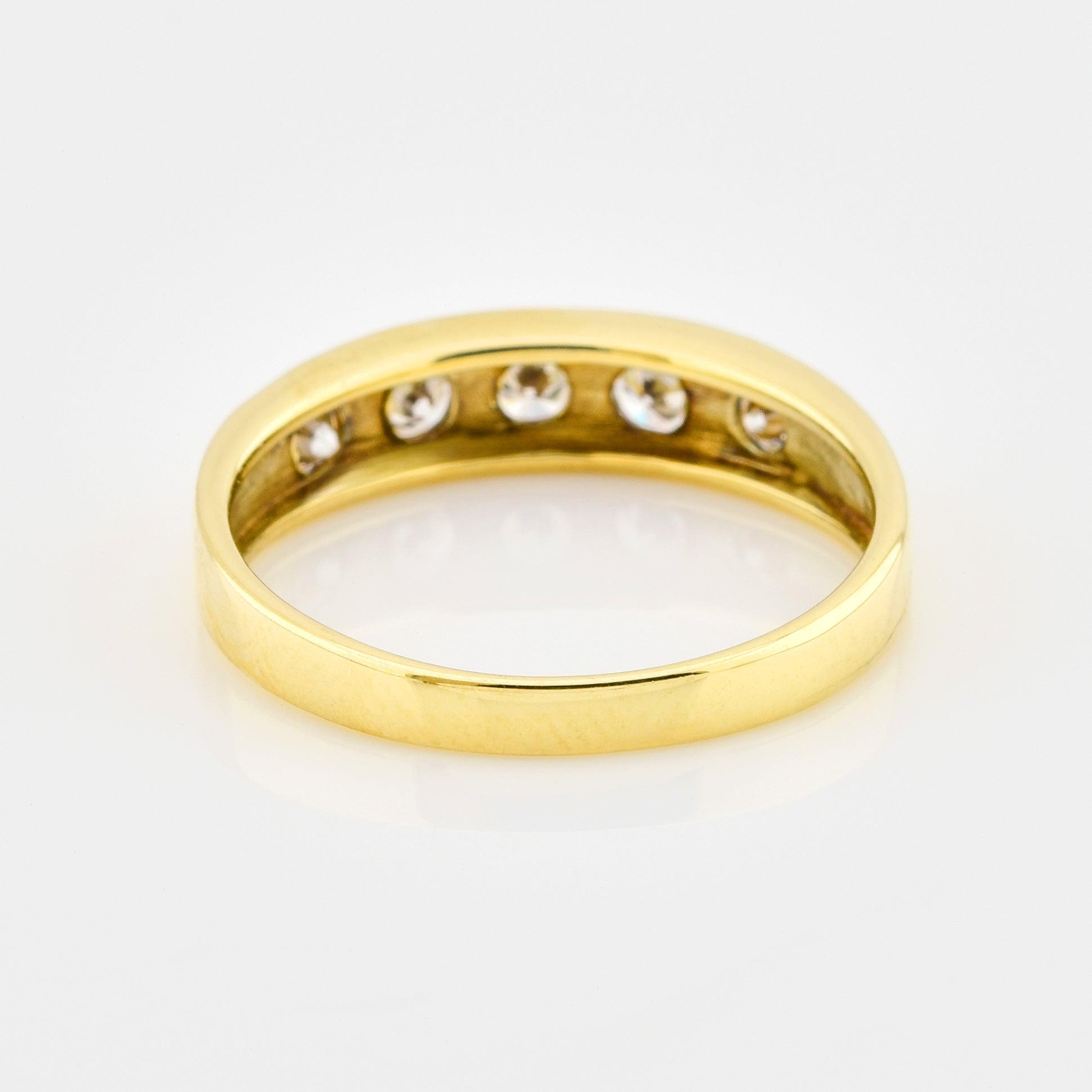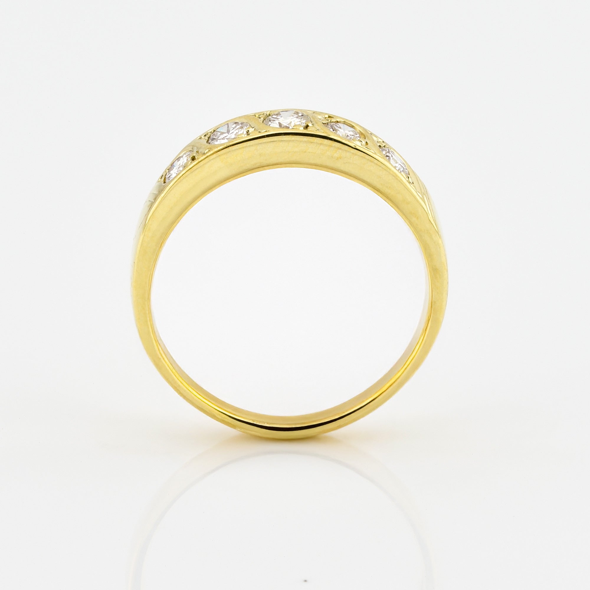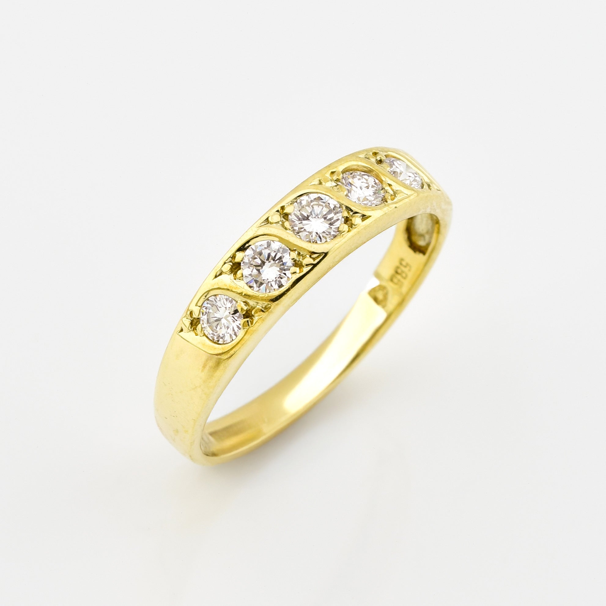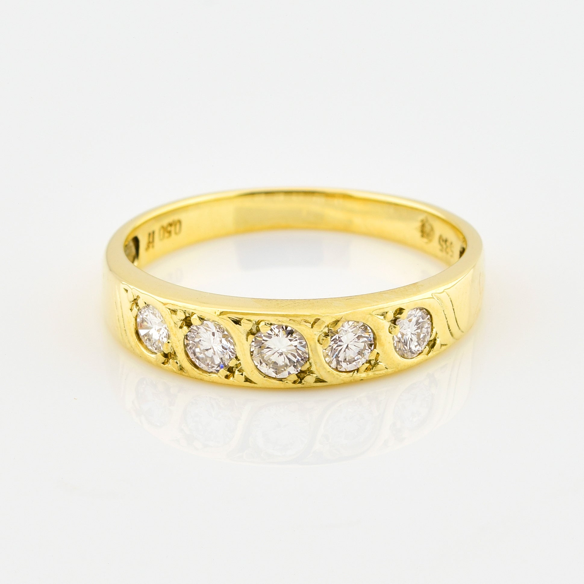 Bei dem Schmuckstück handelt es sich um einen Ring aus 585 Gelbgold mit fünf Brillanten von zusammen ca. 0,5 ct in der Qualität feines Weiß und lupenrein (TW/lupenrein).