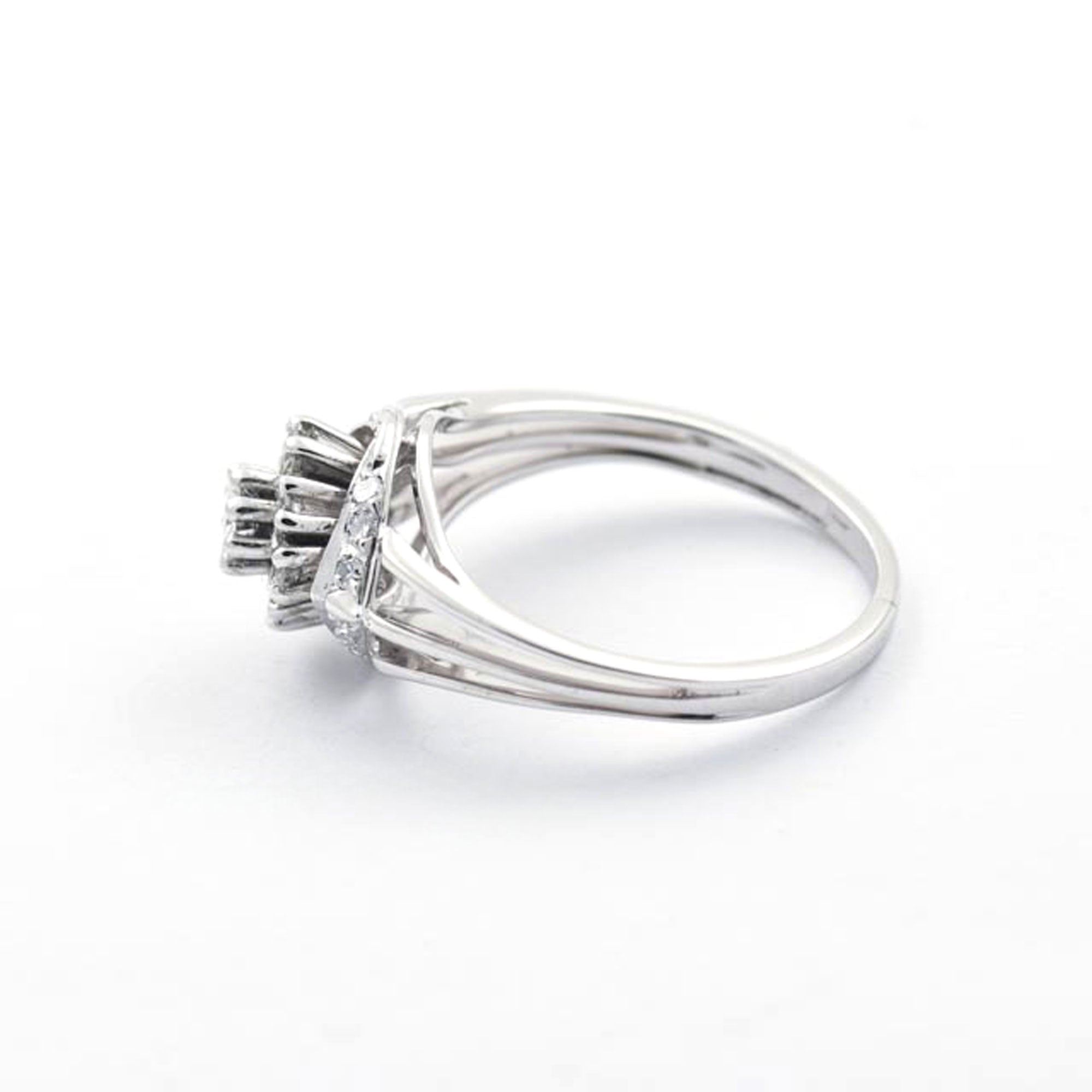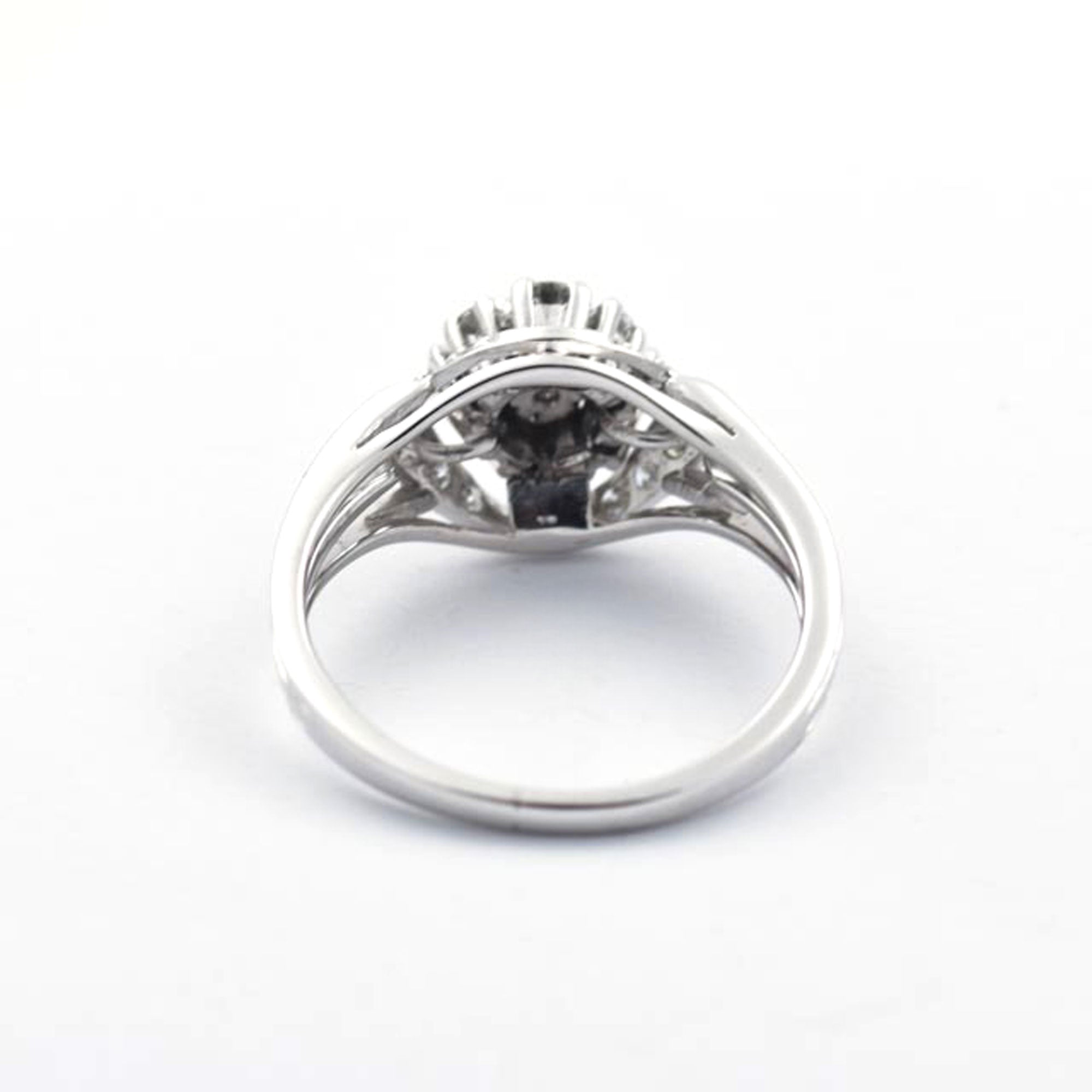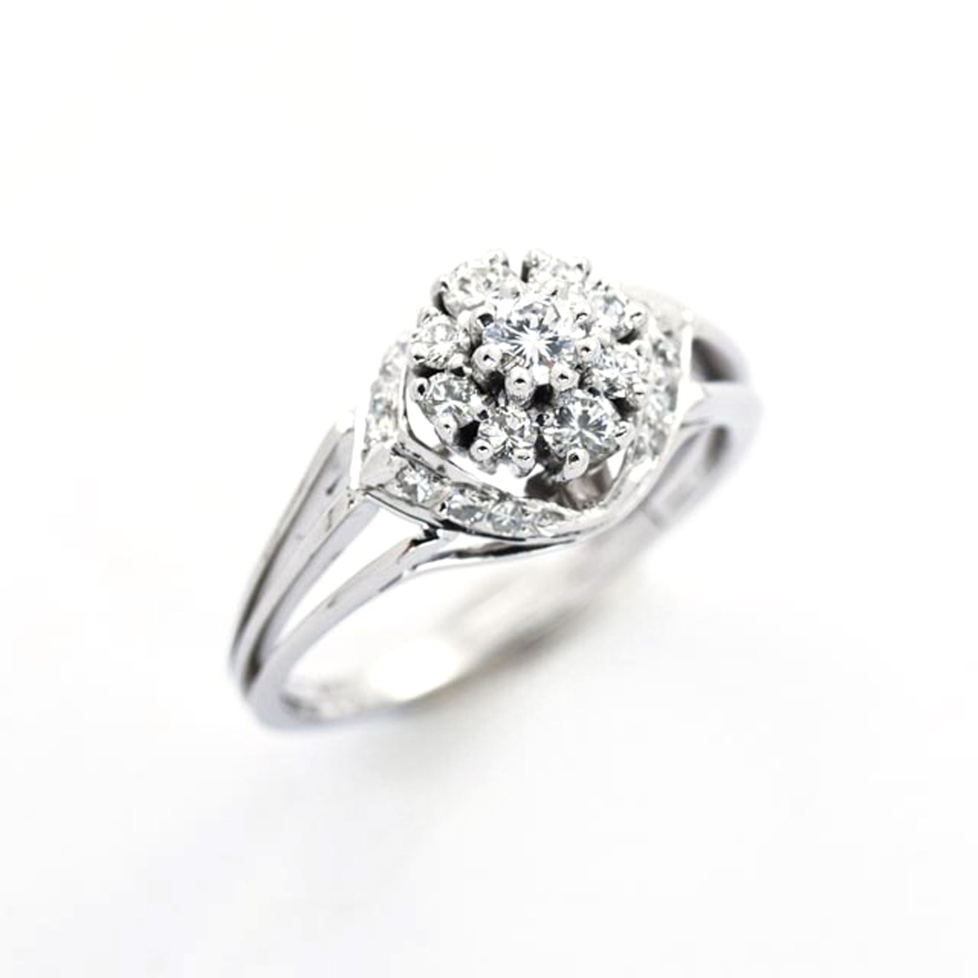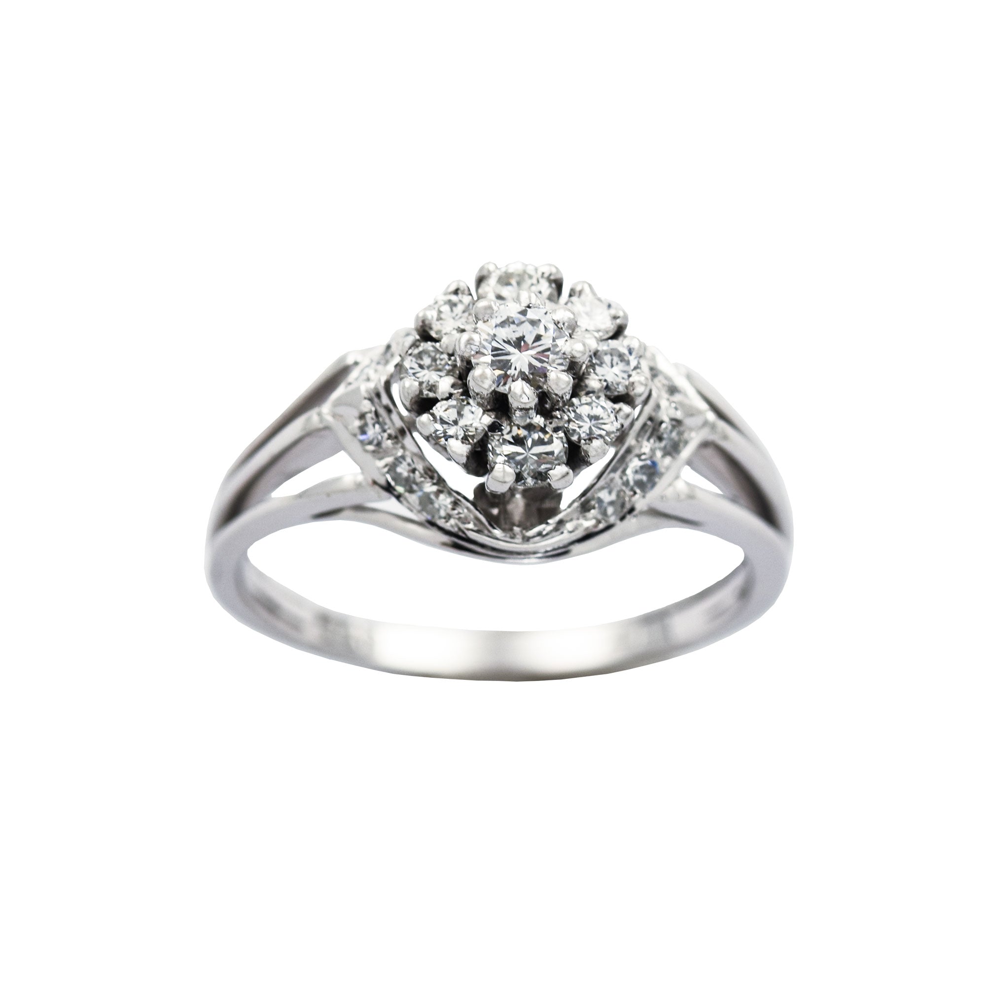 Bei dem Schmuckstück handelt es sich um einen Ring aus 750 Weißgold mit neun Brillanten von zusammen ca. 0,54 ct in der Qualität Weiß mit sehr kleinen Einschlüssen (W/vs) und sechs Diamanten im 8/8 Schliff von zusammen ca. 0,06 ct in der Qualität Weiß mit kleinen Einschlüssen (W/si).