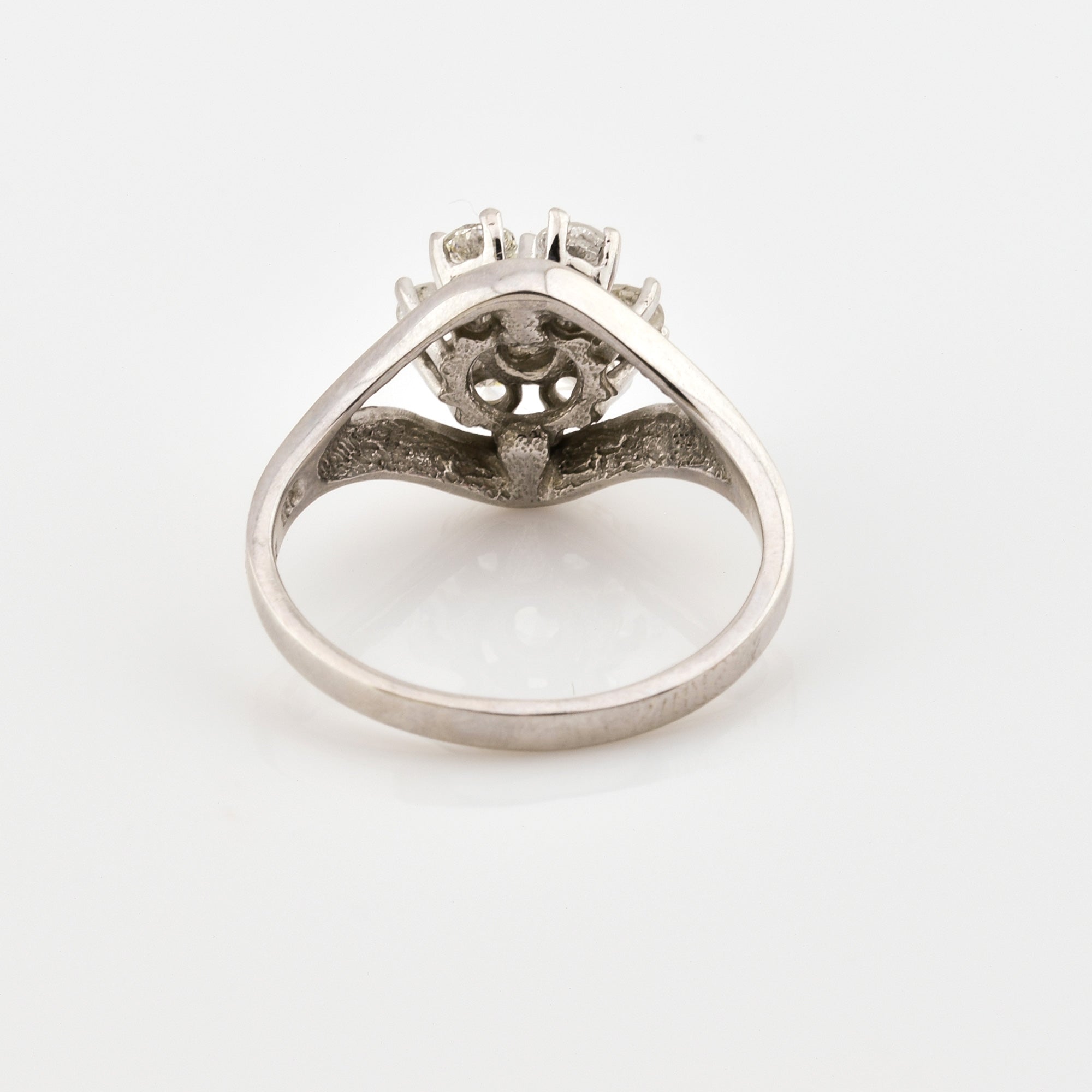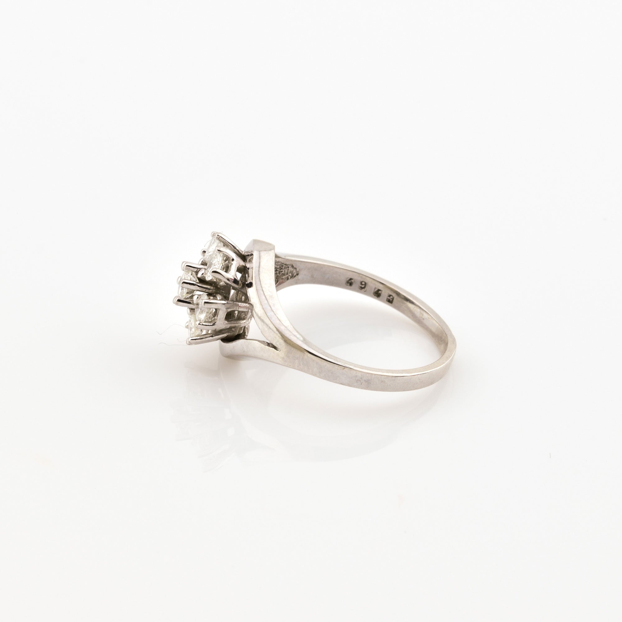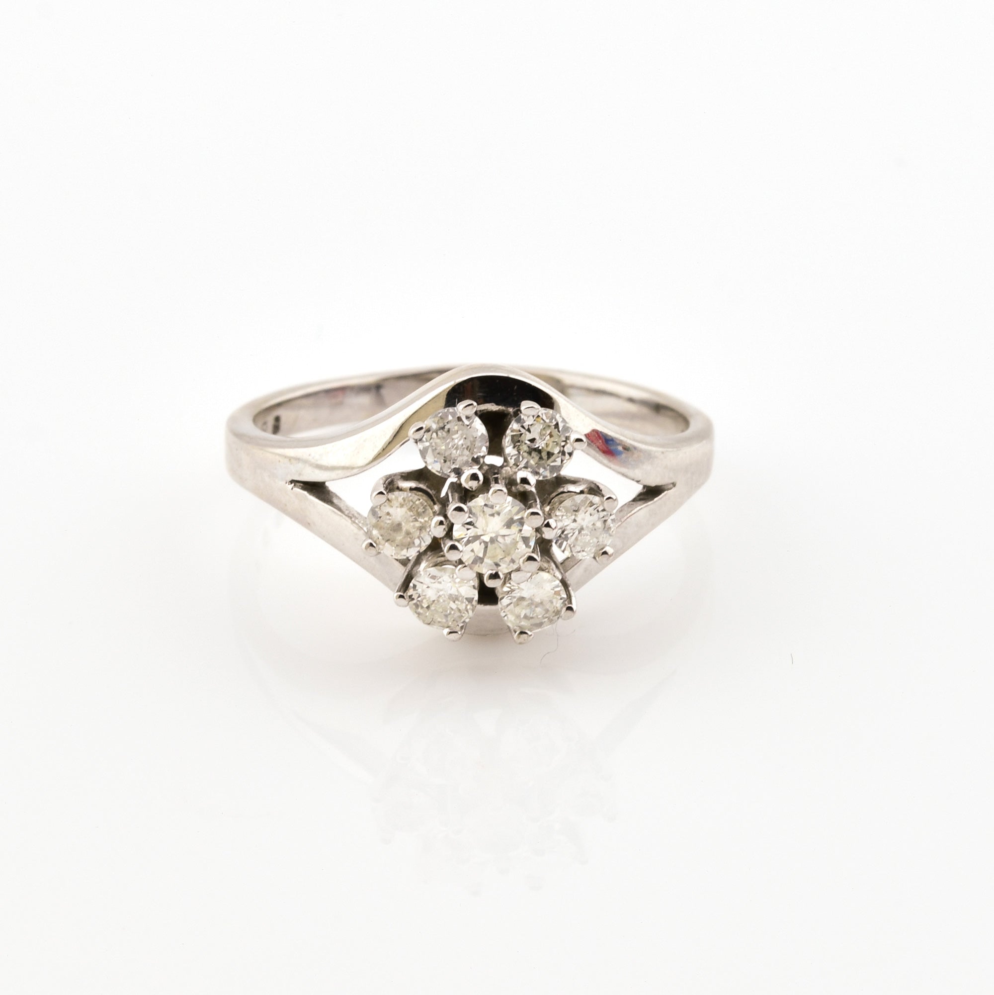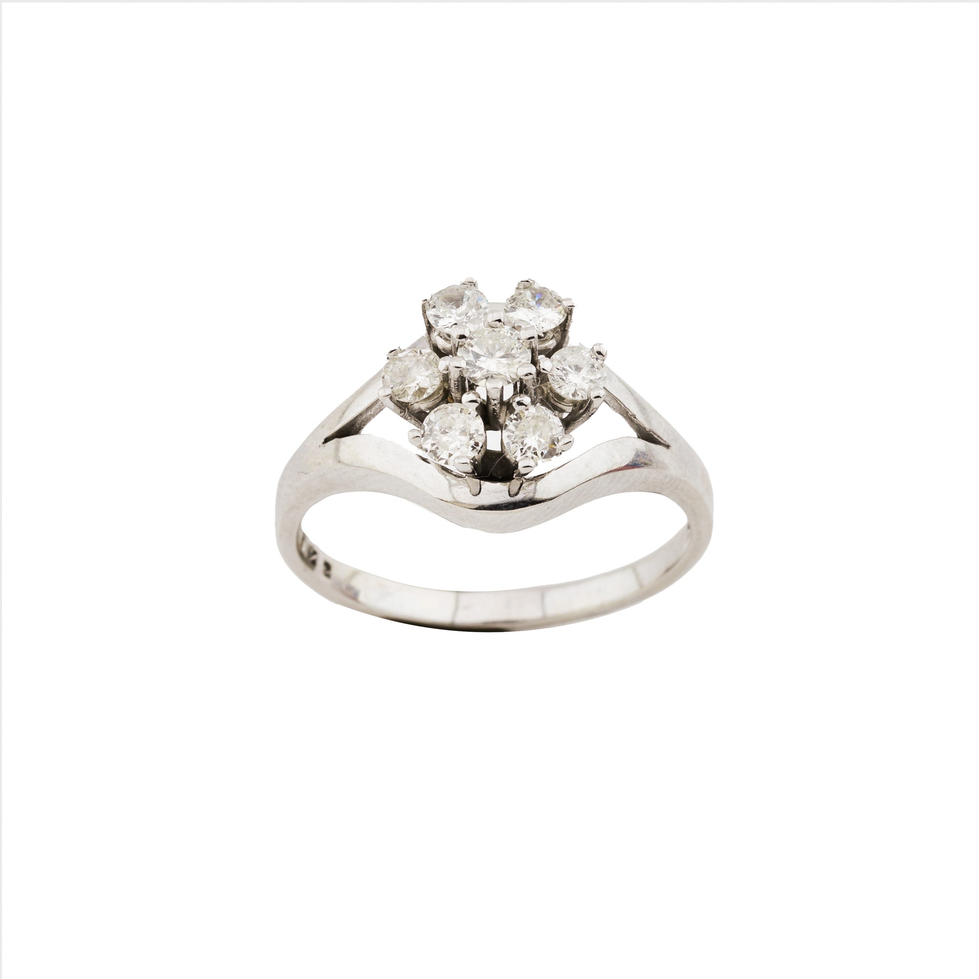 Bei dem Schmuckstück handelt es sich um einen Ring aus 585 Weißgold mit sieben Brillanten von zusammen ca. 0,49 ct in der Qualität leicht getöntes Weiß und piqué 2 (TCr/p 2).