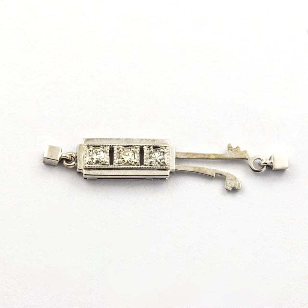 Bei dem Schmuckstück handelt es sich um eine Schließe aus 585 Weißgold mit drei Diamanten im 8/8 Schliff von zusammen ca. 0,09 ct in der Qualität Weiß mit kleinen Einschlüssen (W/si).
