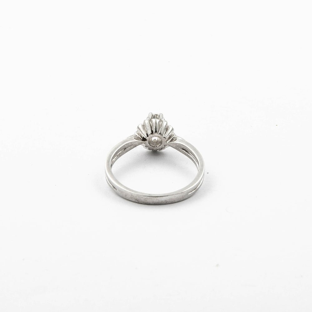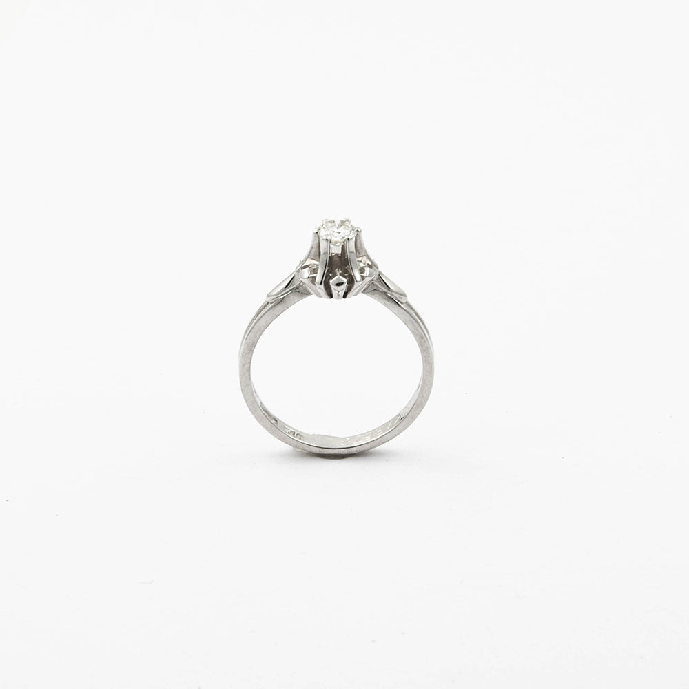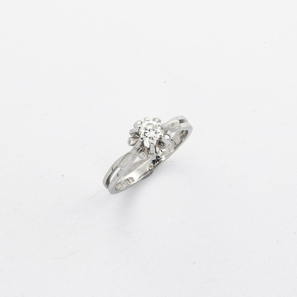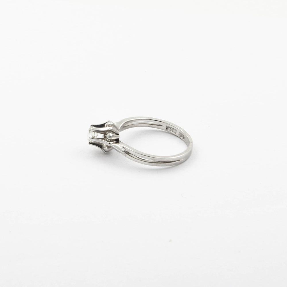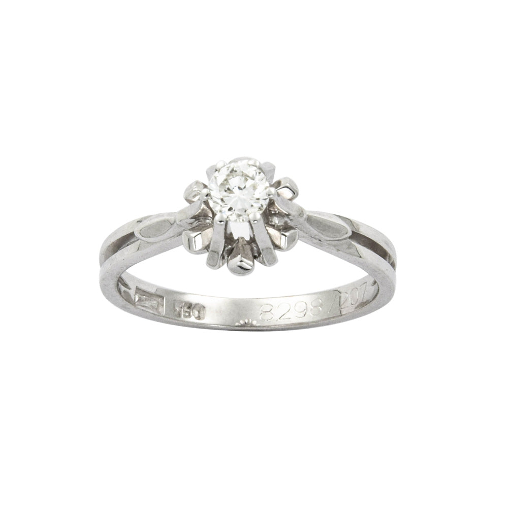 Bei dem Schmuckstück handelt es sich um einen Solitärring aus 750 Weißgold mit einem Brillanten von ca. 0,23 ct in der Qualität Weiß mit sehr kleinen Einschlüssen (W/vs).