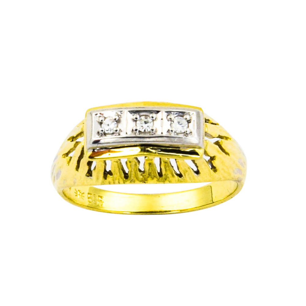 Bei dem Schmuckstück handelt es sich um einen Ring aus 585 Gelb- und Weißgold mit drei Diamanten im 8/8 Schliff von zusammen ca. 0,06 ct in der Qualität leicht getöntes Weiß mit kleinen Einschlüssen (TCr/si).