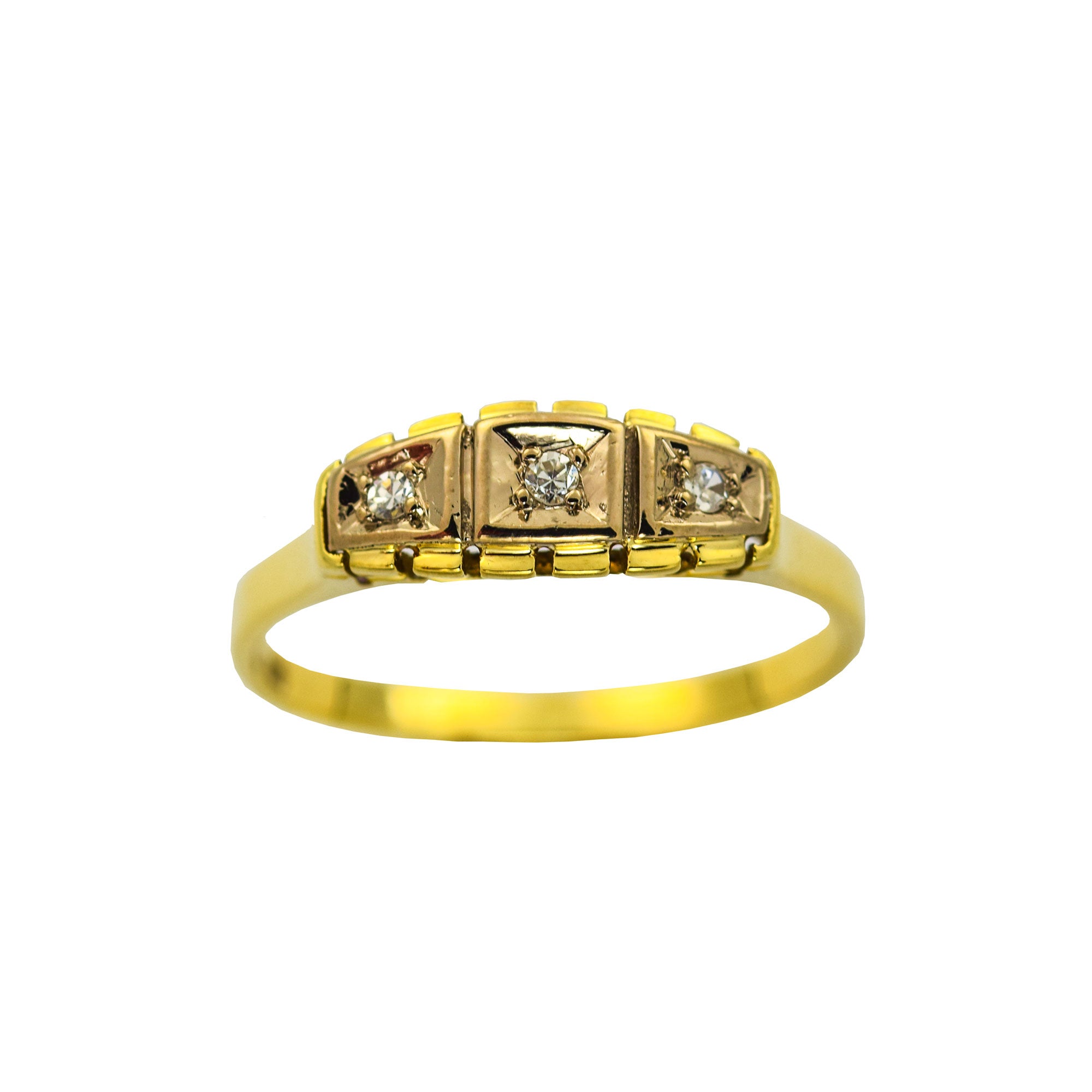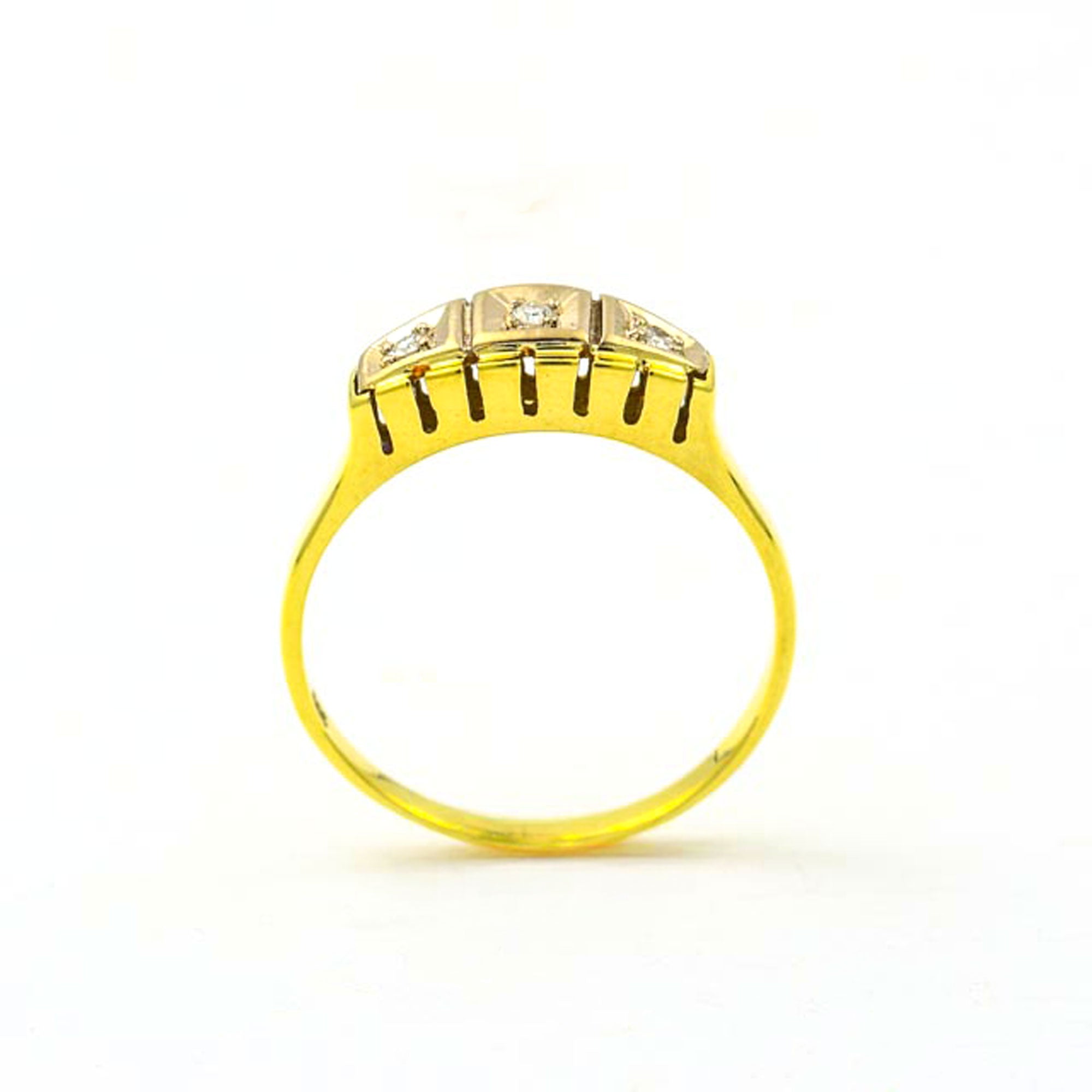 Bei dem Schmuckstück handelt es sich um einen Ring aus 585 Gelbgold mit drei Diamanten im 8/8 Schliff von zusammen ca. 0,06 ct in der Qualität Weiß mit kleinen Einschlüssen (W/si).
