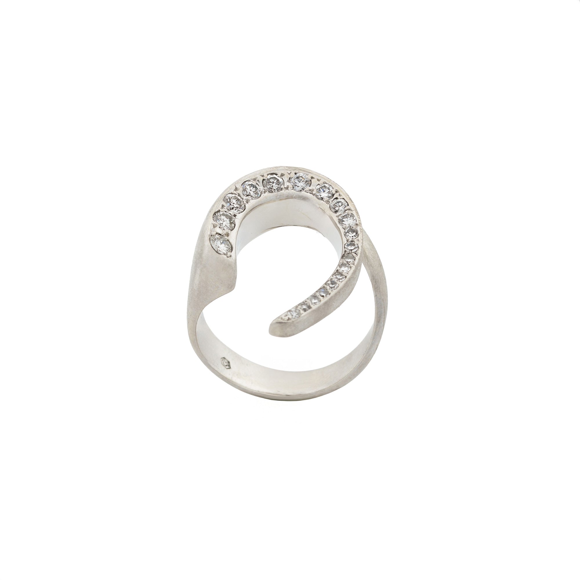 Bei dem Schmuckstück handelt es sich um einen Ring der Marke Victor Mayer aus 750 Weißgold mit neun Brillanten von zusammen ca. 0,34 ct in der Qualität feines Weiß mit sehr kleinen Einschlüssen (TW/vs) und zehn Diamanten von zusammen ca. 0,1 ct in der Qualität feines Weiß mit sehr kleinen Einschlüssen (TW/vs).