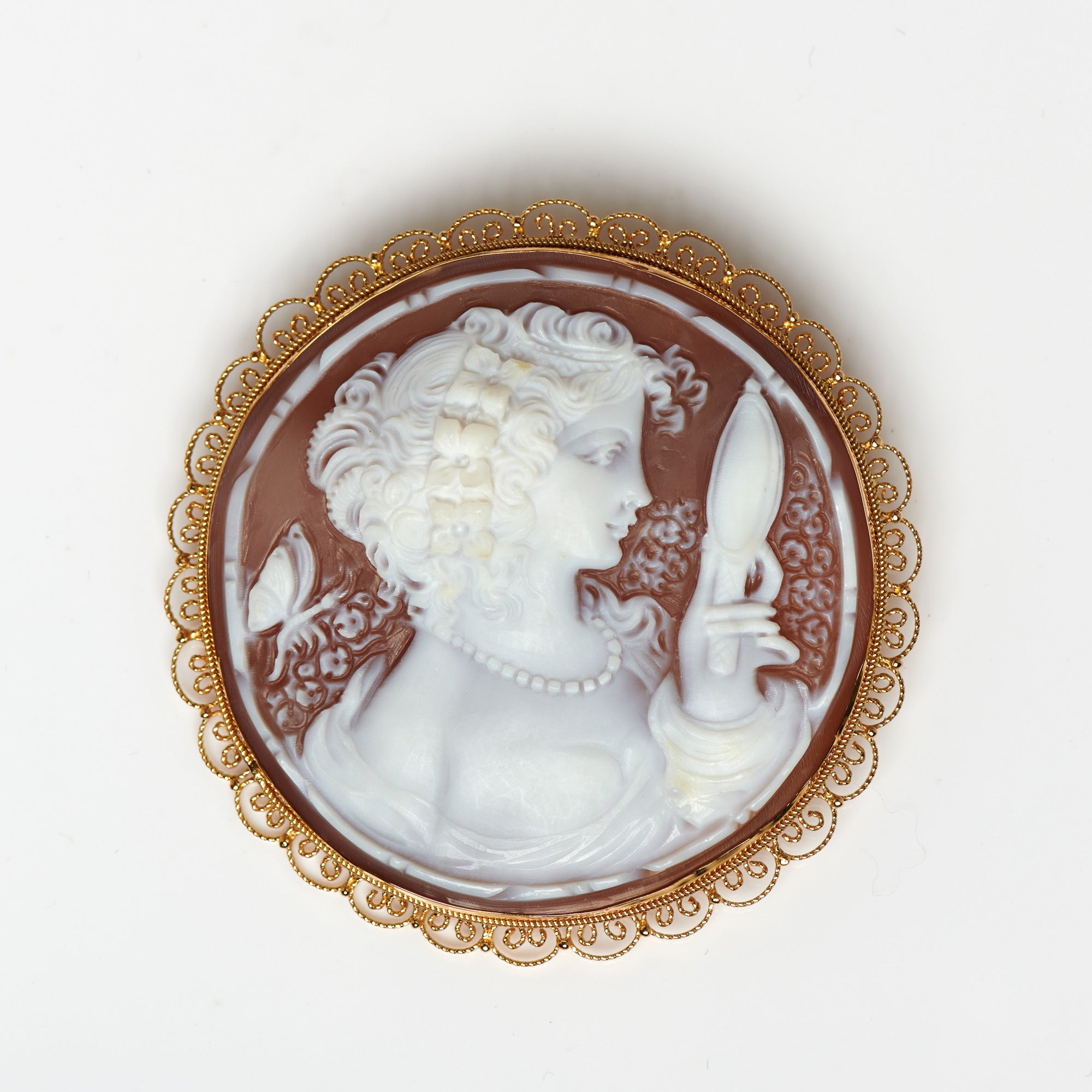 Bei dem Schmuckstück handelt es sich um einen Anhänger/Brosche aus 750 Gelbgold mit Muschelkamee.
