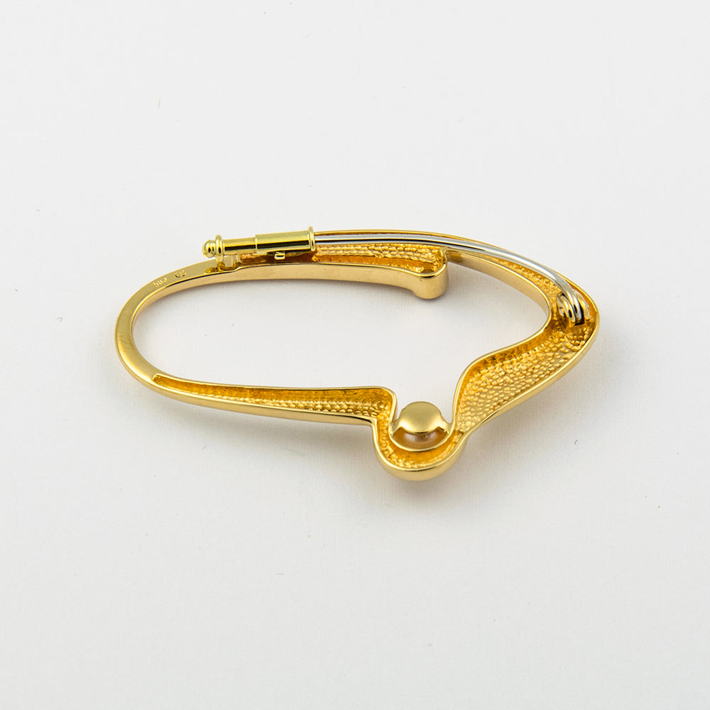 Bei dem Schmuckstück handelt es sich um eine Brosche aus 585 Gelbgold mit einer Zuchtperle und einem Brillanten von ca. 0,03 ct in der Qualität Weiß mit kleinen Einschlüssen (W/si).