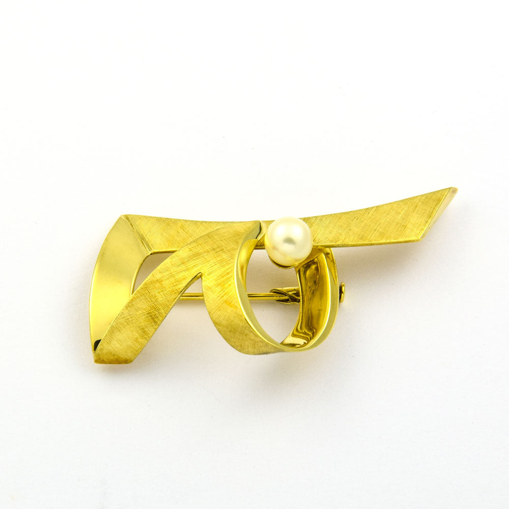Bei dem Schmuckstück handelt es sich um eine Brosche aus 585 Gelbgold mit einer Zuchtperle.
