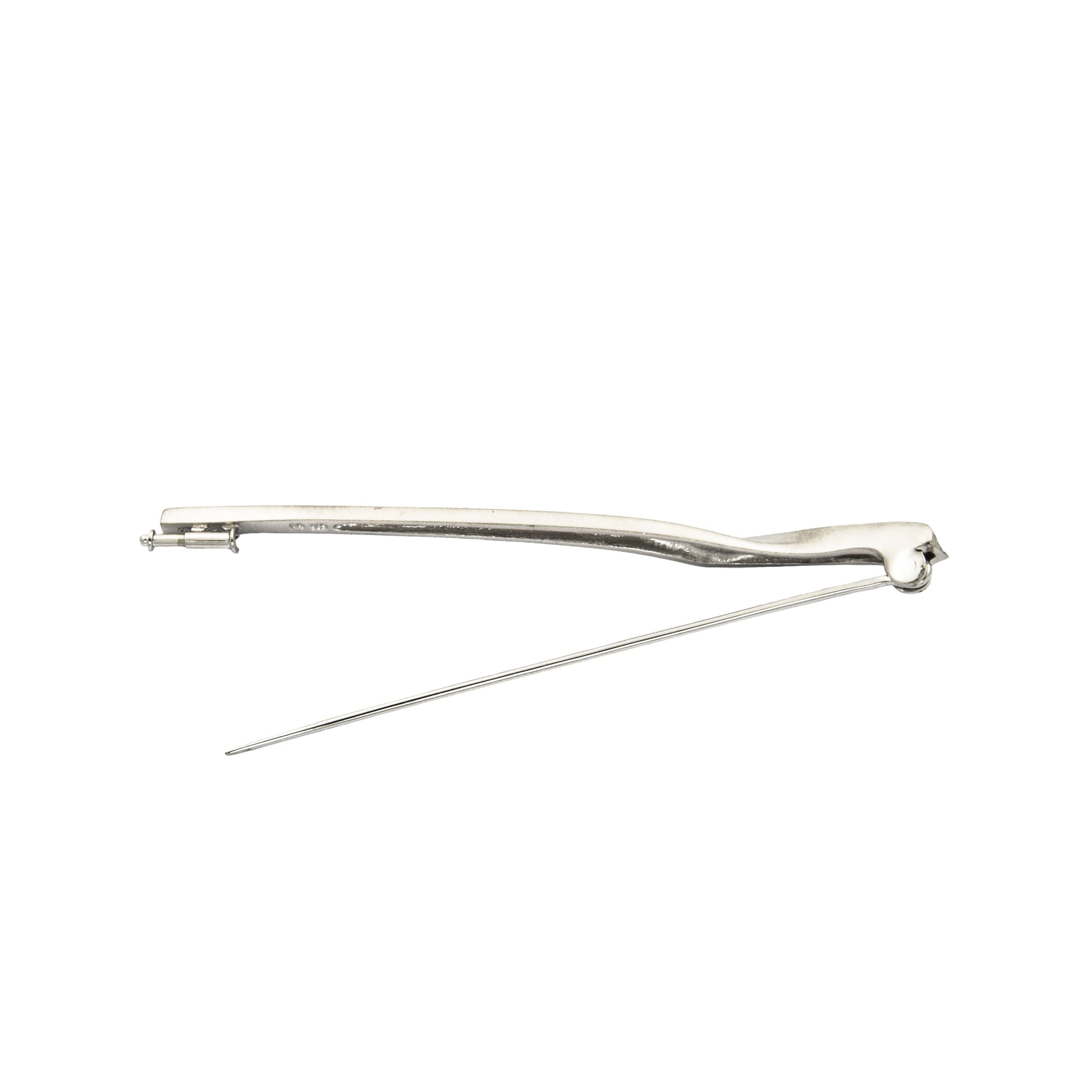 Bei dem Schmuckstück handelt es sich um eine Brosche aus 585 Weißgold mit neun Brillanten von zusammen ca. 0,2 ct in der Qualität Weiß mit kleinen Einschlüssen (W/si).