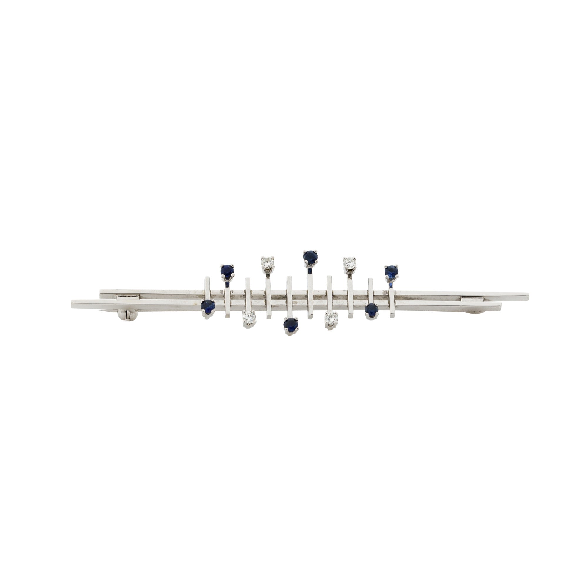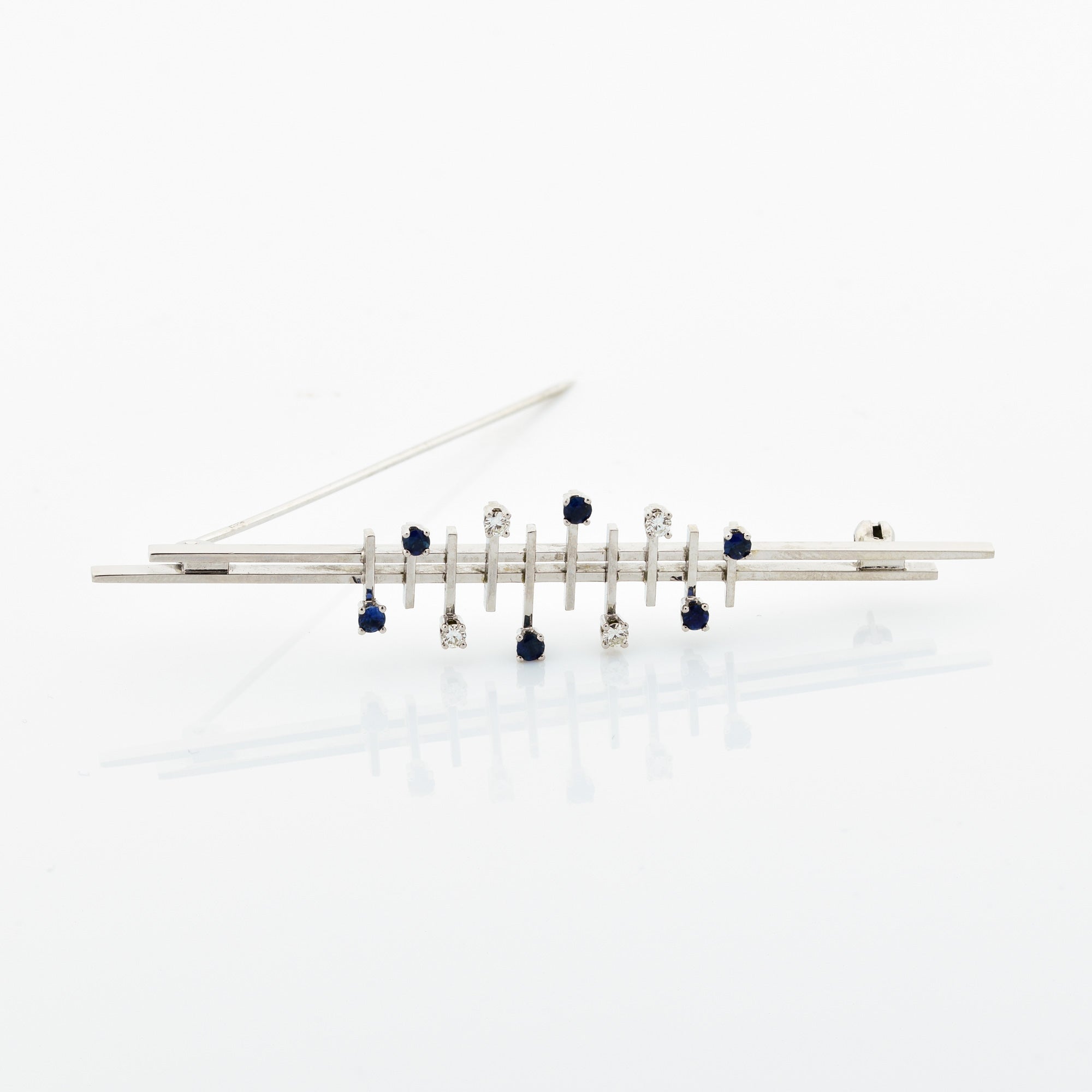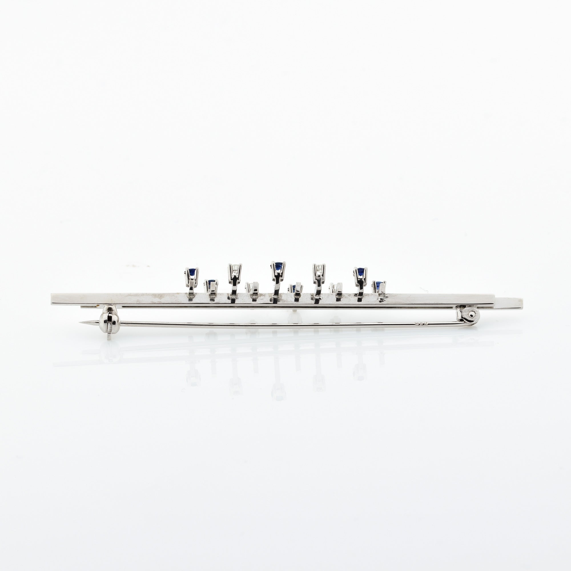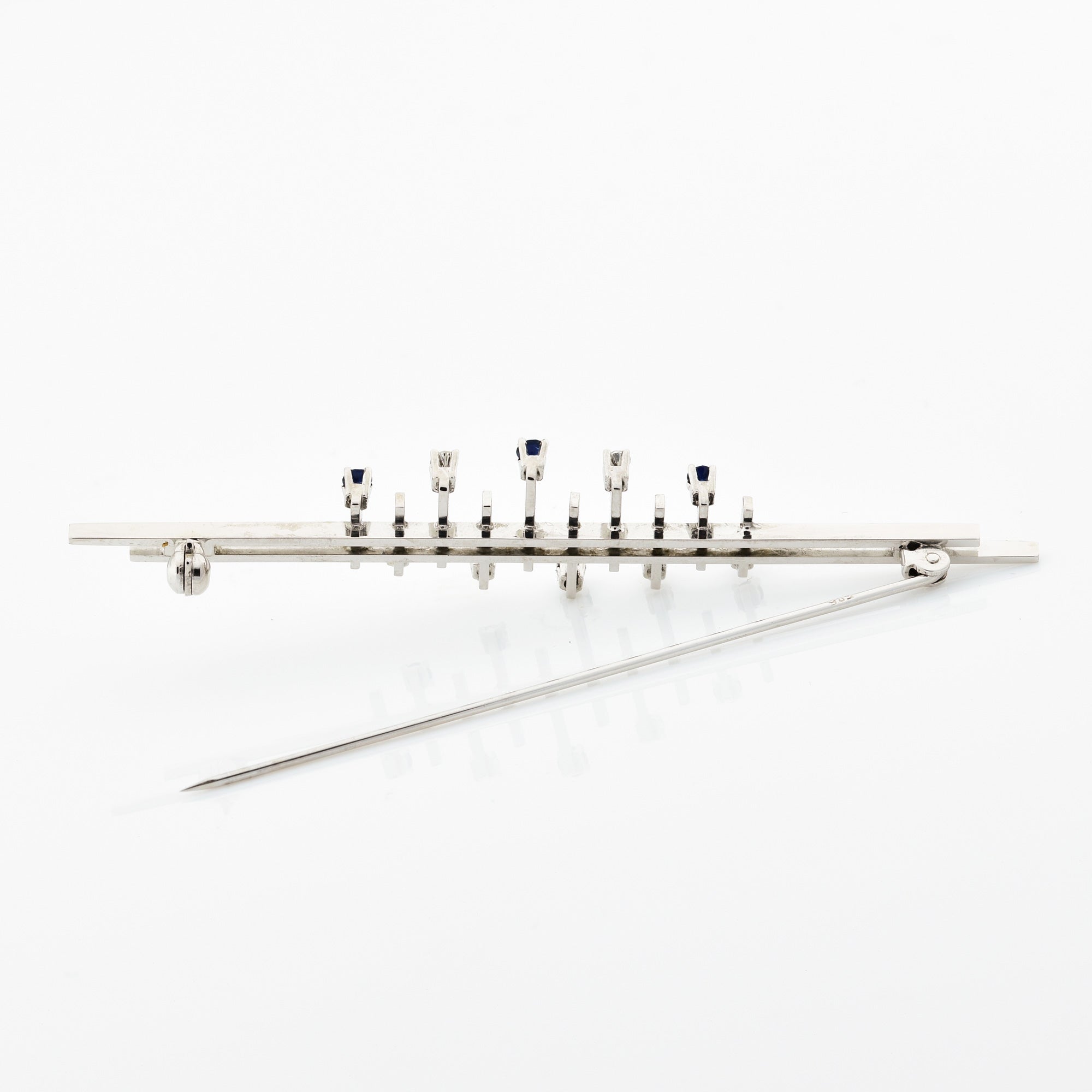 Bei dem Schmuckstück handelt es sich um eine Brosche aus 585 Weißgold mit sechs Saphiren und vier Brillanten von zusammen ca. 0,18 ct in der Qualität Weiß mit kleinen Einschlüssen (W/si).